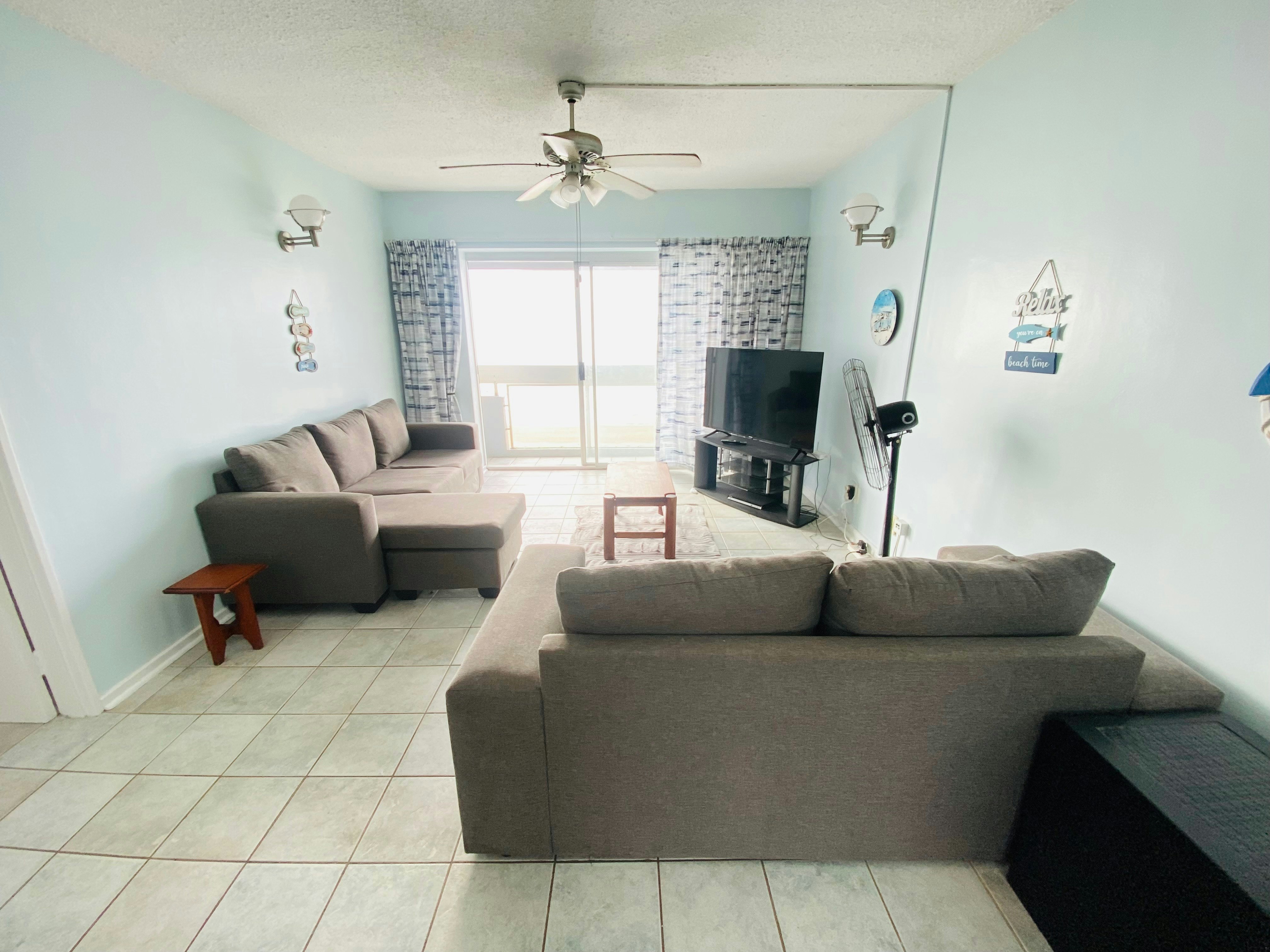 The living room is furnished with a child-only sleeper couch for 2, another comfortable couch and a TV. Access to Wi-Fi is available.