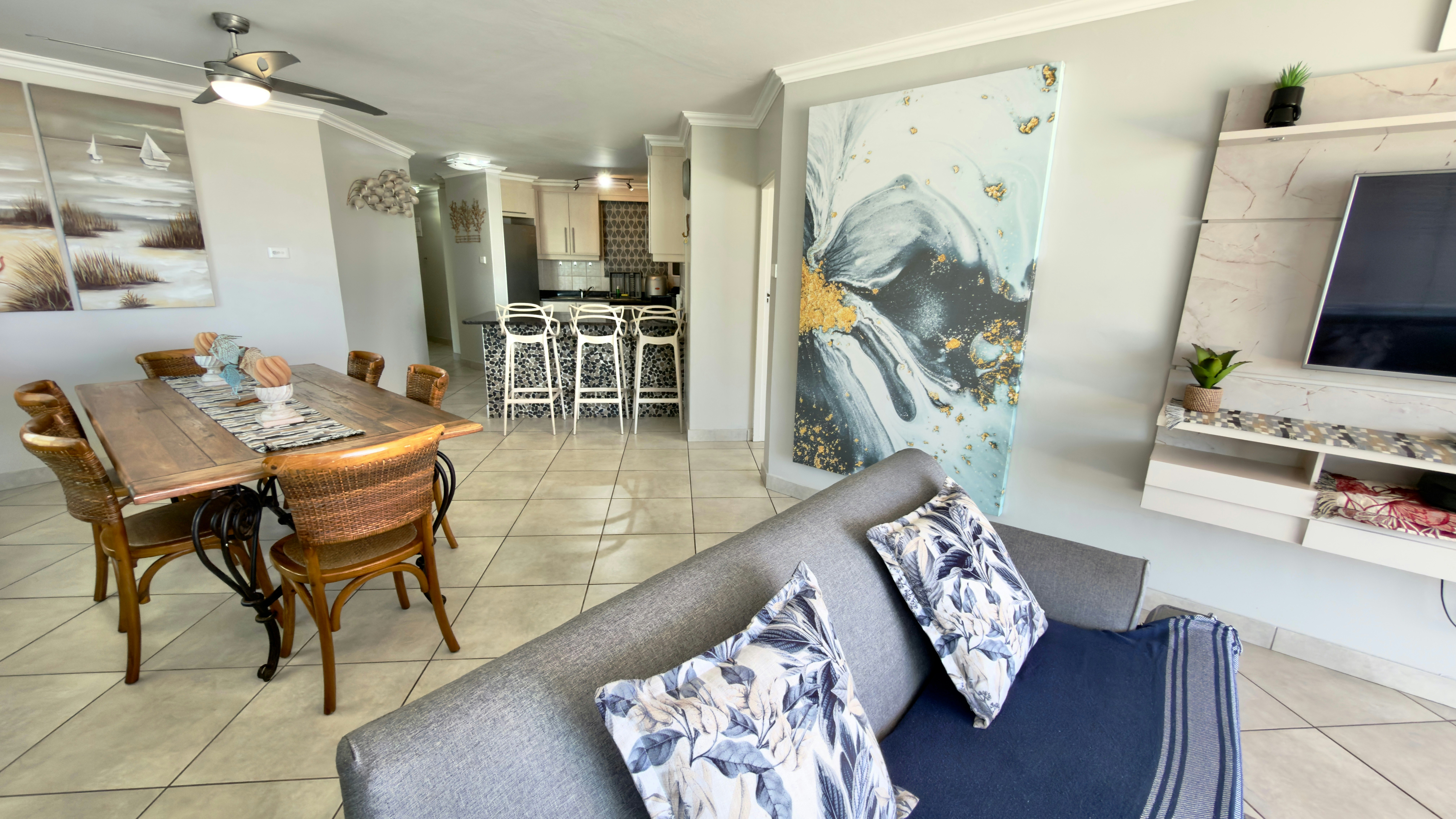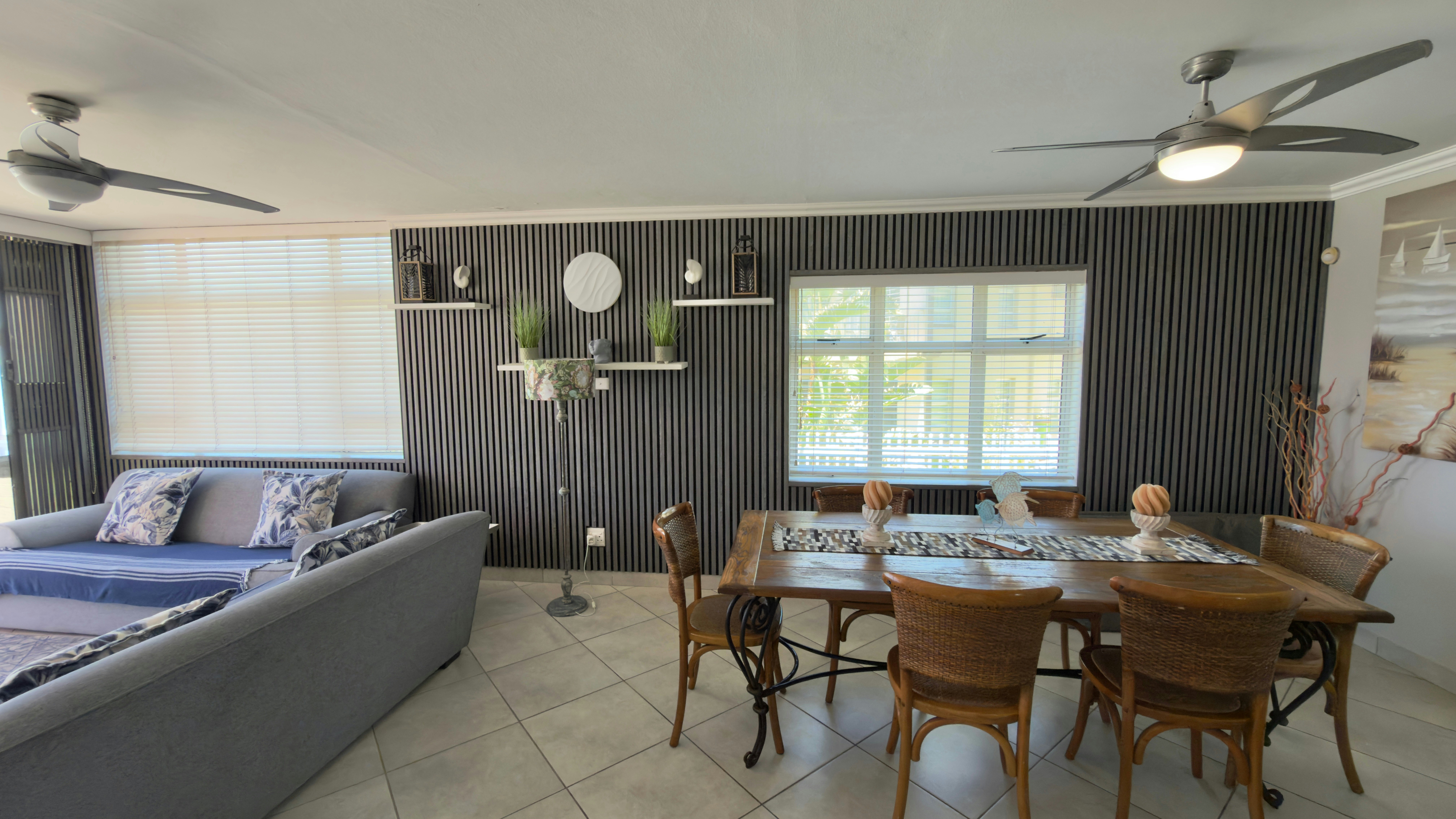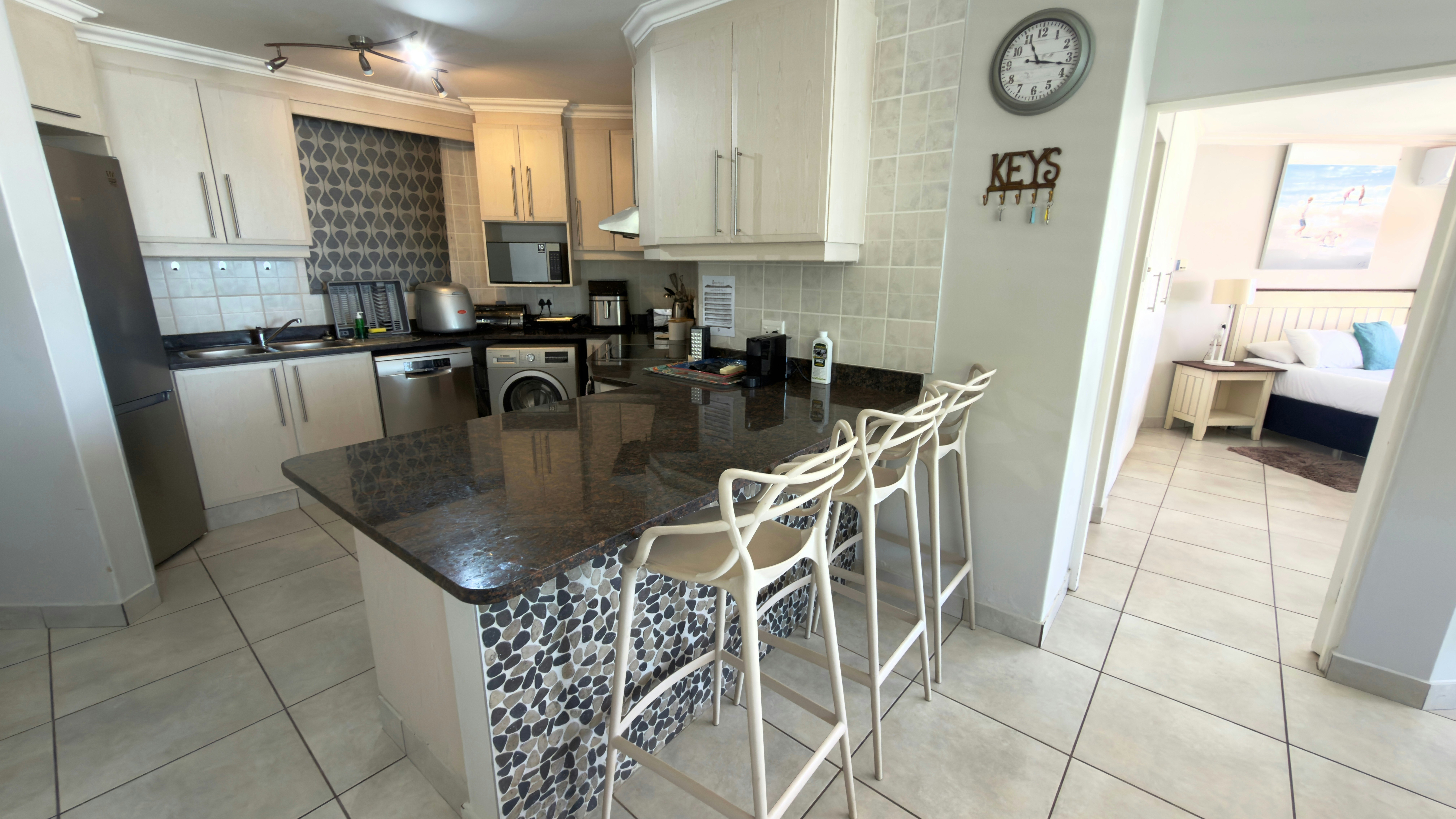 The top-of-the-line kitchen offers premium finishes and fixtures and is fitted with a fridge-freezer, stove and oven, microwave, a washing machine, and a breakfast bar with stools. The dining area contains a 6-seater dining table and chairs and a ceiling fan. The lounge offers ample comfortable seating, and a ceiling fan.