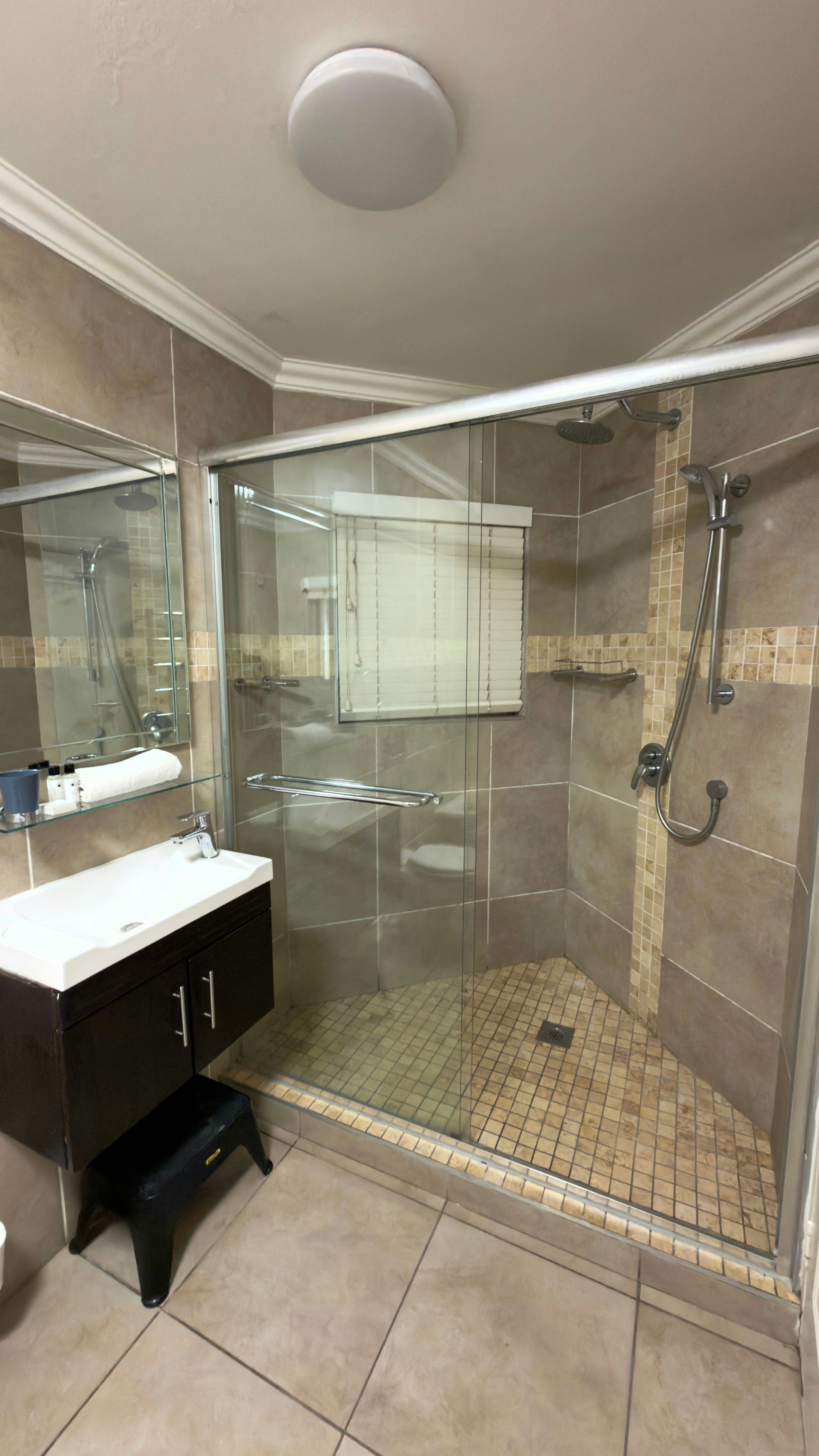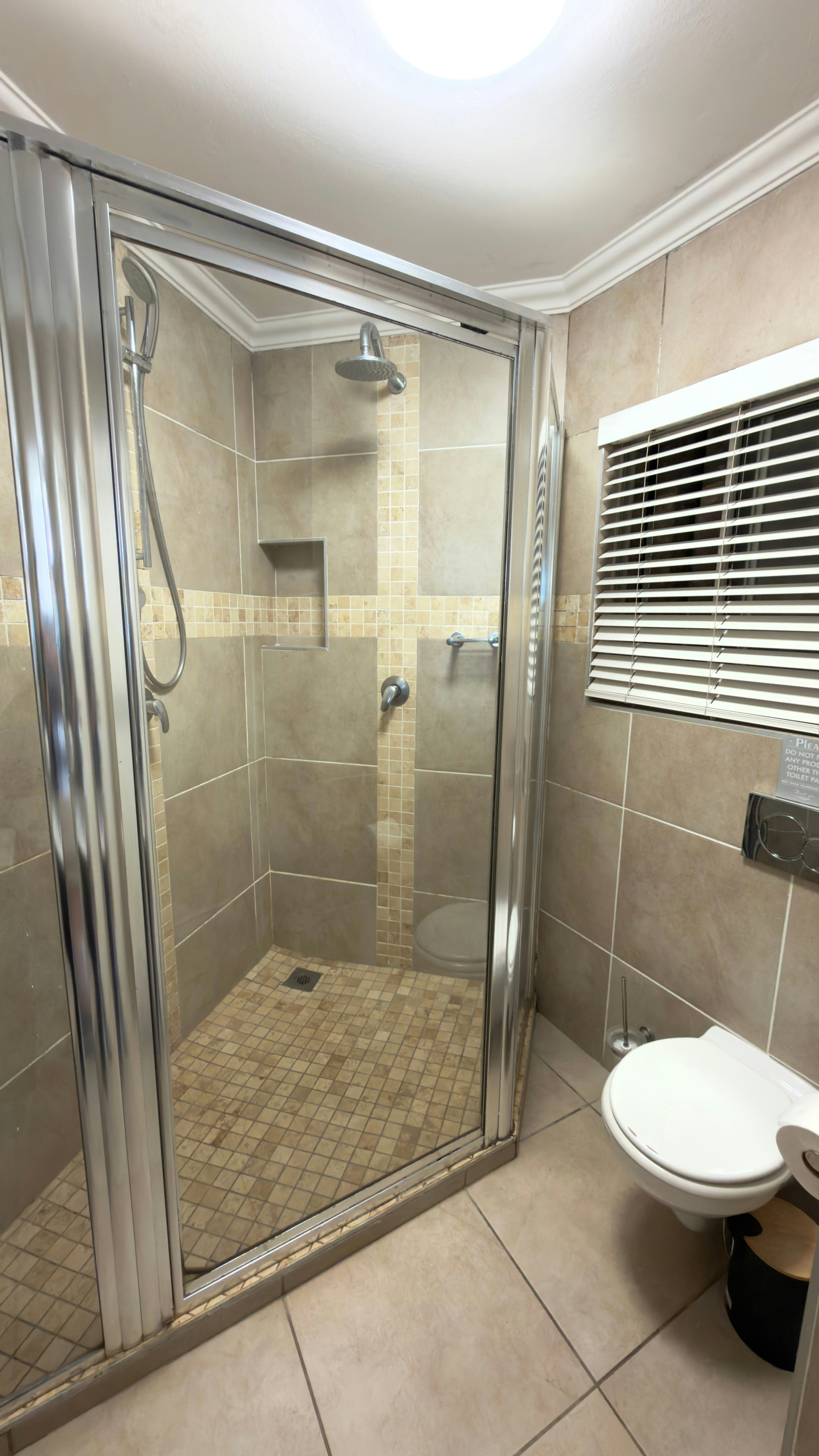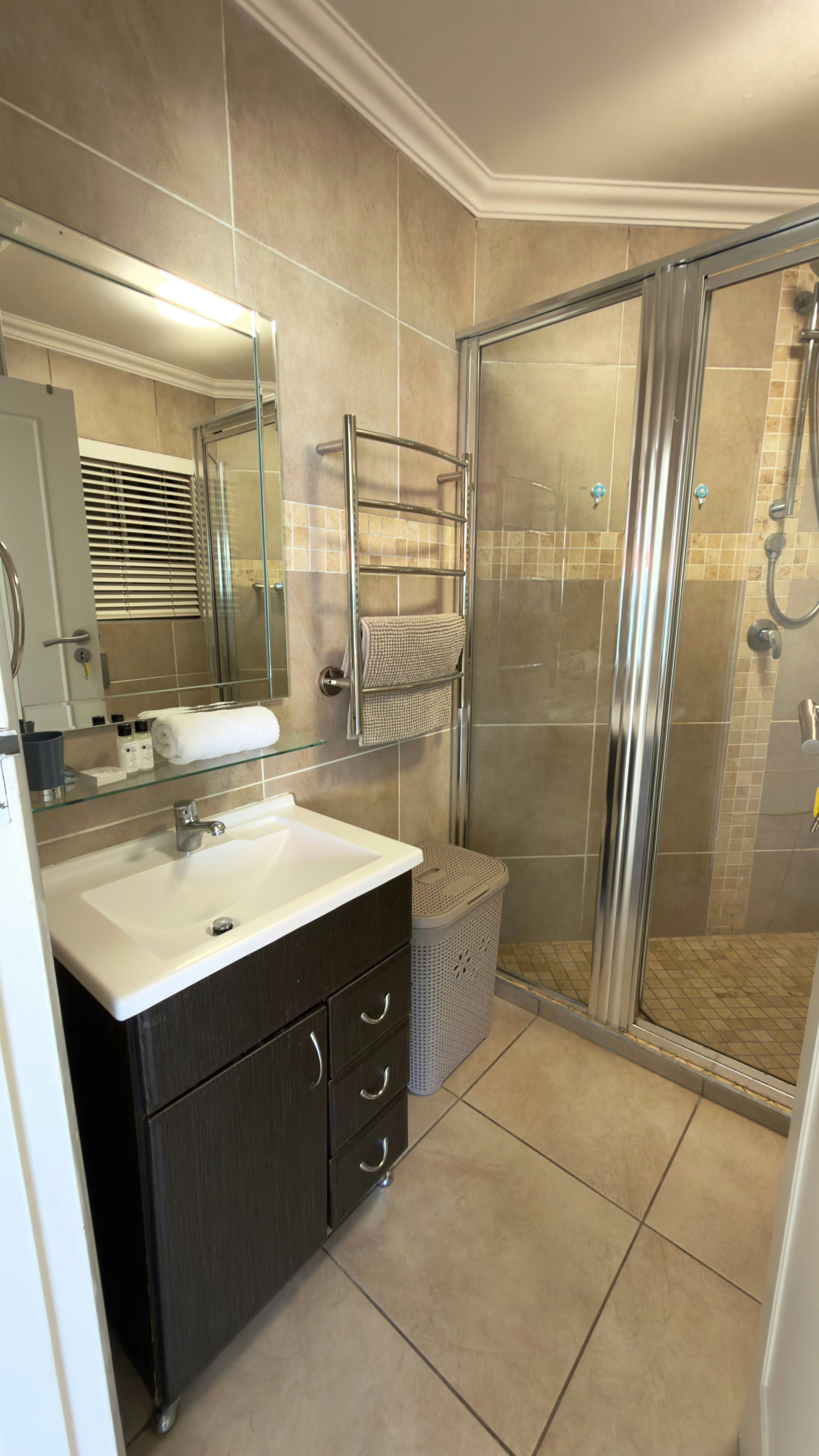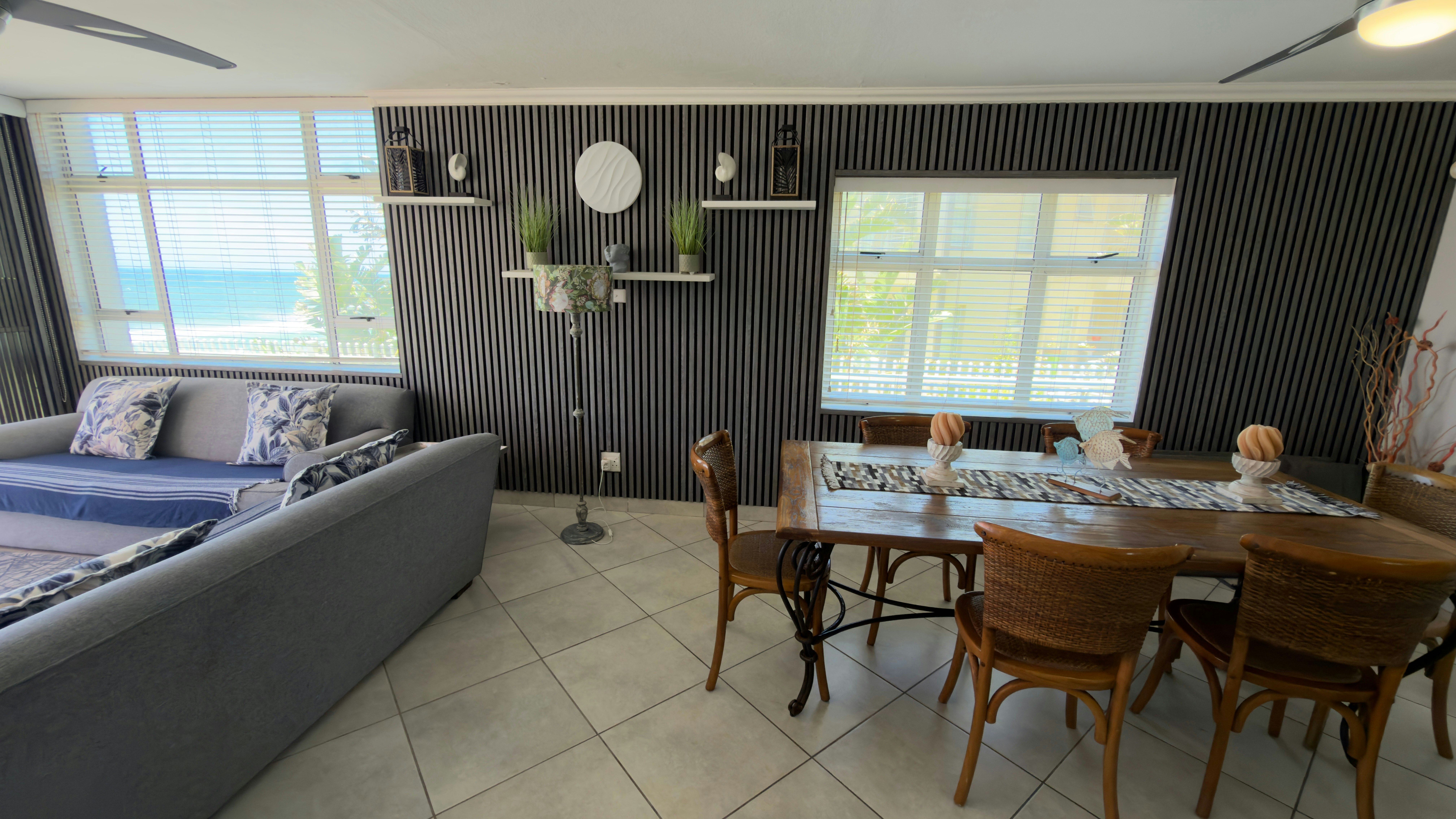 The top-of-the-line kitchen offers premium finishes and fixtures and is fitted with a fridge-freezer, stove and oven, microwave, a washing machine, and a breakfast bar with stools. The dining area contains a 6-seater dining table and chairs and a ceiling fan. The lounge offers ample comfortable seating, and a ceiling fan.
