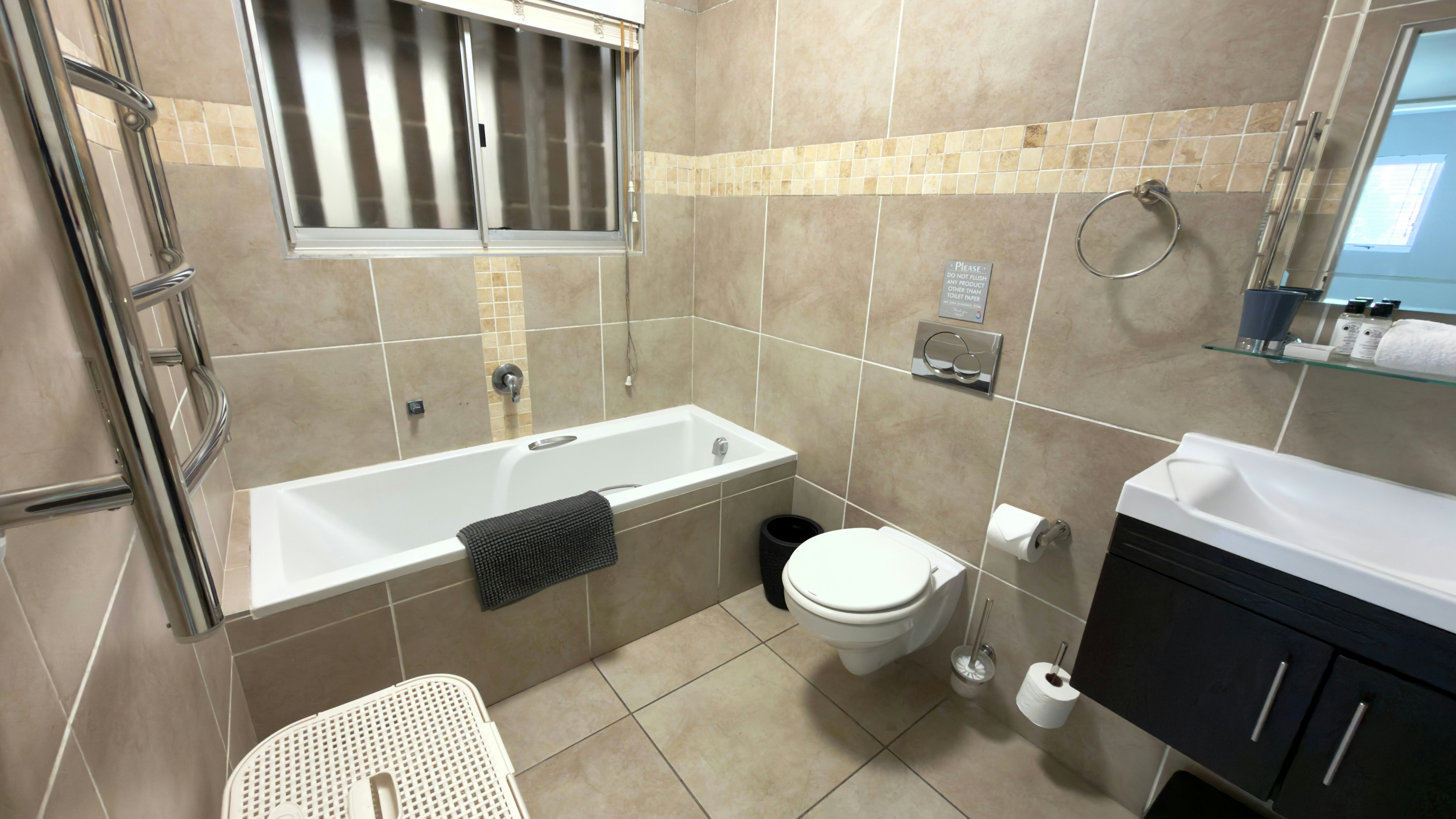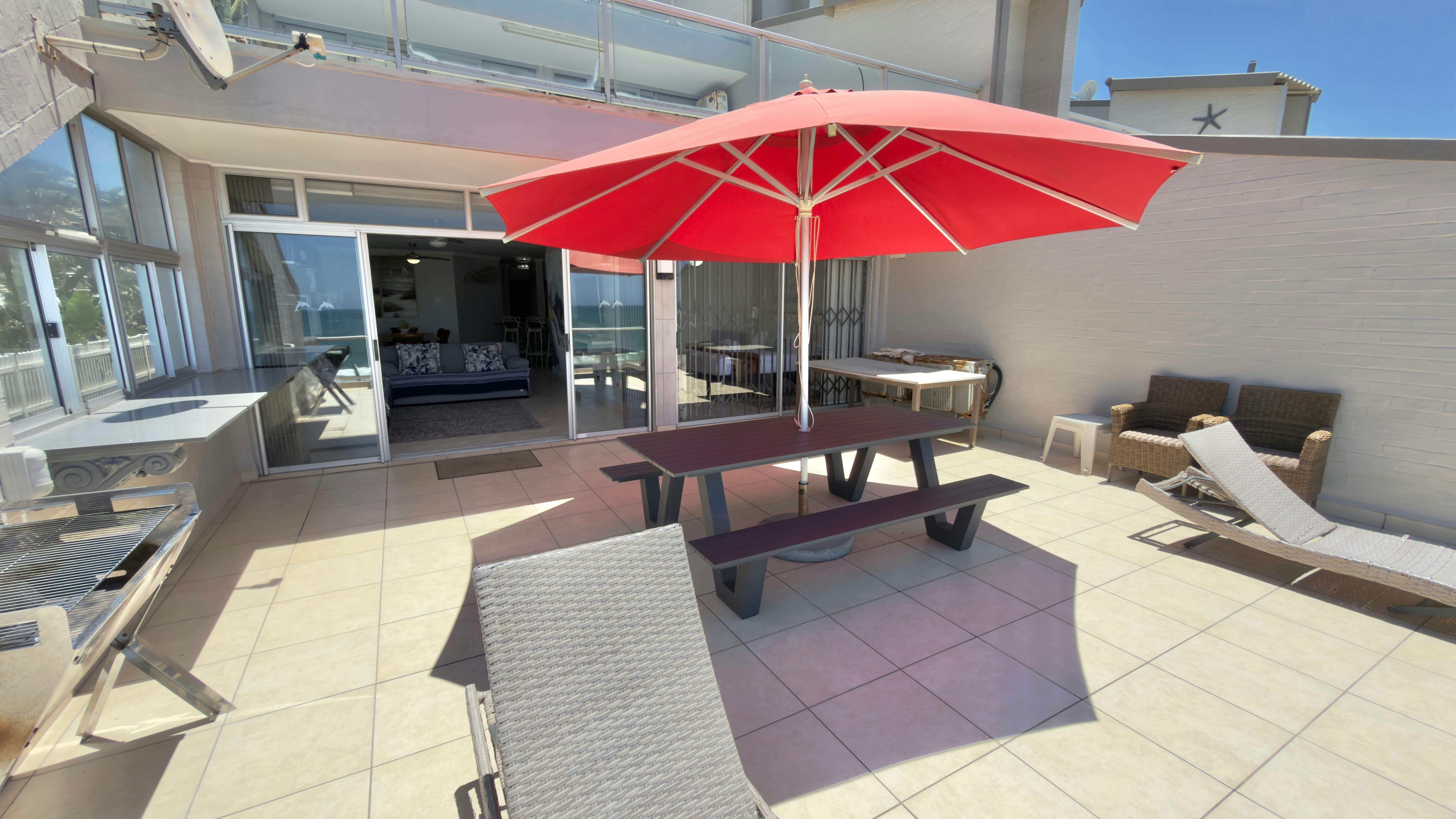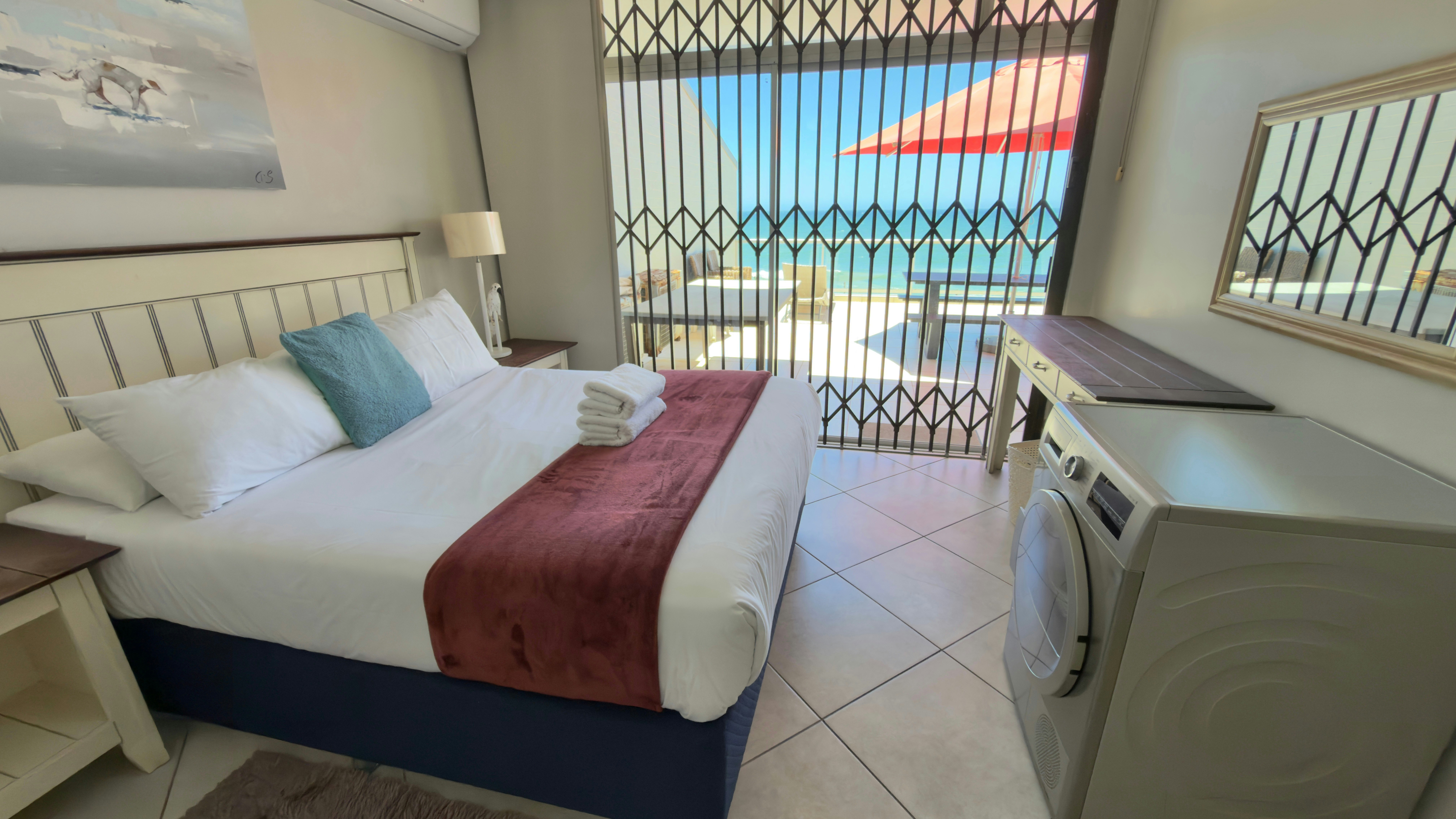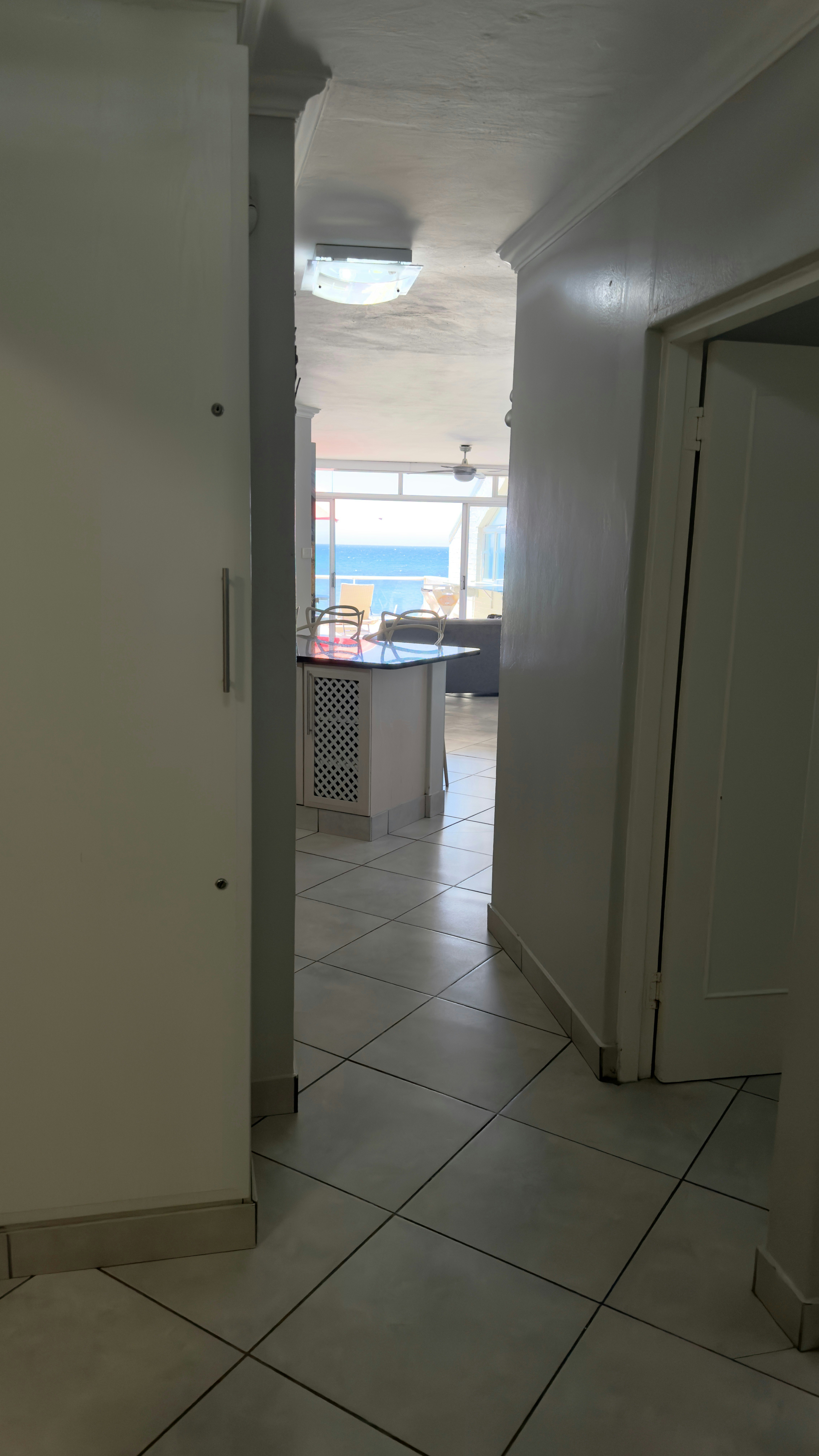 This ocean-facing apartment can accommodate up to 6 guests and comprises 3 spacious bedrooms, 2 bathrooms, and an open-plan kitchen, dining and living area. The master bedroom is air-conditioned and has a ceiling fan, and contains a queen-size, and a shower en suite with a toilet and washbasin. This room has sea views and a sliding door opening to the balcony. The second bedroom contains a queen-size bed, and the third bedroom contains a double bed. Both of these bedrooms have ceiling fans. These 2 rooms share a bathroom with a bath and a shower, a toilet and a washbasin.