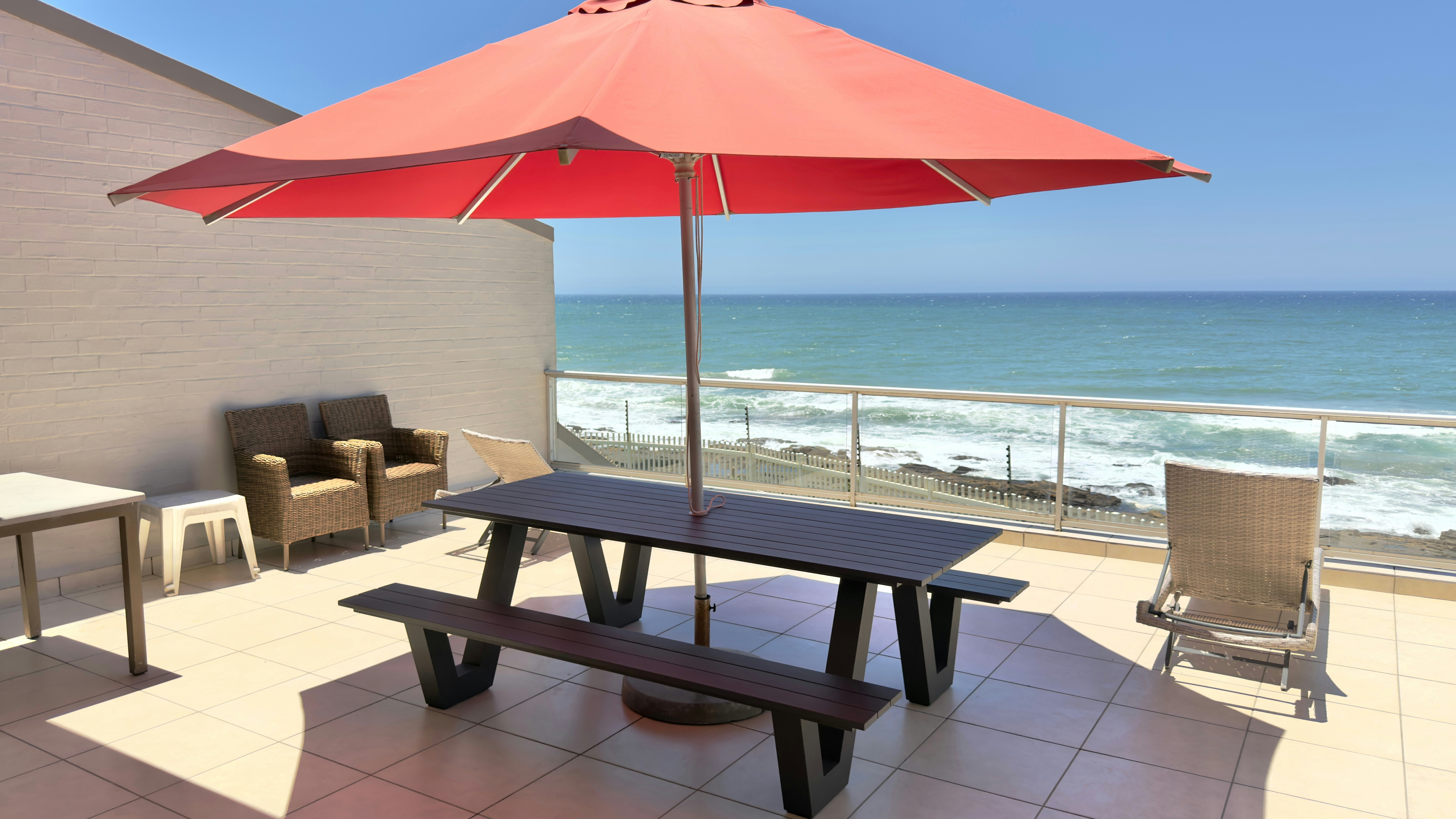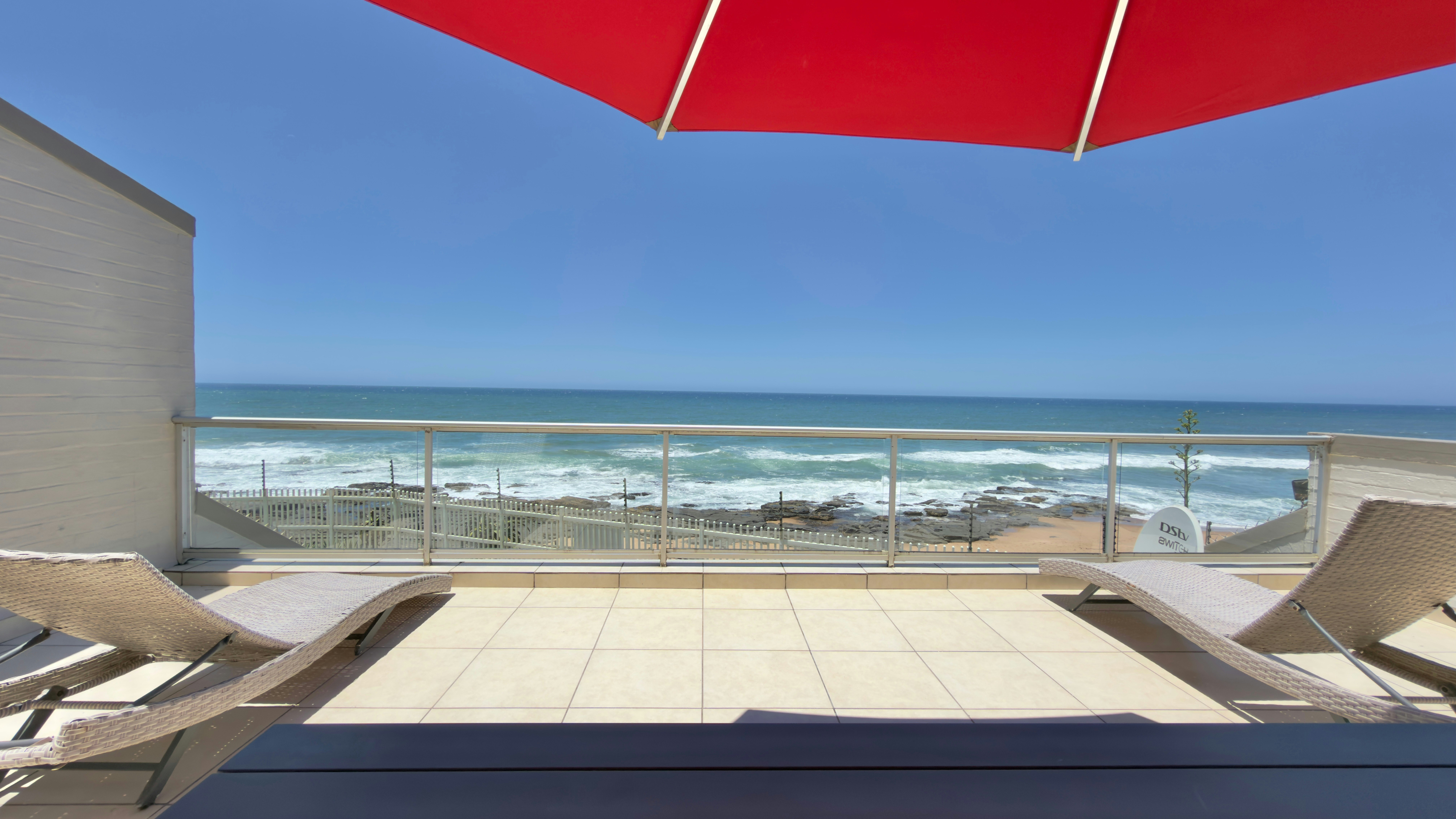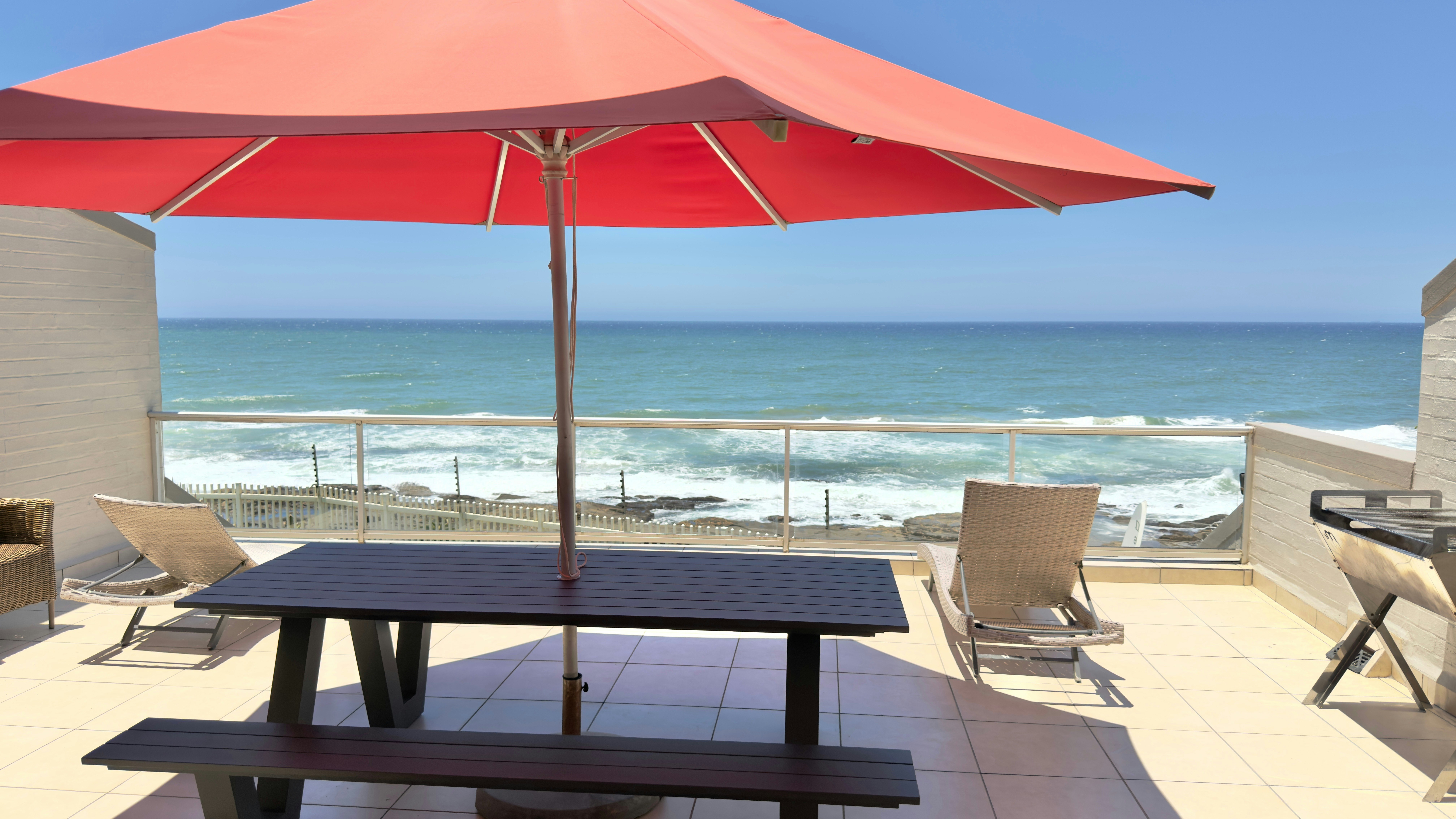 The living area flows seamlessly onto an expansive balcony with outdoor dining furniture, 2 sun loungers and a gas and charcoal braai, where one can entertain and relax all year round.