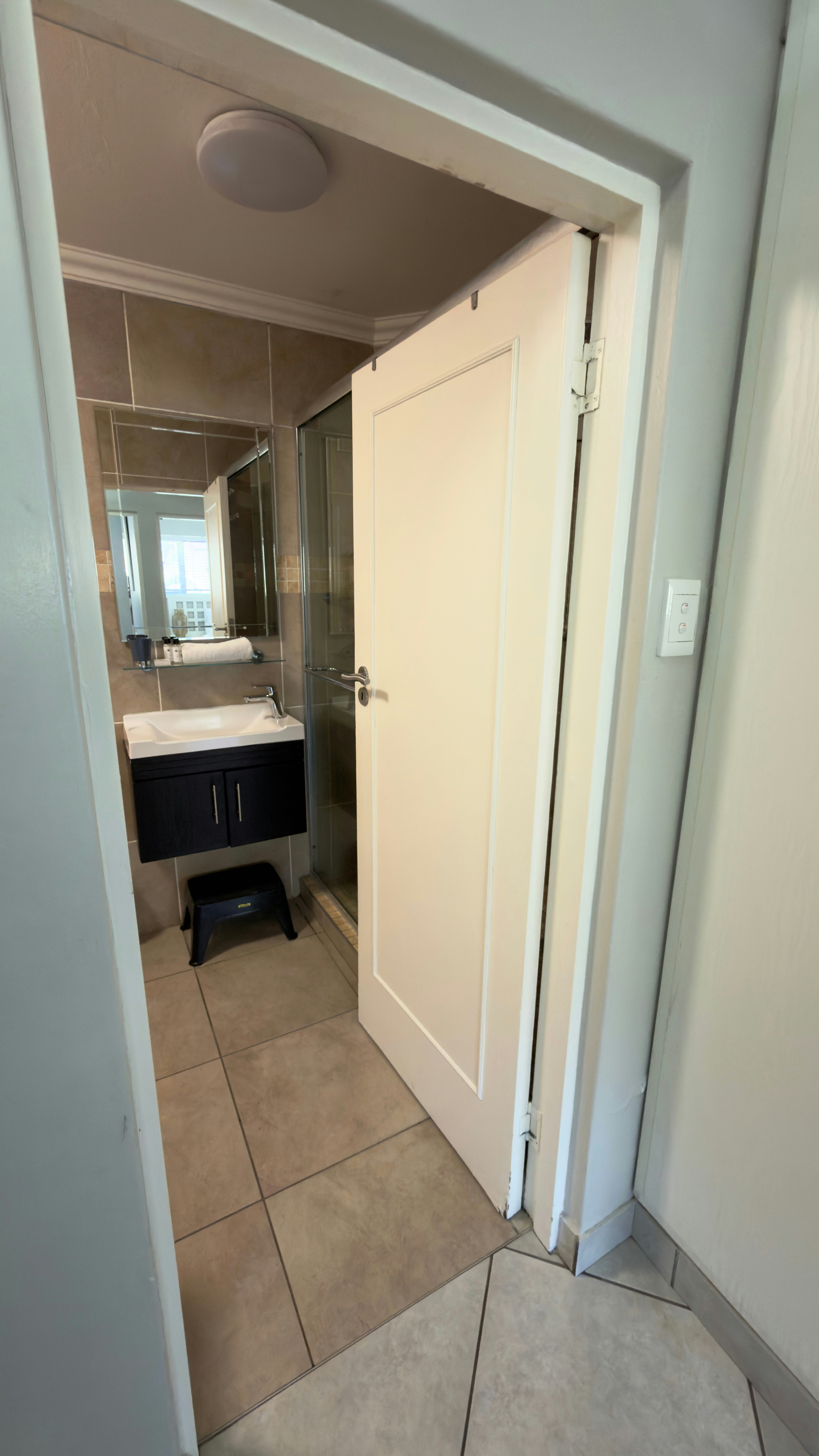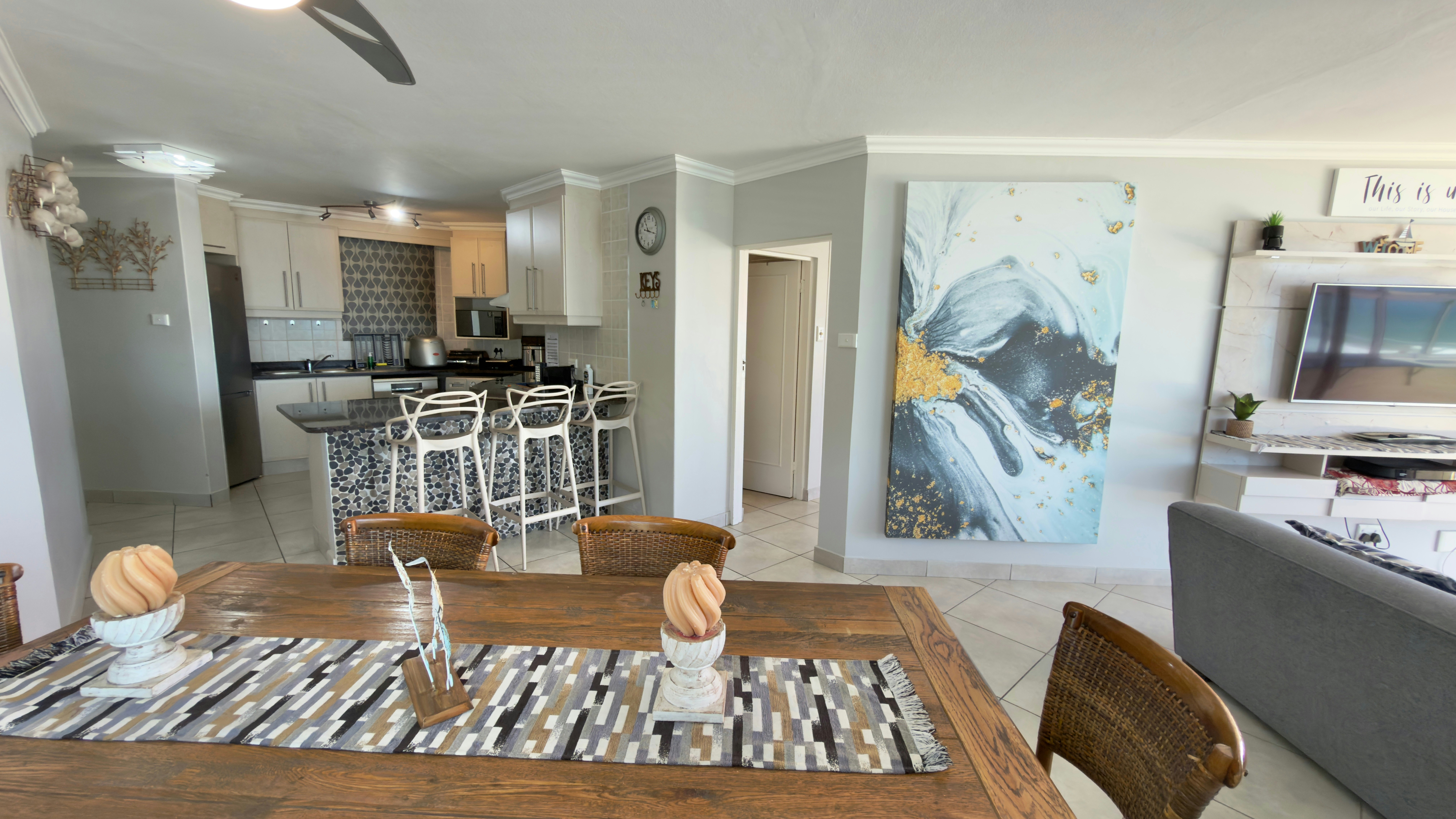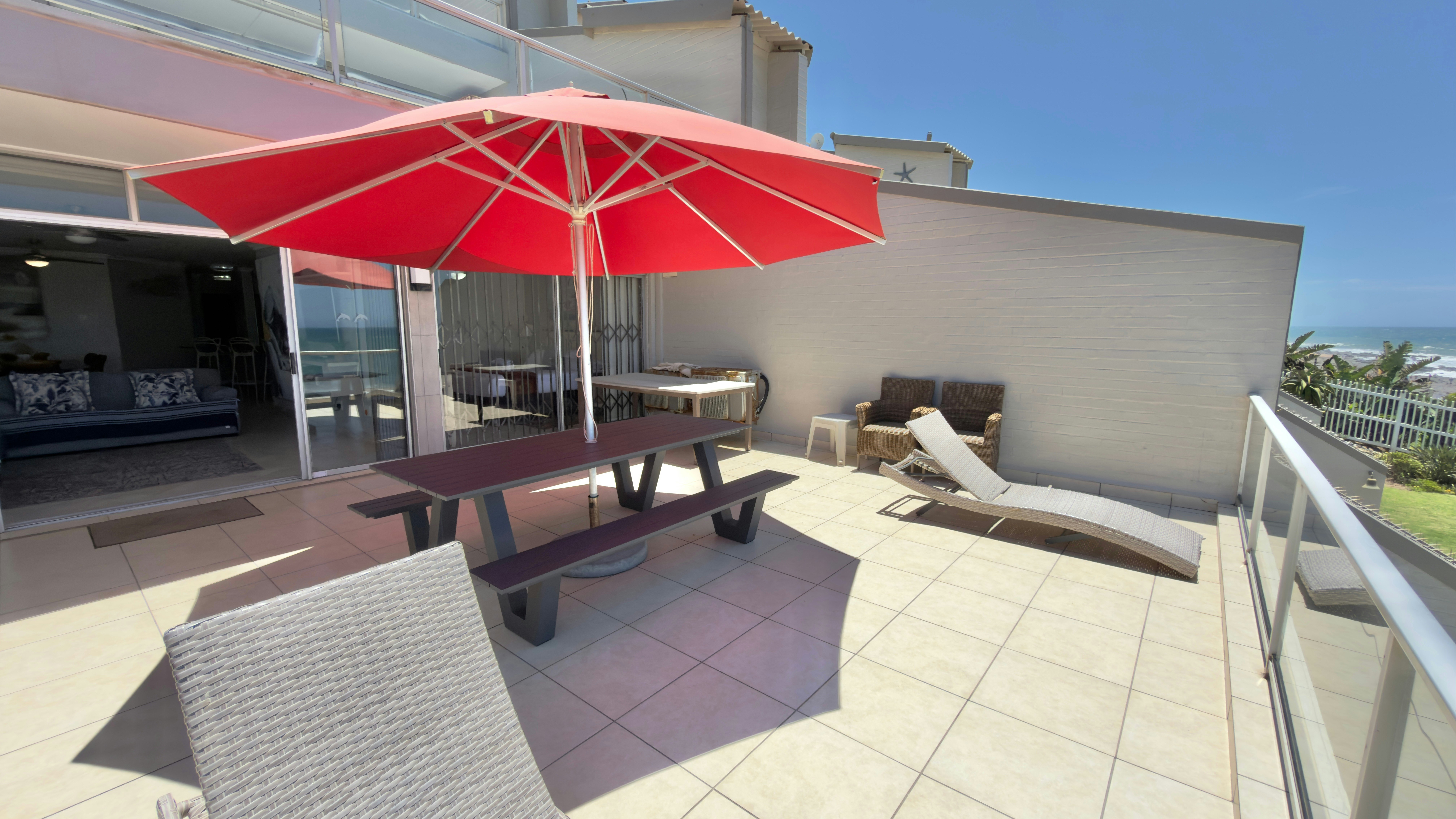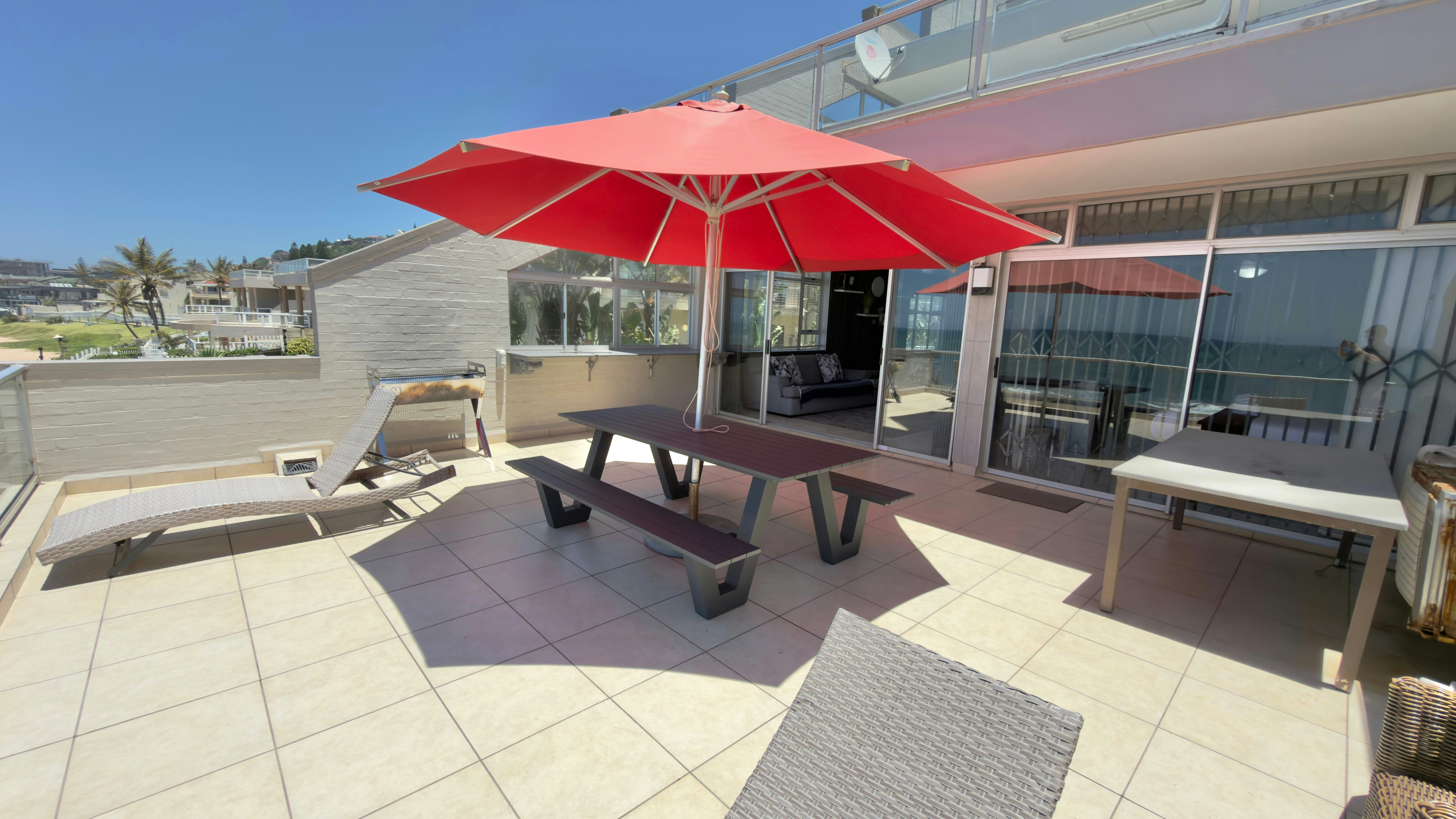 The living area flows seamlessly onto an expansive balcony with outdoor dining furniture, 2 sun loungers and a gas and charcoal braai, where one can entertain and relax all year round.