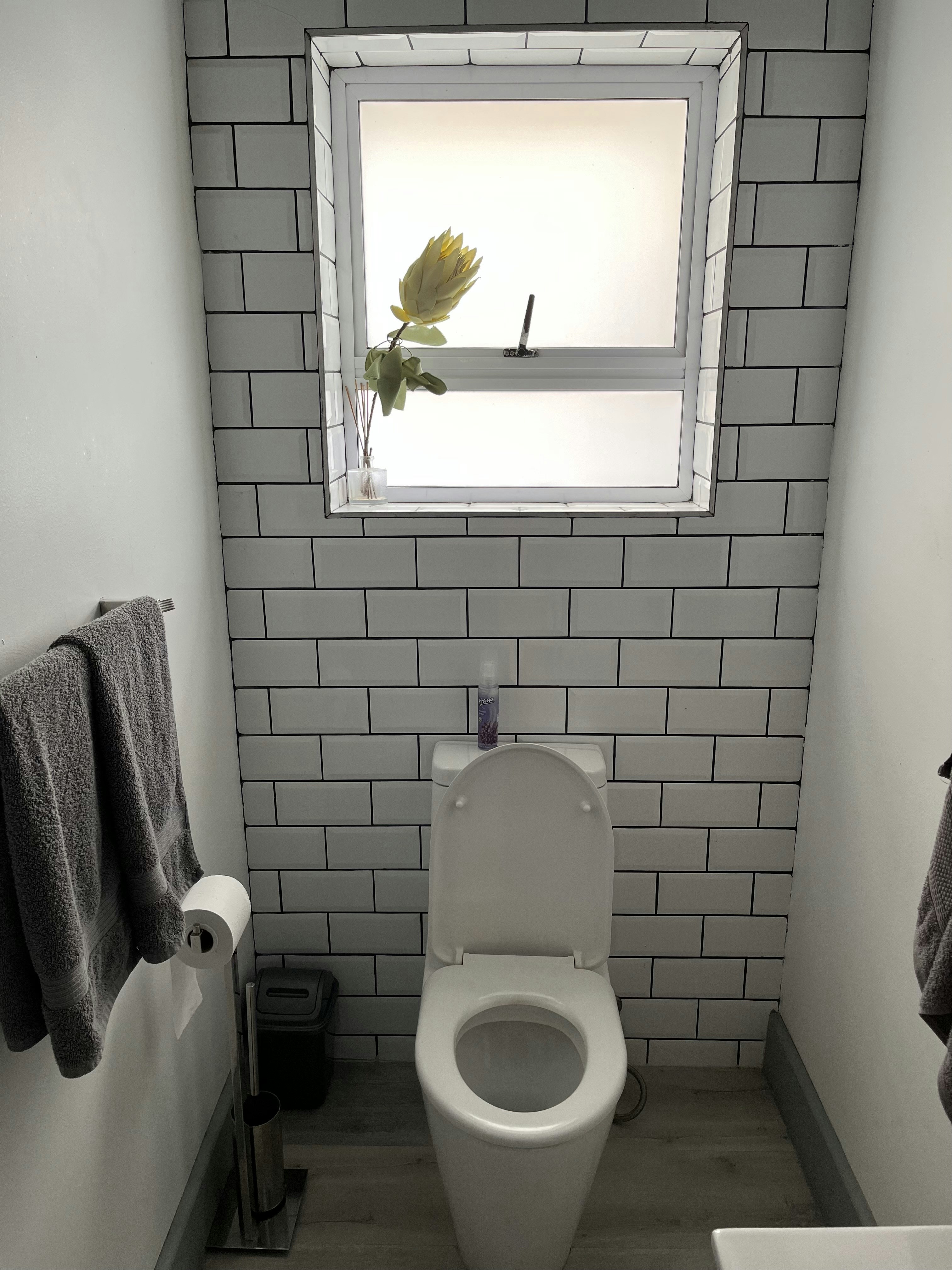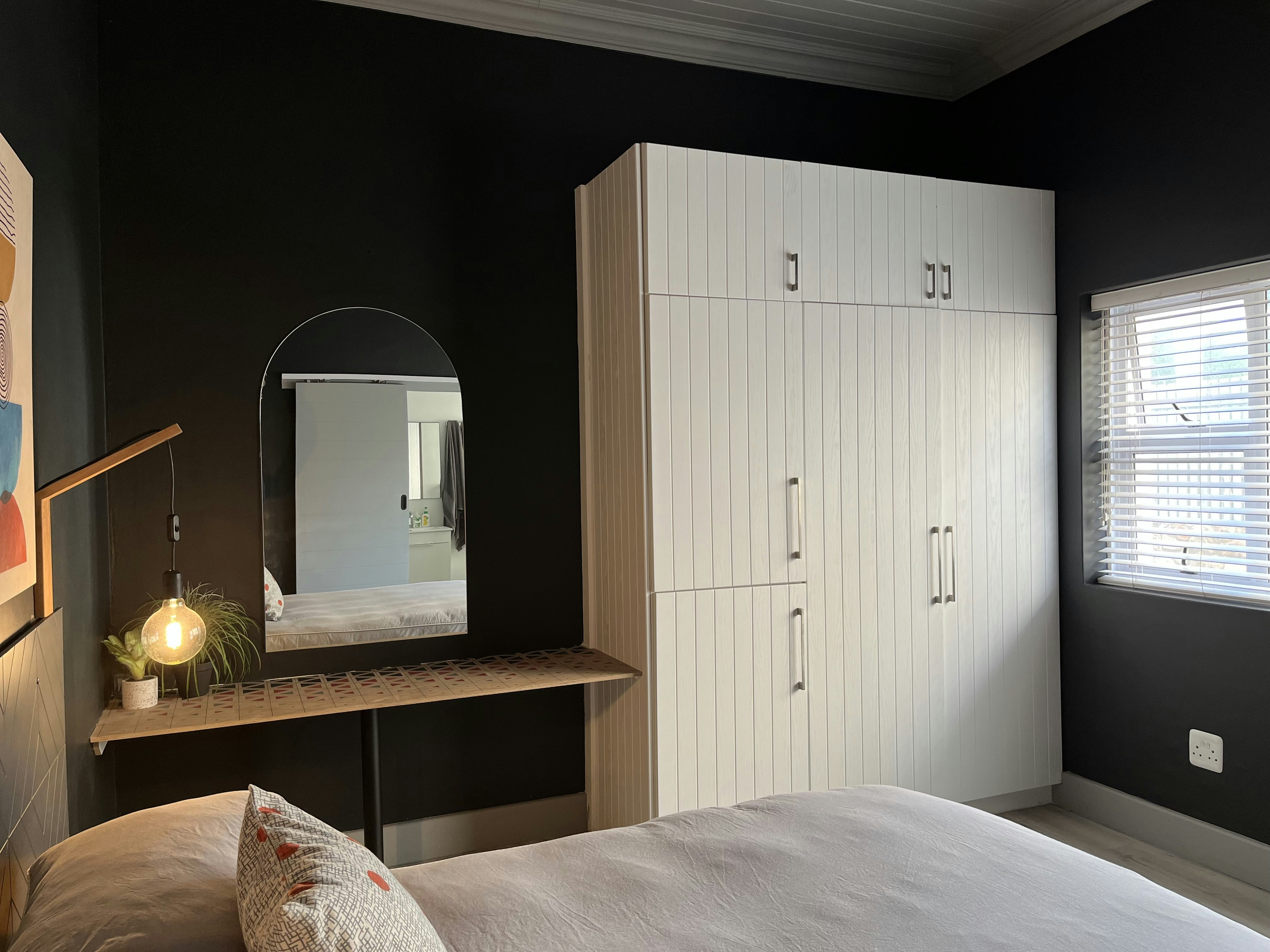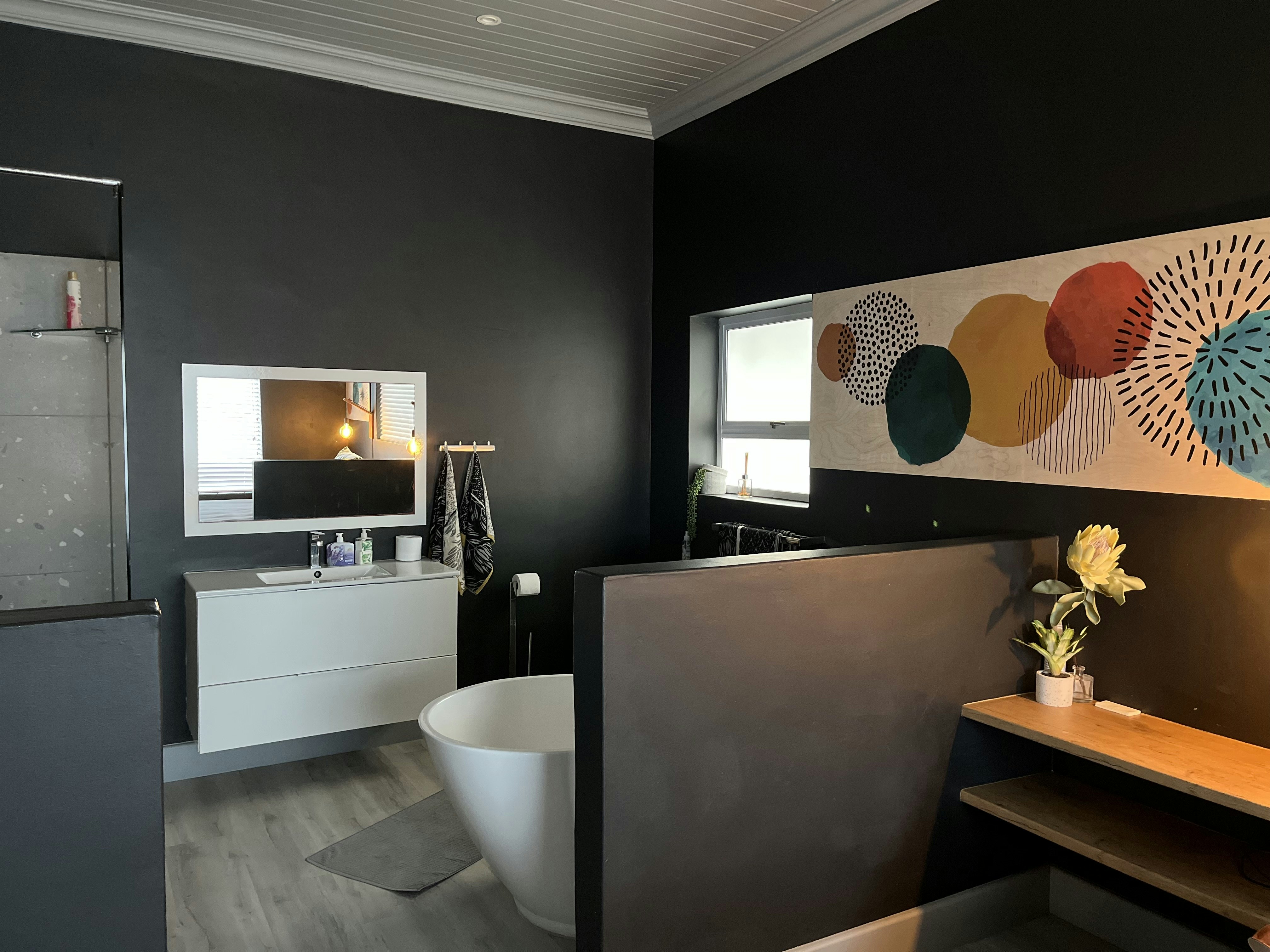 The living area of the home features an open-plan design with a kitchen that is fully equipped with a gas stove, electric oven, microwave, fridge-freezer, coffee machine, ice machine, cutlery and crockery as well as an 8-seater dining table. A washing machine is also available in the laundry room. Leading from the kitchen is a lounge area with comfy seating and a flat-screen TV with a full selection of DStv channels. Access to free Wi-Fi is available. This house uses solar power and does not experience load shedding.