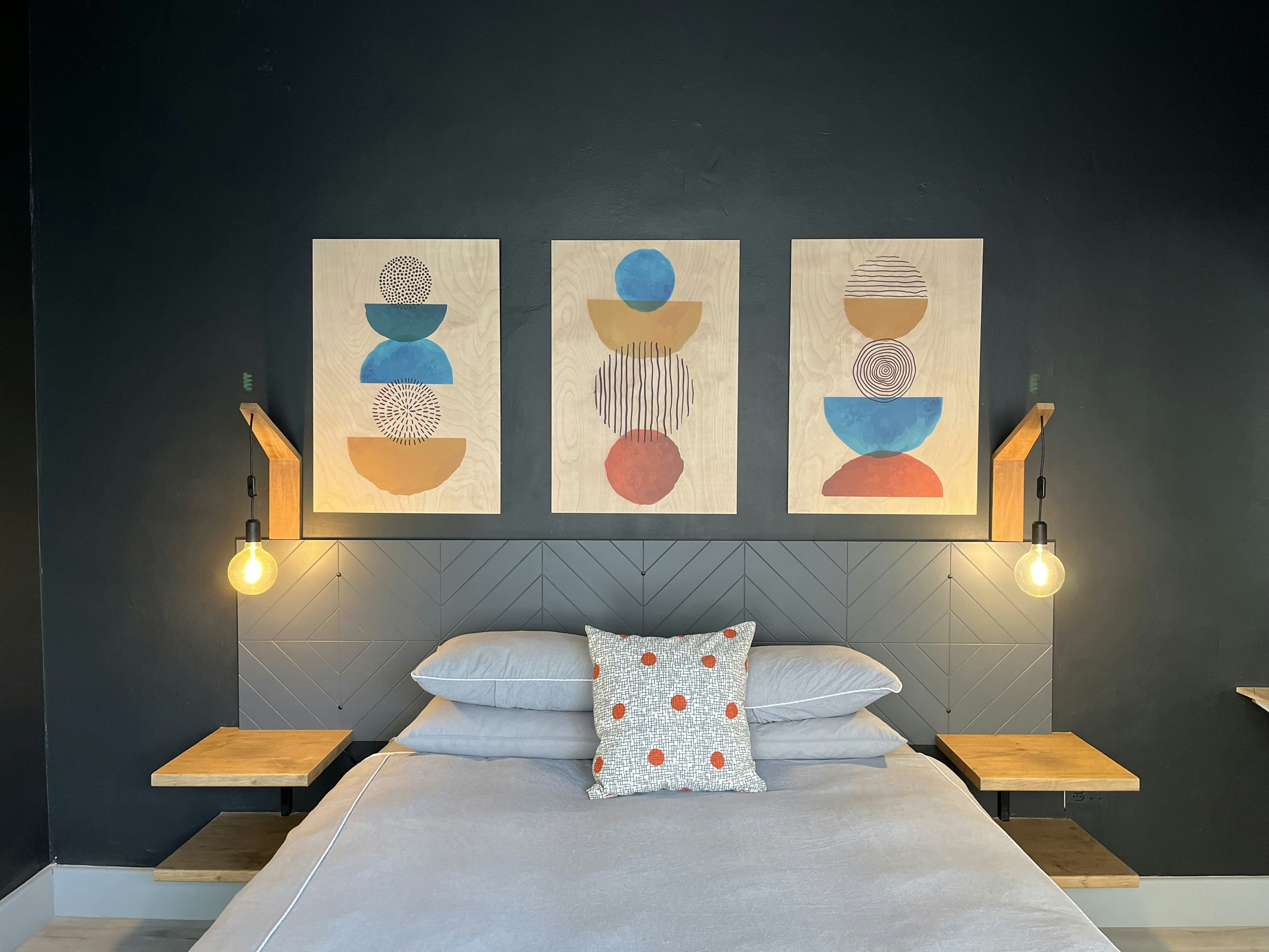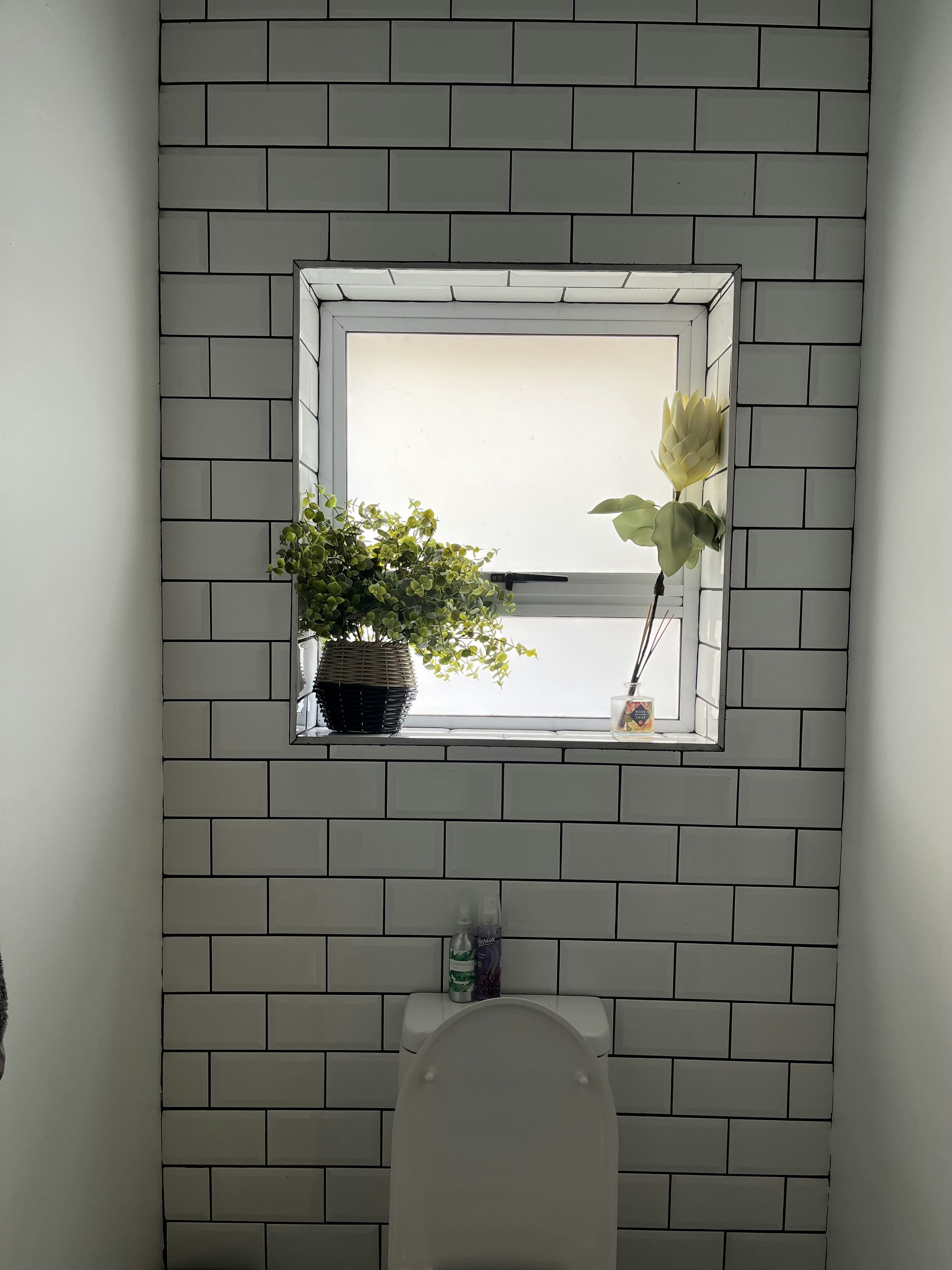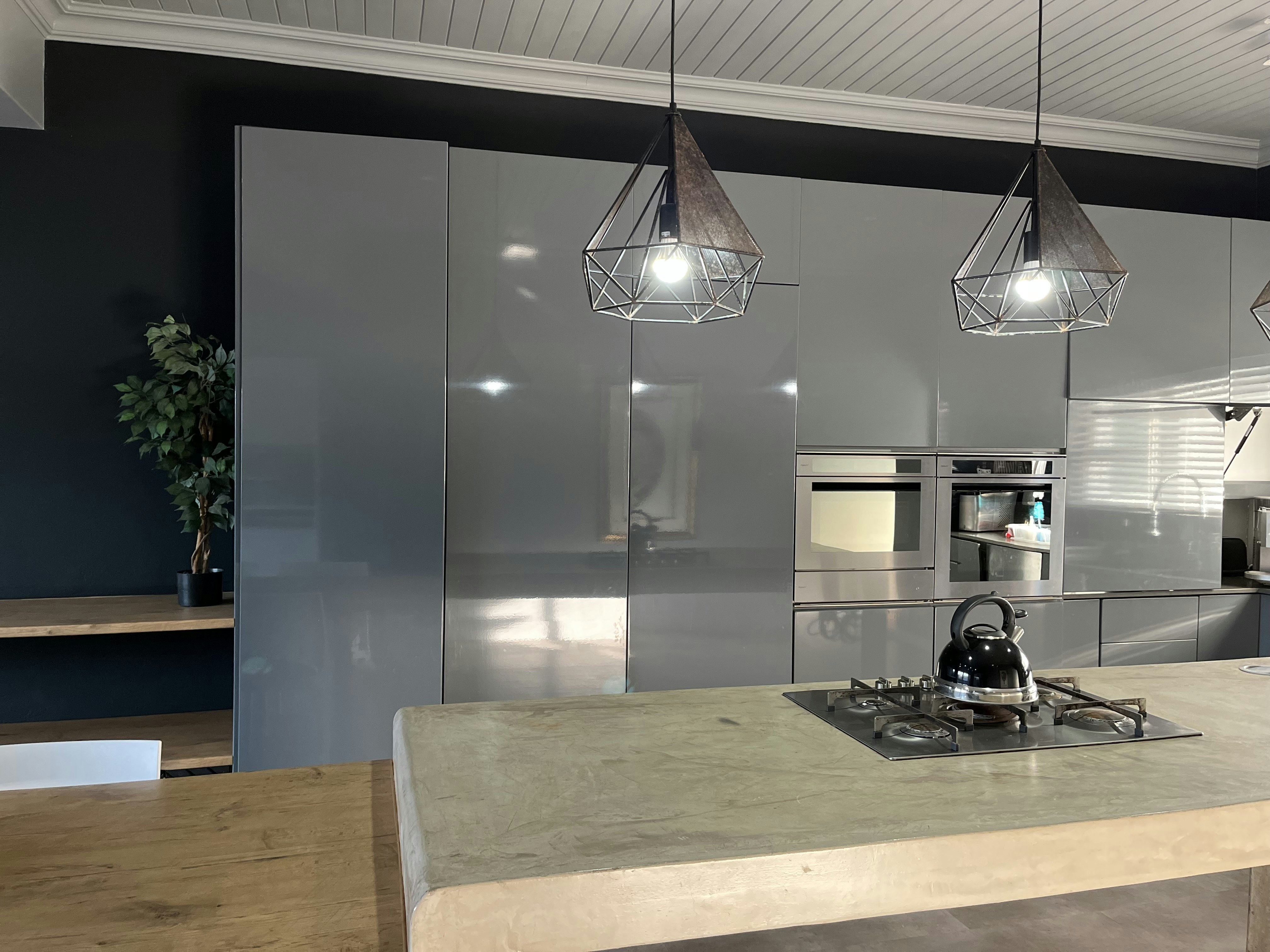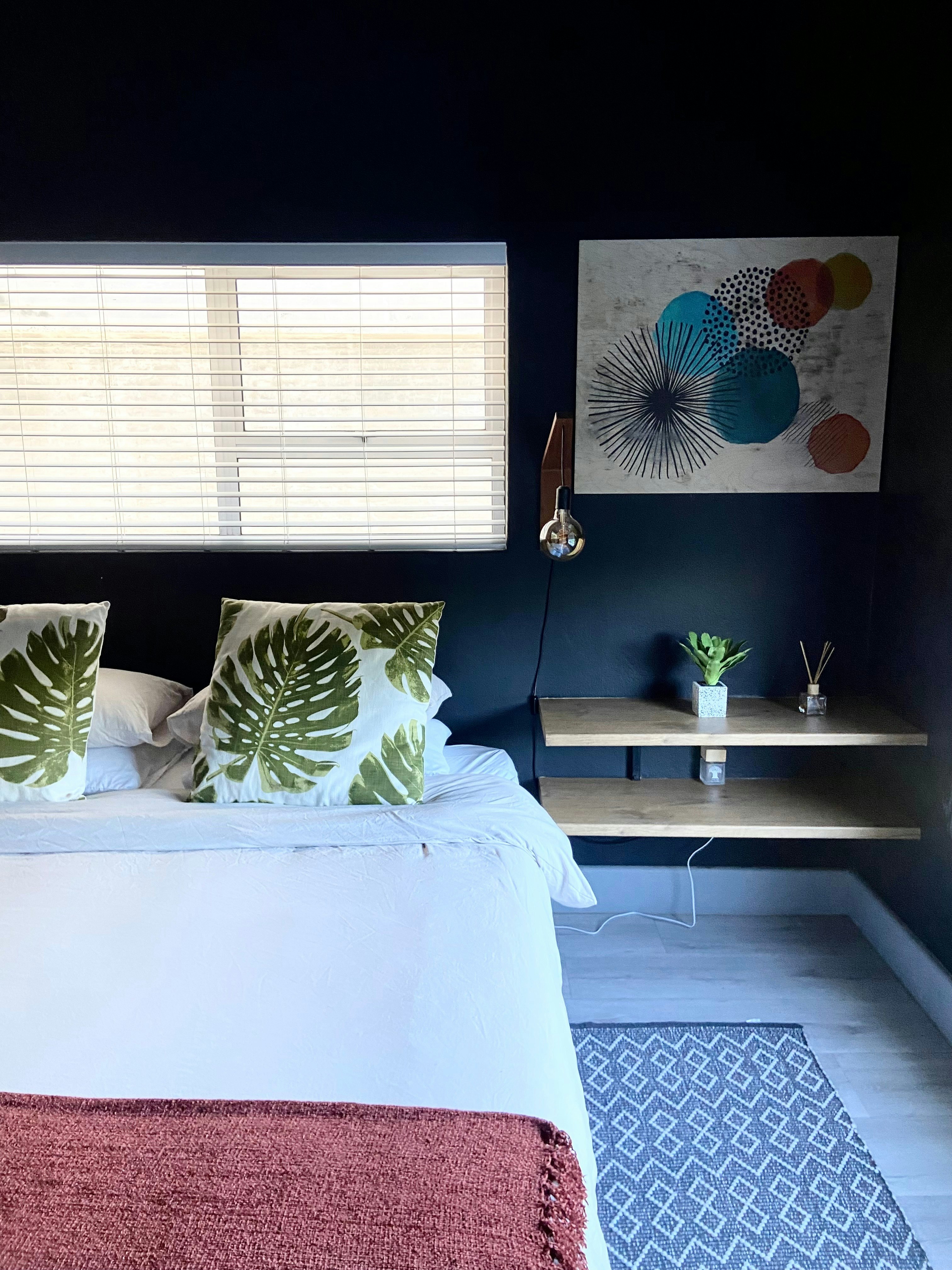 The living area of the home features an open-plan design with a kitchen that is fully equipped with a gas stove, electric oven, microwave, fridge-freezer, coffee machine, ice machine, cutlery and crockery as well as an 8-seater dining table. A washing machine is also available in the laundry room. Leading from the kitchen is a lounge area with comfy seating and a flat-screen TV with a full selection of DStv channels. Access to free Wi-Fi is available. This house uses solar power and does not experience load shedding.