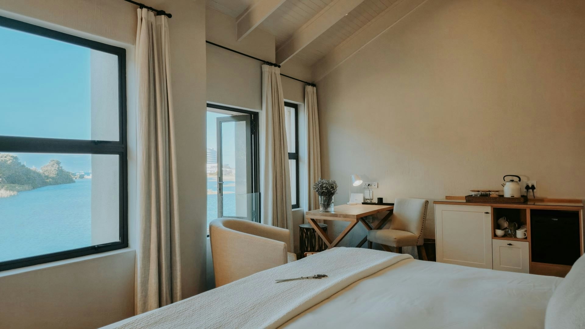 This beautiful air-conditioned apartment comprises 2 bedrooms upstairs and can accommodate 4 guests at a time. The air-conditioned main bedroom is furnished with a king-size bed and the master bathroom is fitted with a shower, washbasin and toilet. This room includes a seating area as well as a tea and coffee tray and boasts amazing views of the river. The second bedroom also contains a king-size bed and makes use of the second bathroom fitted with a shower.