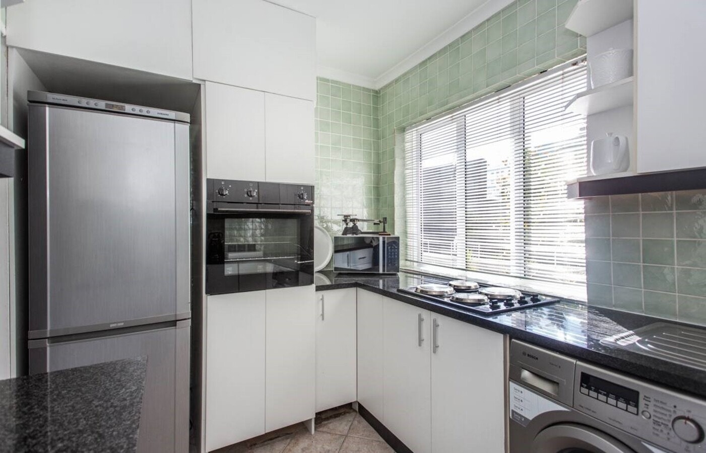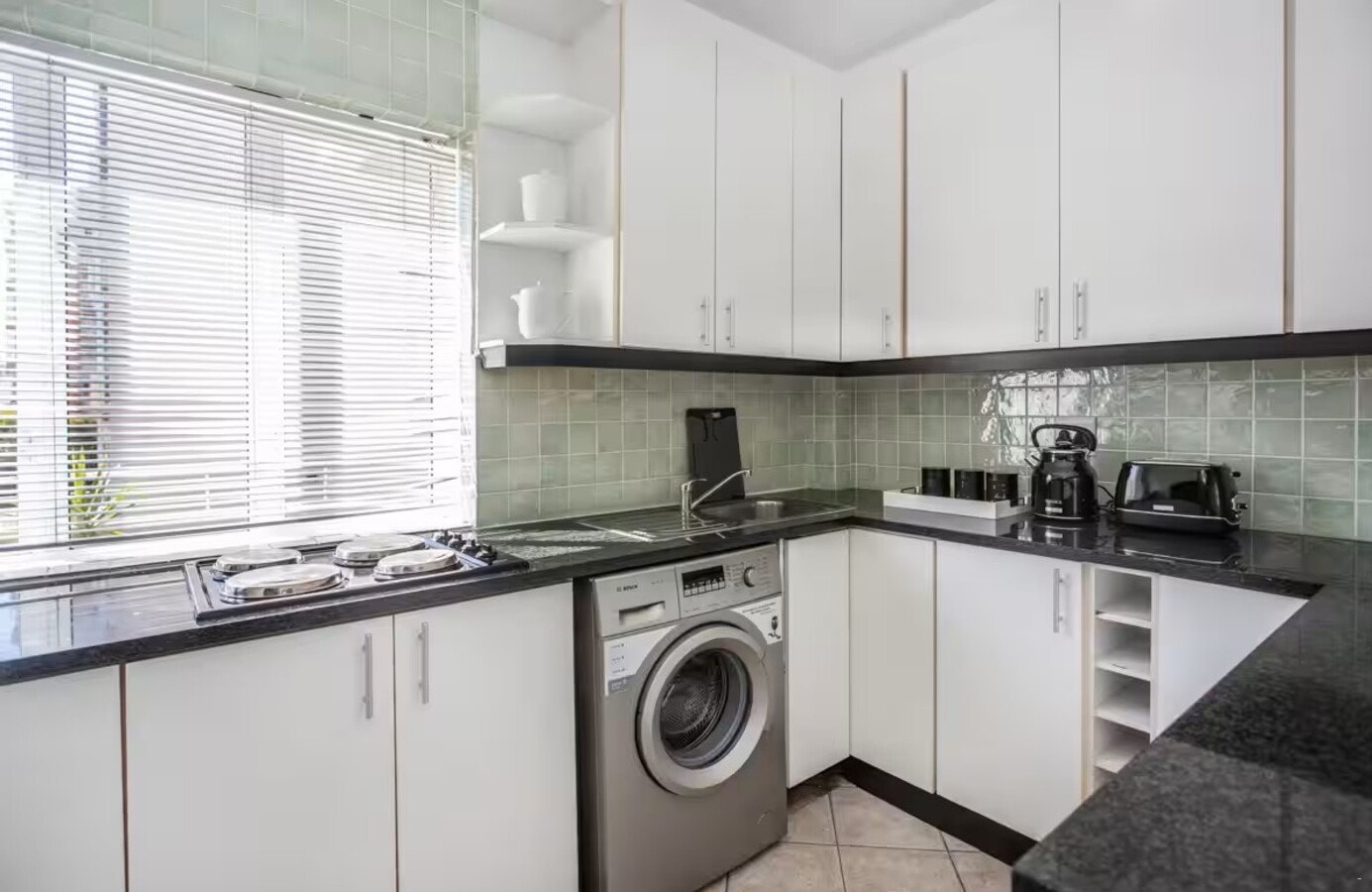 Die oopplan-leefarea sluit 'n eetarea en 'n sitkamer met gemaklike sitplek en 'n slim-TV in. Die volledig toegeruste kombuis bied 'n yskas, stoof, oond, mikrogolfoond en wasmasjien.