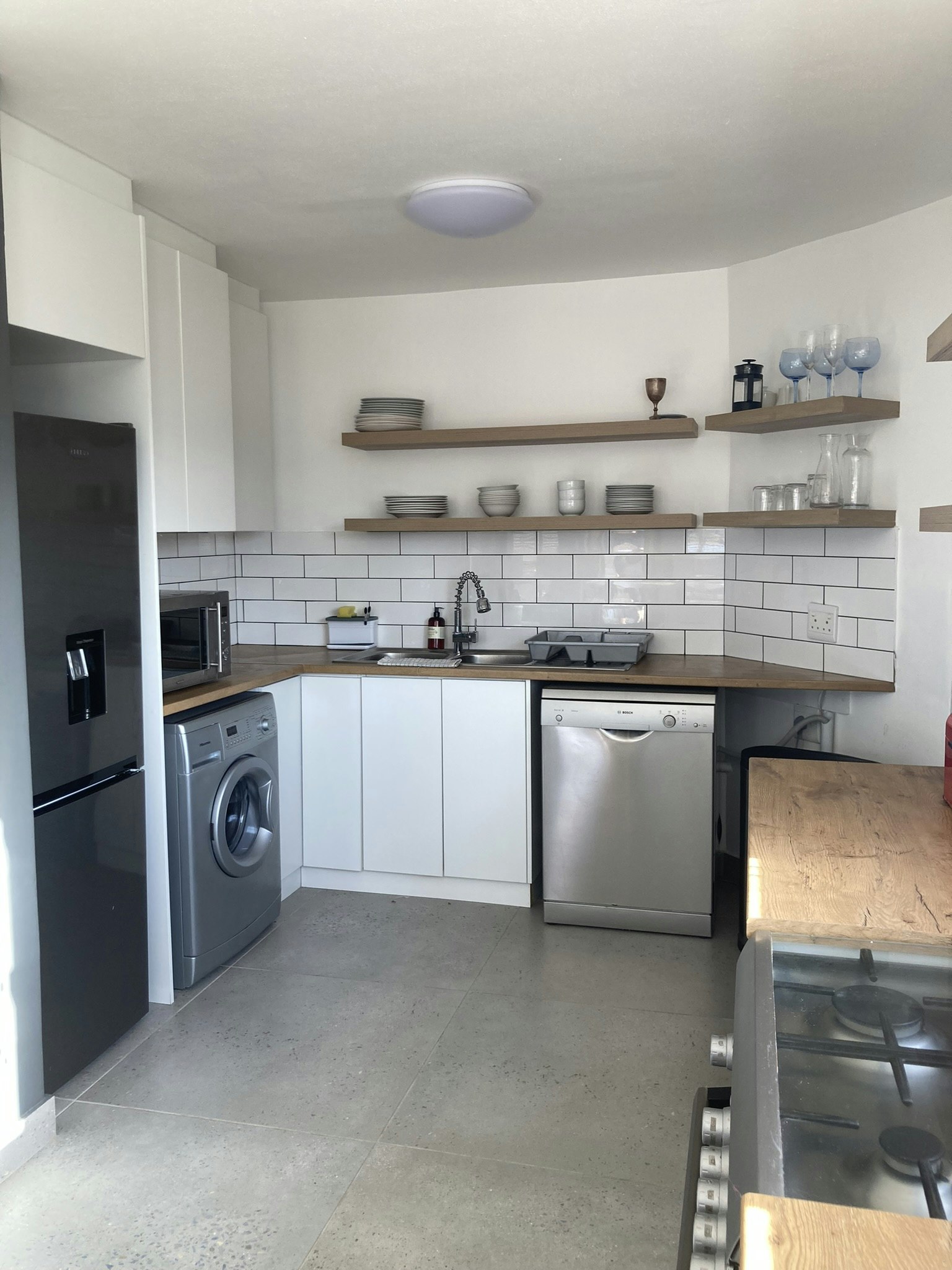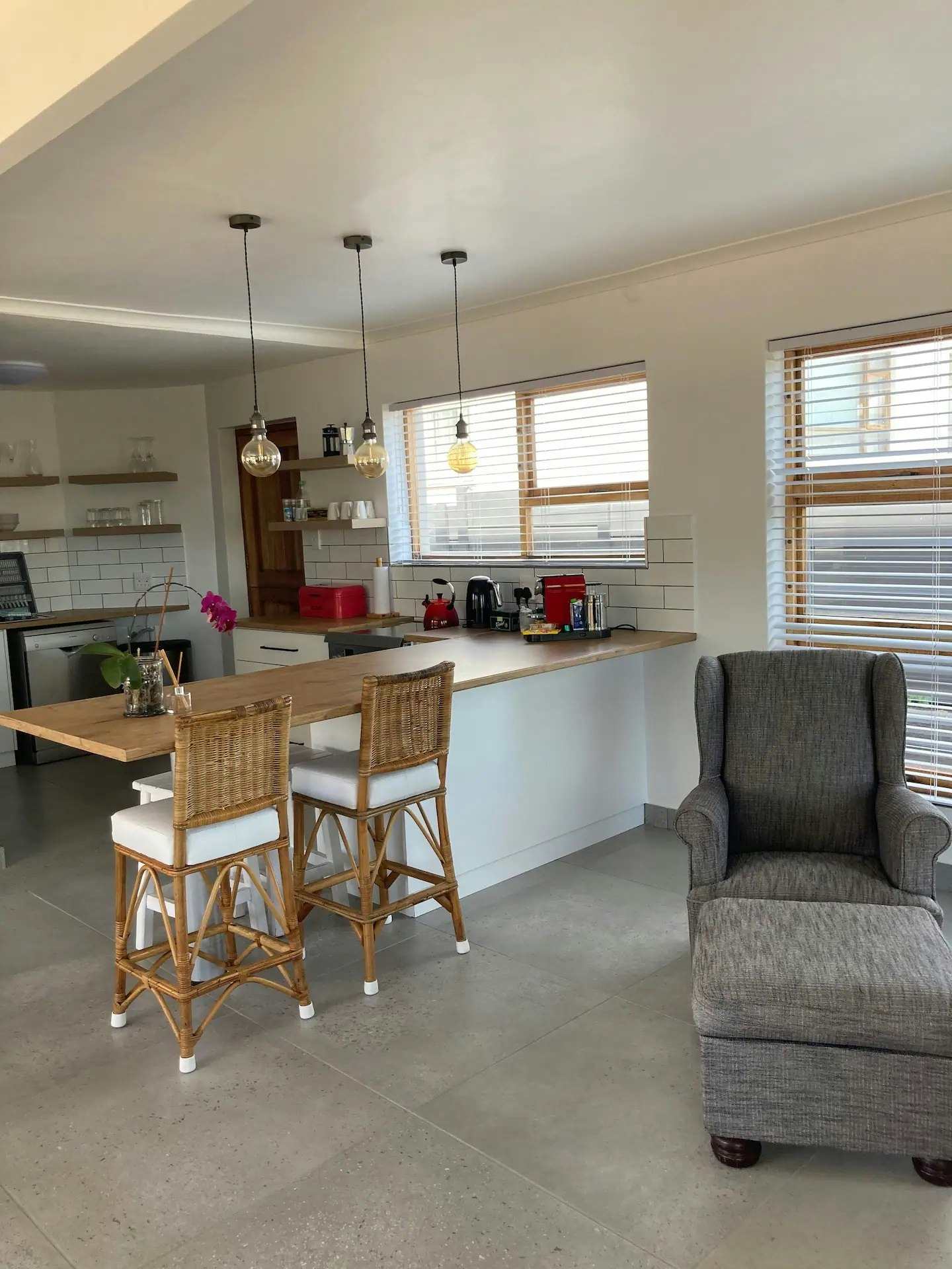 The living area features an open-plan design with a kitchen that is fully equipped with a gas stove, oven, microwave, fridge-freezer, cutlery, and crockery, as well as tea- and coffee-making facilities. A washing machine and dishwasher are also available for added convenience. The adjacent living area features a lounge with a comfortable couch and a dining table and chairs.