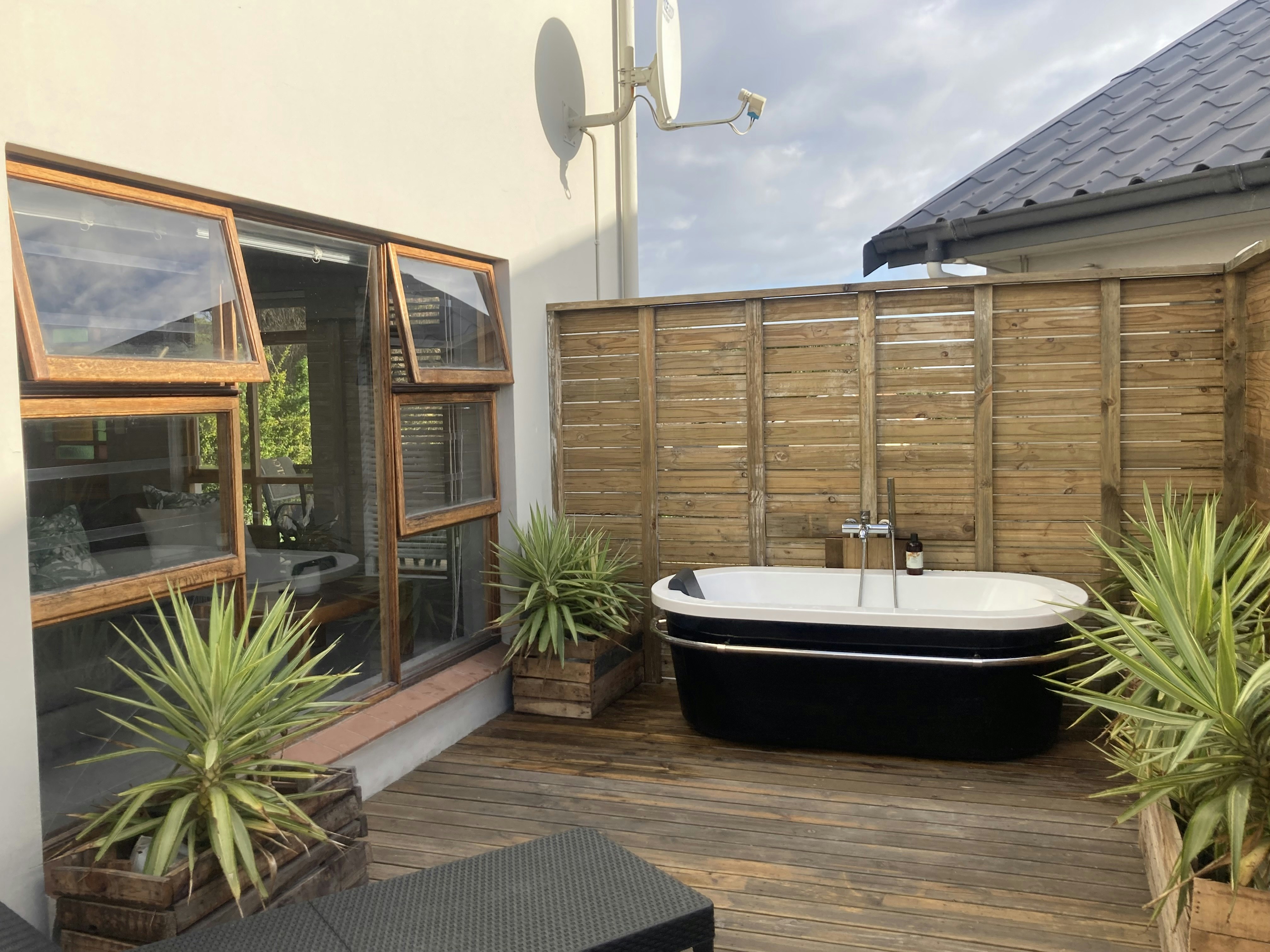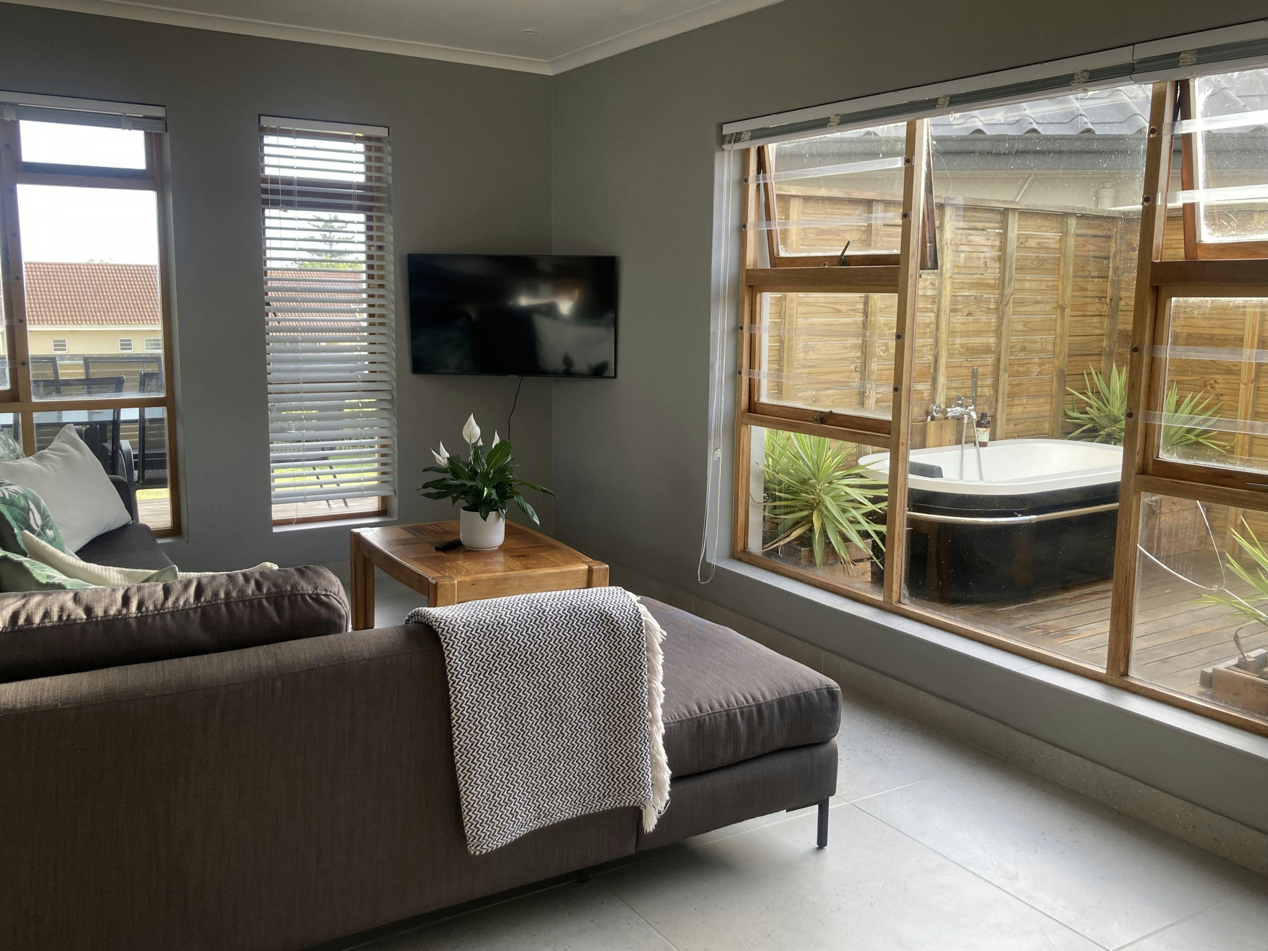 The living room opens onto a wooden deck with outdoor seating and a built-in braai that overlooks the bay. Guests have access to free Wi-Fi and secure parking.