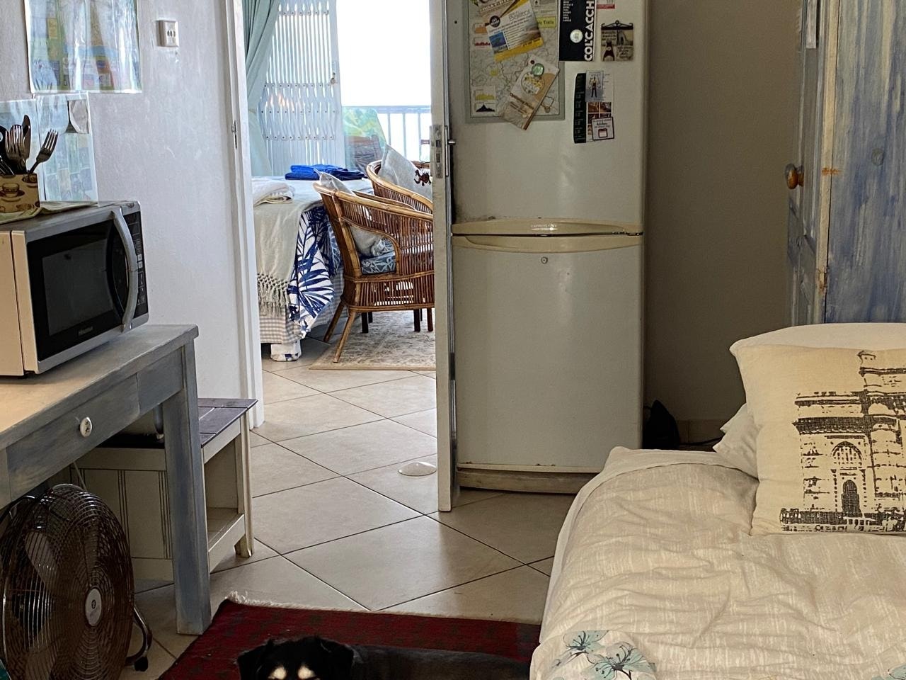 This unit is furnished with a queen-size bed and a spacious en-suite bathroom fitted with a shower, bath, toilet, and basin. The adjacent bedroom is furnished with a single bed and a separate toilet, making it convenient for a family of 3. The room offers a fridge-freezer, microwave, tea and coffee-making station, braai facilities, a TV, a breakfast table for 2, and a balcony with an ocean view and a dining table for 4.