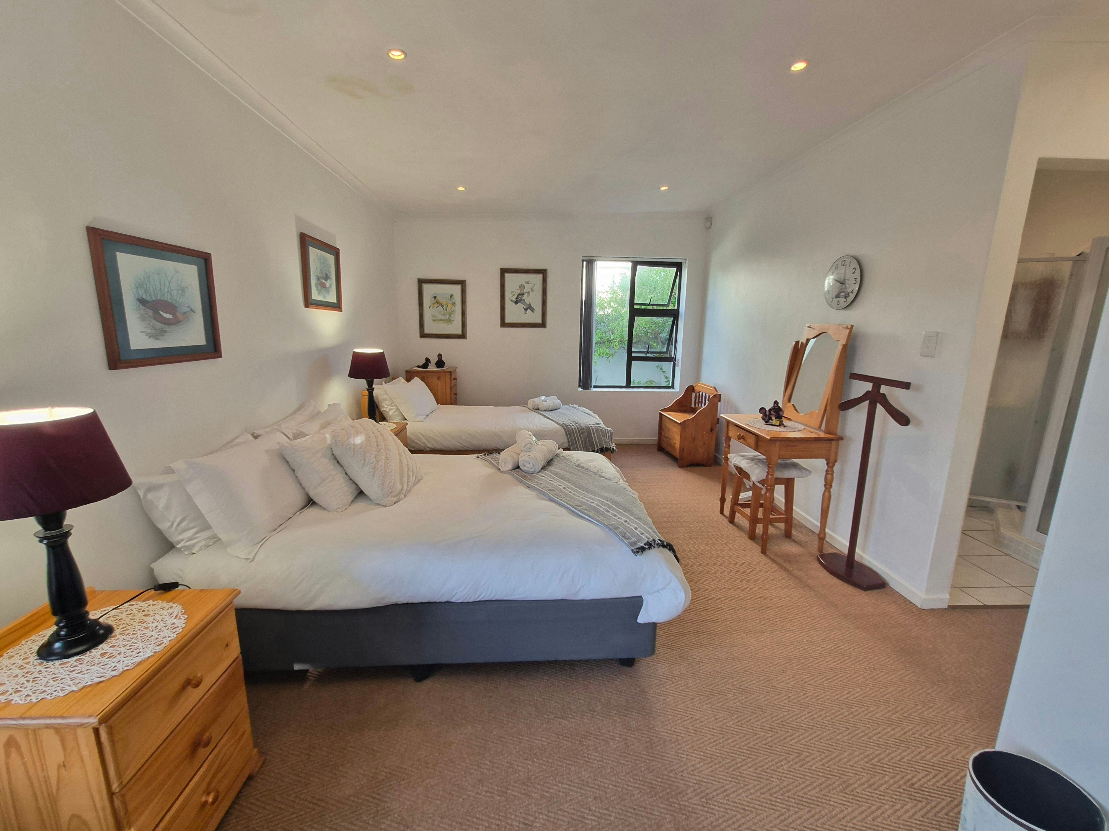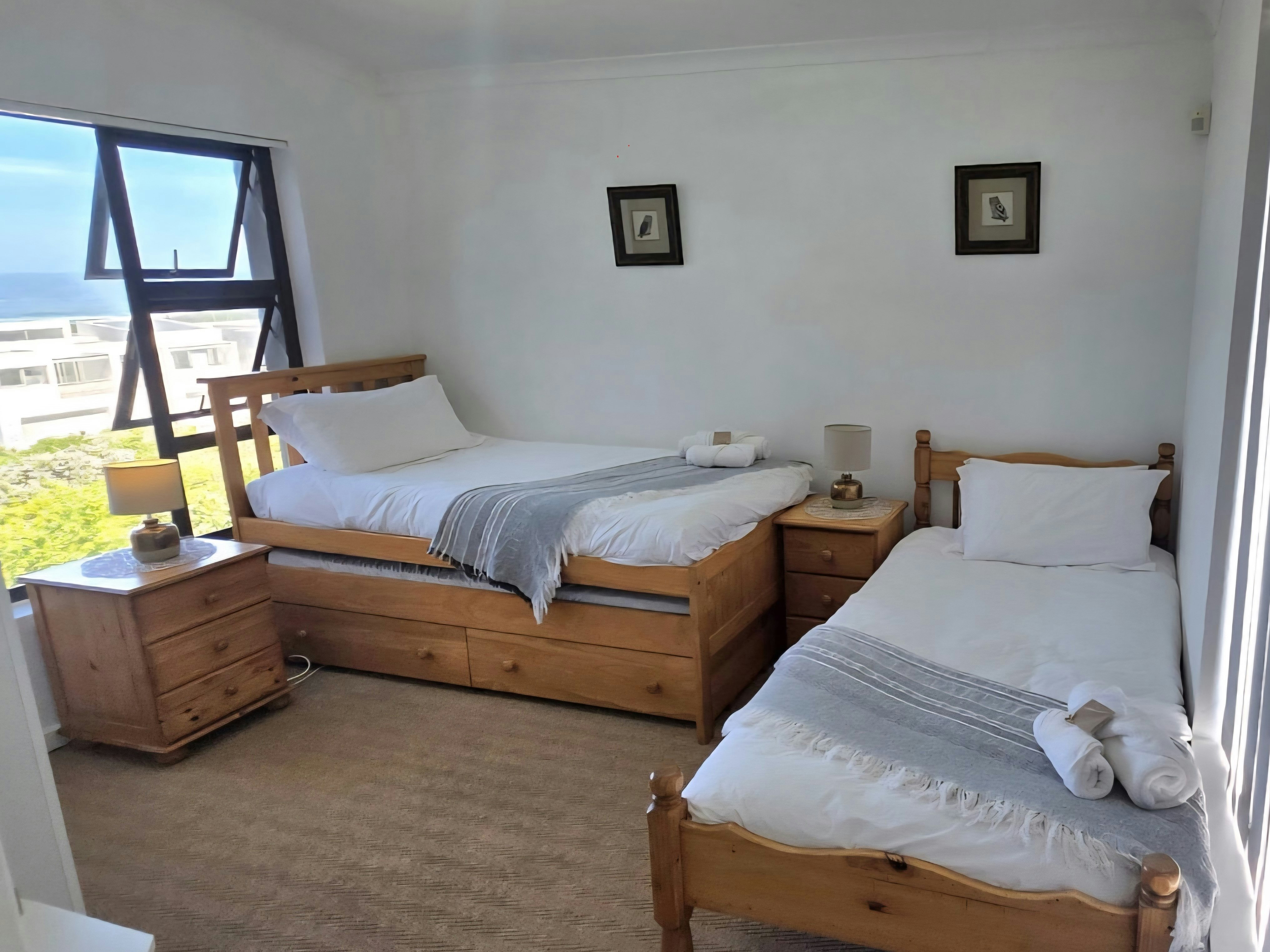 The kitchen is equipped with a dishwasher, microwave, ice maker, electric stove and oven, 2 fridges, a freezer and tea and coffee making facilities. A washing machine, tumble dryer, iron, and ironing board are also available. The house has an open-plan lounge, dining area, and kitchen, while the separate TV room with satellite channels. An upper-level sunroom opens onto a spacious deck with seating and beautiful sea views across to Gericke’s Point. Wi-Fi and an inverter are available.
