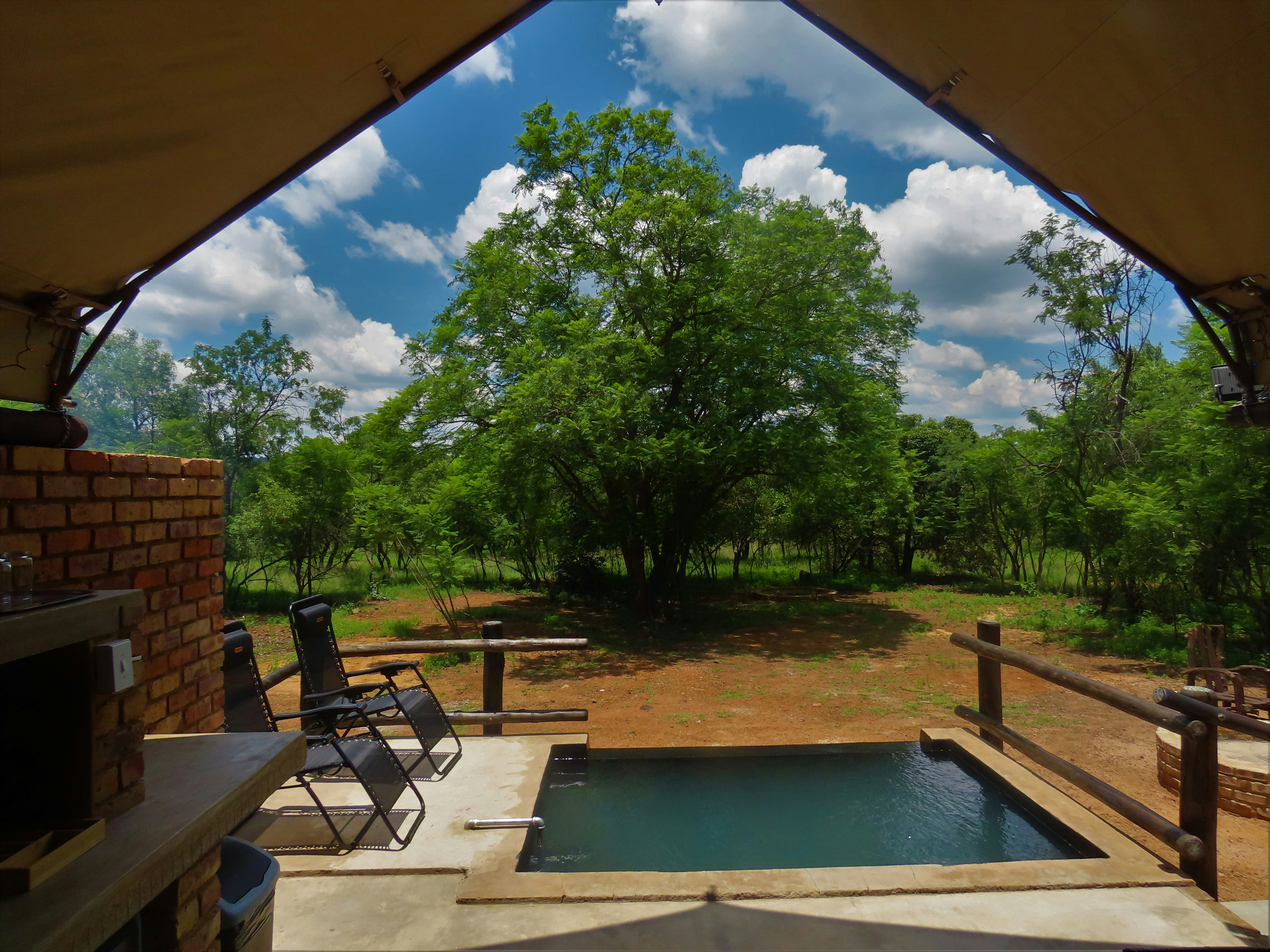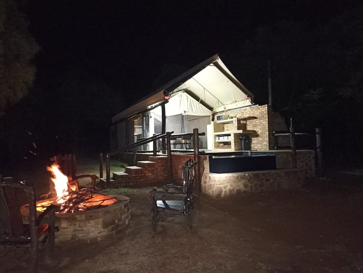 Ons 2 luukse bosveldtente is baie privaat. Elke tent het sy eie swembadjie, watergat, koninggrootte-bed, en suite-stort, privaat oopplan-braaiplek met 'n Weber en 'n vuurmaakplek, 'n volledig toegeruste kombuisie met yskas, vrieskas, mikrogolf en 'n stoofplaat. Al die nodige linne, beddegoed, breekware en eetgerei word voorsien. Waaiers word voorsien in die somer en in die winter word verwarmers en elektriese komberse voorsien.
