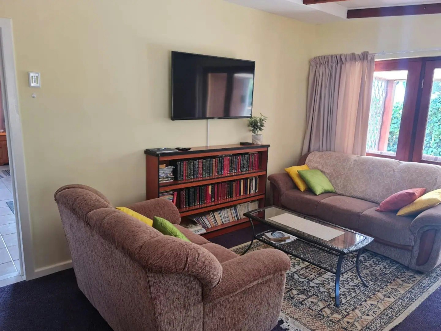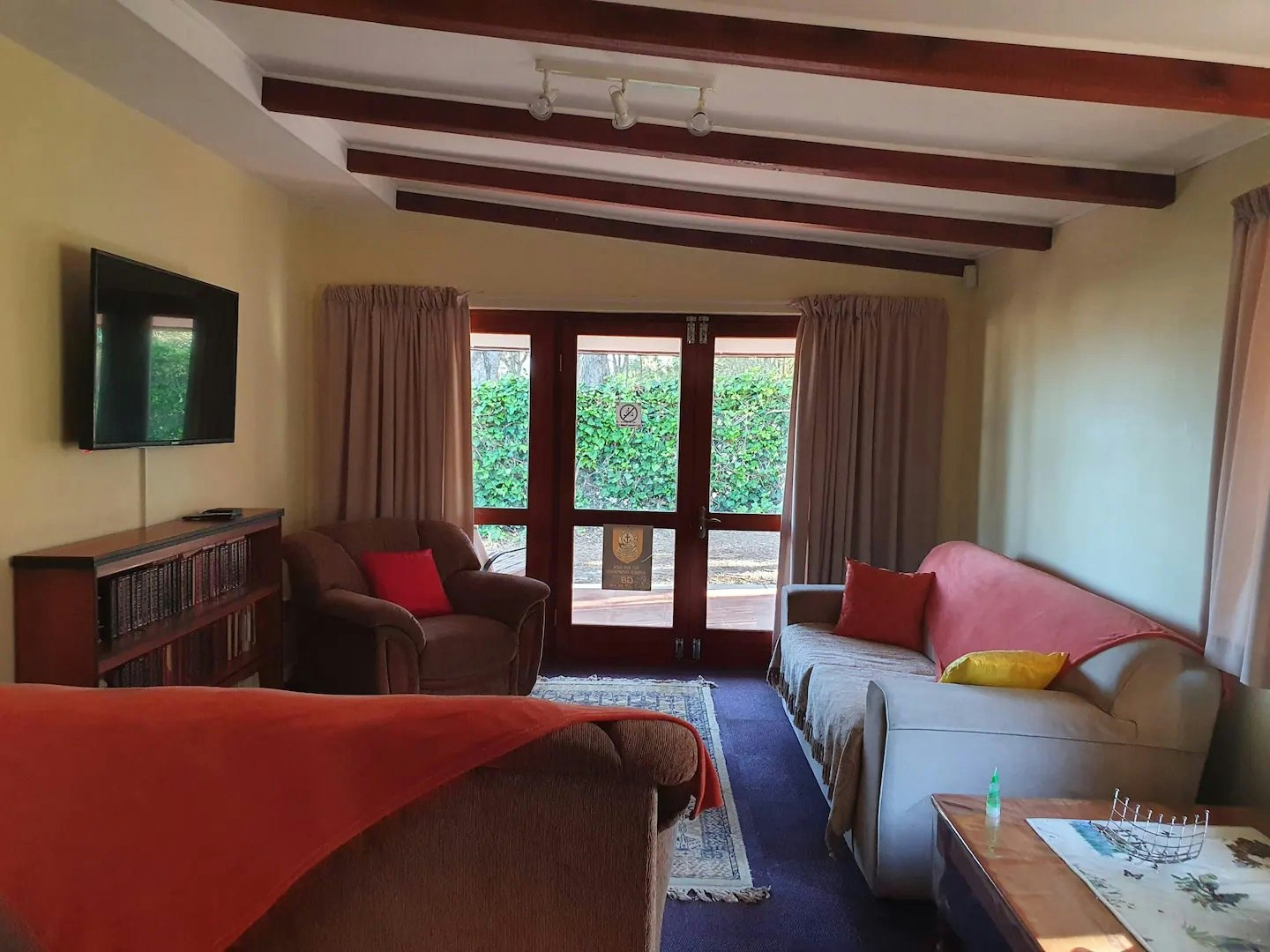 This kitchen is equipped with a gas stove, microwave, toaster, kettle, fridge, cutlery, and crockery. The lounge has comfortable couches, a TV with DStv channels, and plenty of books to read. Access to free Wi-Fi is available. The living room opens onto a covered patio with braai facilities and outdoor seating.