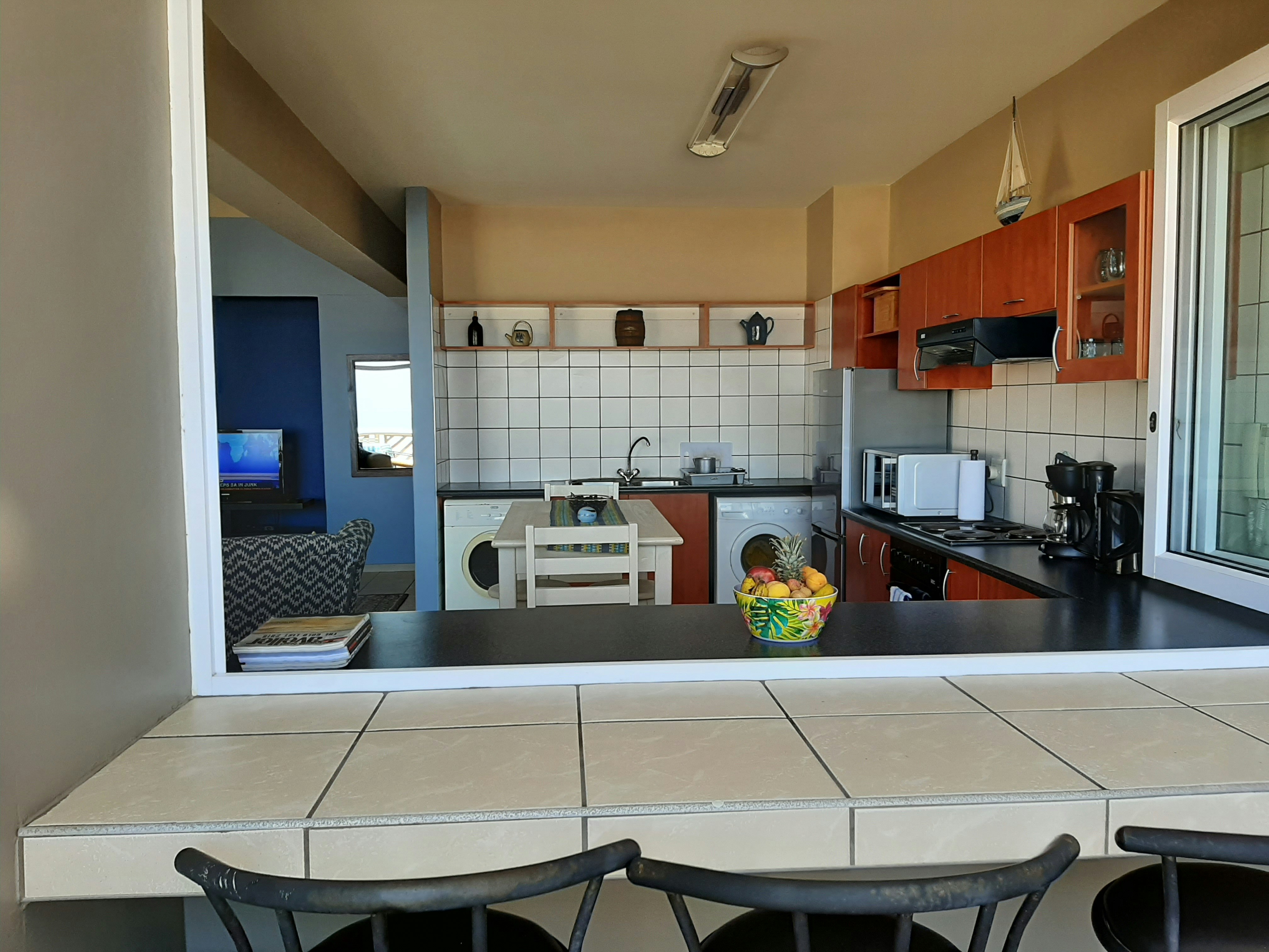 Die oopplan-leefarea sluit 'n volledig toegeruste kombuis in met 'n stoof, oond, 2 yskas-vrieskaste, mikrogolfoond, eetgerei, breekware en tee- en koffiemaakgeriewe. 'n Wasmasjien en tuimeldroër word ook voorsien. Die kombuis het stapelvensters wat oopmaak na 'n balkon-diensarea, wat 'n heerlike binne-buite-ervaring skep. Daar is 'n eetarea met 'n tafel vir 6, en die sitkamer bied gemaklike sitplek en 'n TV met alle DStv-kanale.