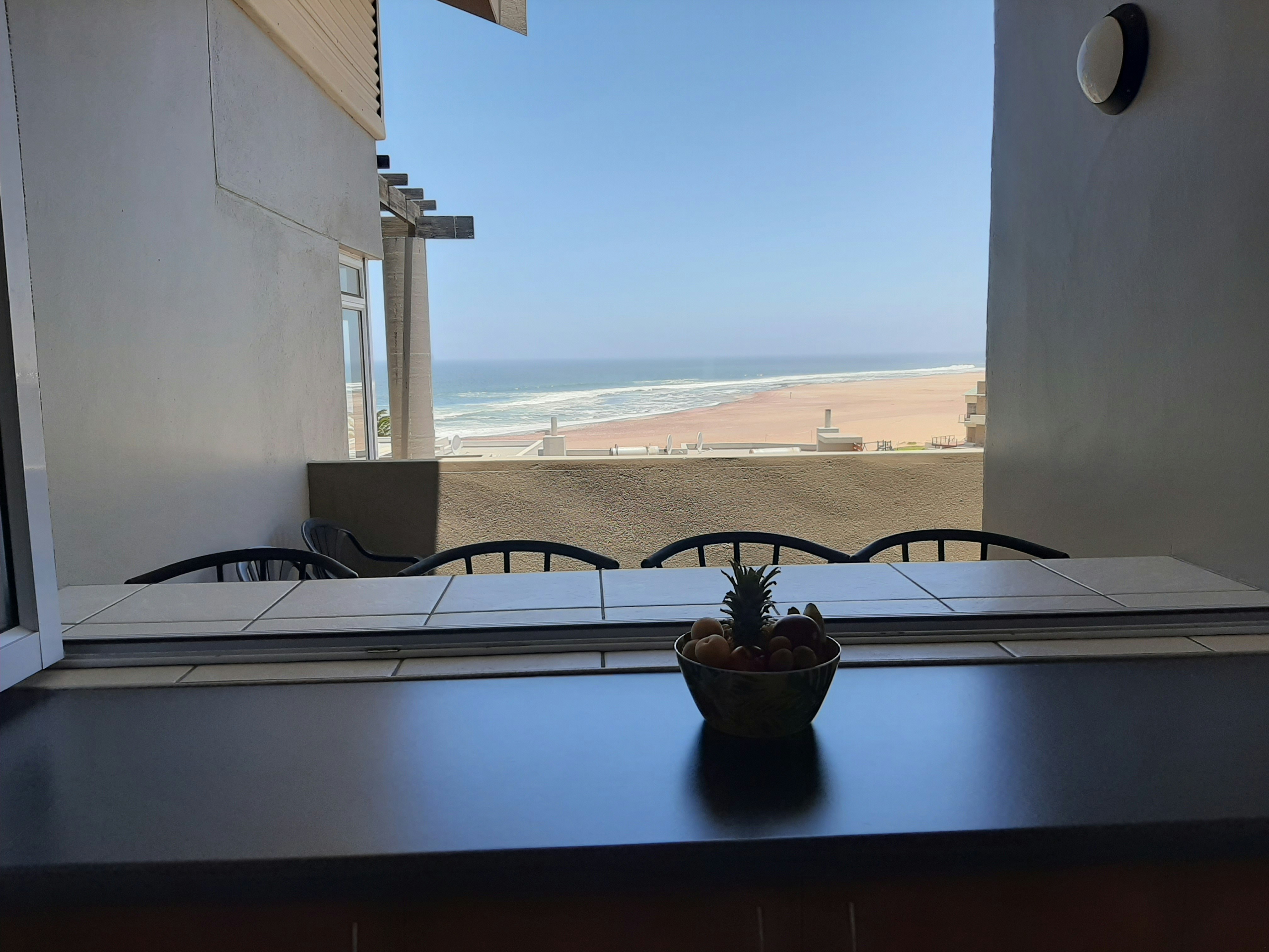 Die leefarea lei na 'n groot balkon wat in twee dele verdeel is. Die eerste gedeelte, wat via stapelvensters aan die kombuis gekoppel is, het sitplek vir 4 gaste. Die tweede gedeelte beskik oor 'n ingeboude braai en 'n eetarea met sitplek vir 4. Gaste kan die sonsopkoms oor die woestyn met 'n koppie koffie en die sonsondergang oor die see met 'n skemerkelkie geniet. Die panoramiese uitsigte oor die see en duine is werklik merkwaardig. Die balkon is beskut teen die koue suidwestewind as gevolg van sy ligging. Veilige parkering word voorsien.