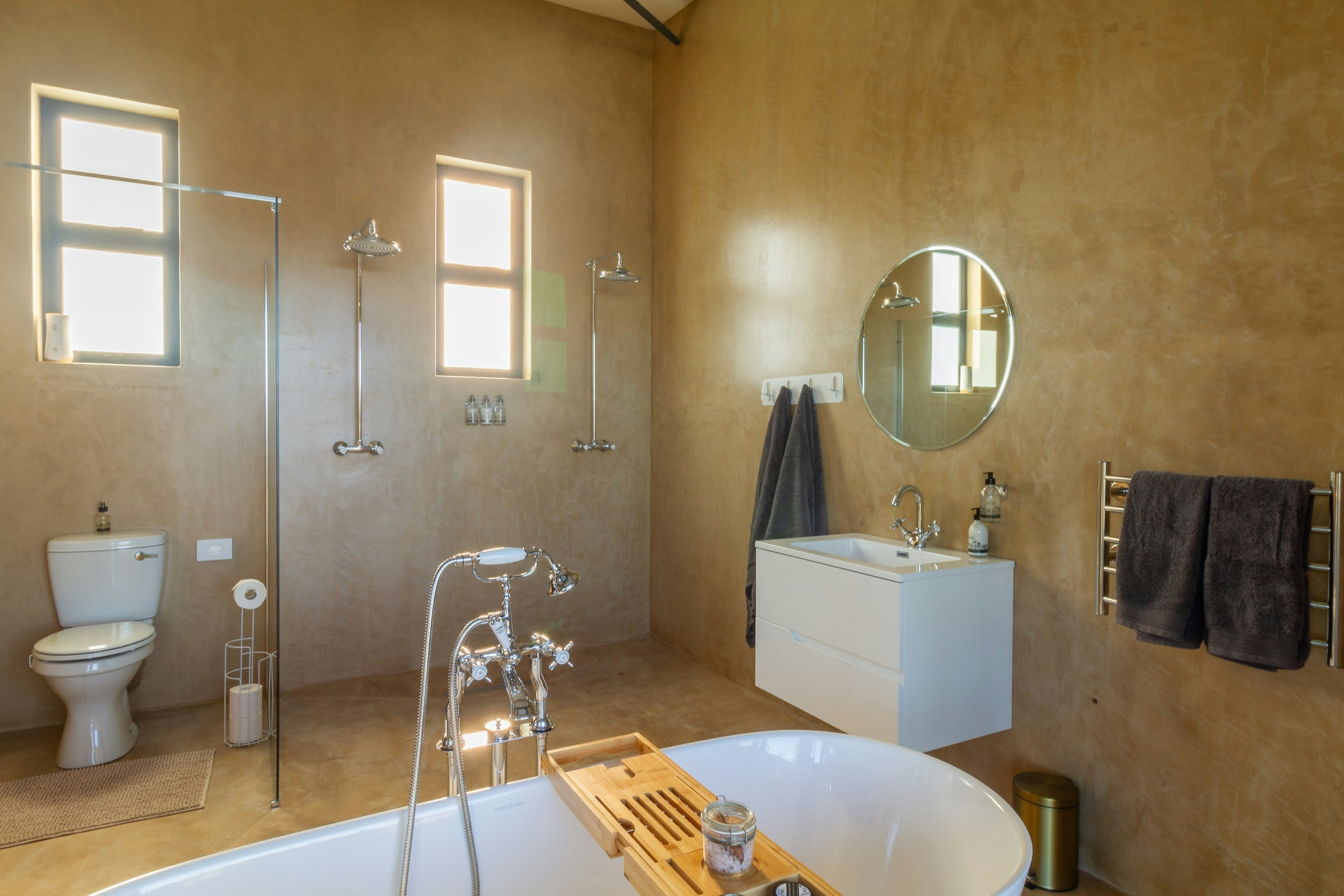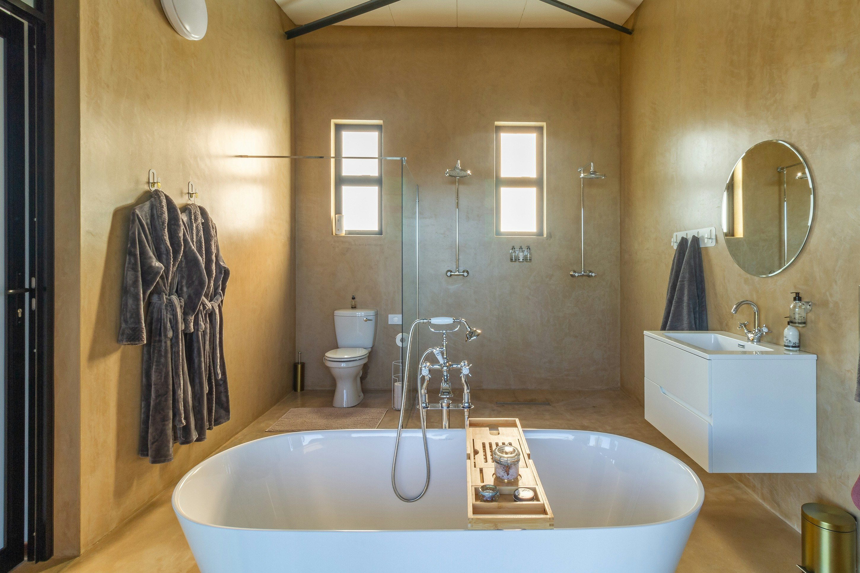 The modern pod cottage features an open-plan living area with an extra-length king-size bed and a luxurious en-suite bathroom. The bathroom is fitted with a soaker bathtub, walk-in shower, toilet and washbasin. High-quality linen, as well as bath and swim towels, are provided.