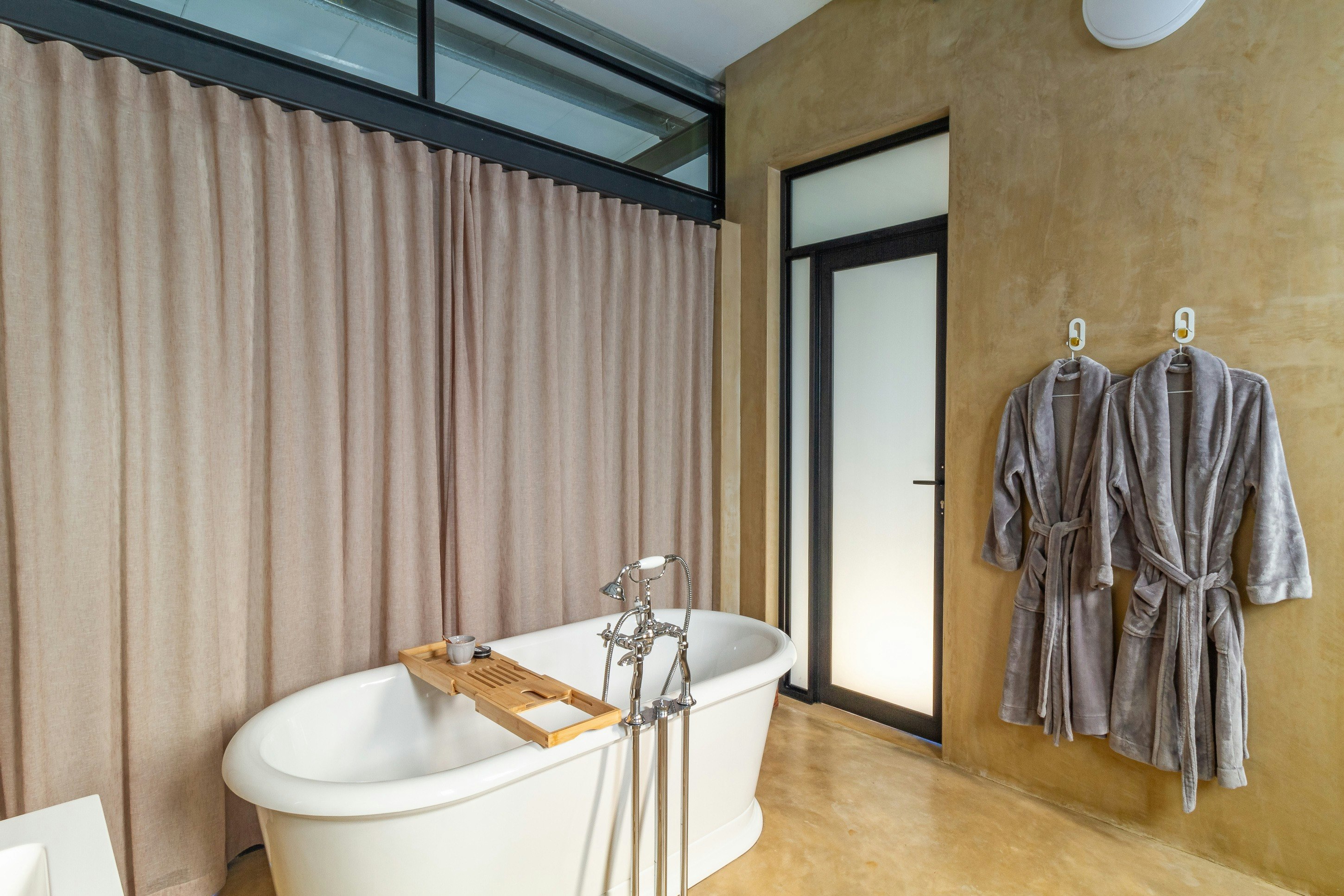 The modern pod cottage features an open-plan living area with an extra-length king-size bed and a luxurious en-suite bathroom. The bathroom is fitted with a soaker bathtub, walk-in shower, toilet and washbasin. High-quality linen, as well as bath and swim towels, are provided.