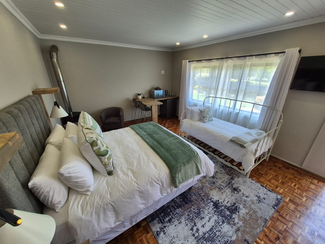 Die gastehuis bied 6 kamers met privaat badkamers. Vars linne en badhanddoeke word voorsien. Elke kamer is toegerus met verhit-en-eetgeriewe, insluitend 'n yskassie, ketel en mikrogolfoond. Die kamers het almal 'n slim-TV met stromingsdienste en gratis WiFi, sowel as 'n patio en braai-area vir gaste se vermaak.