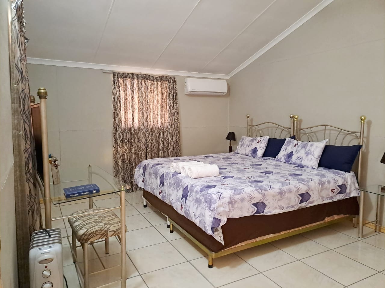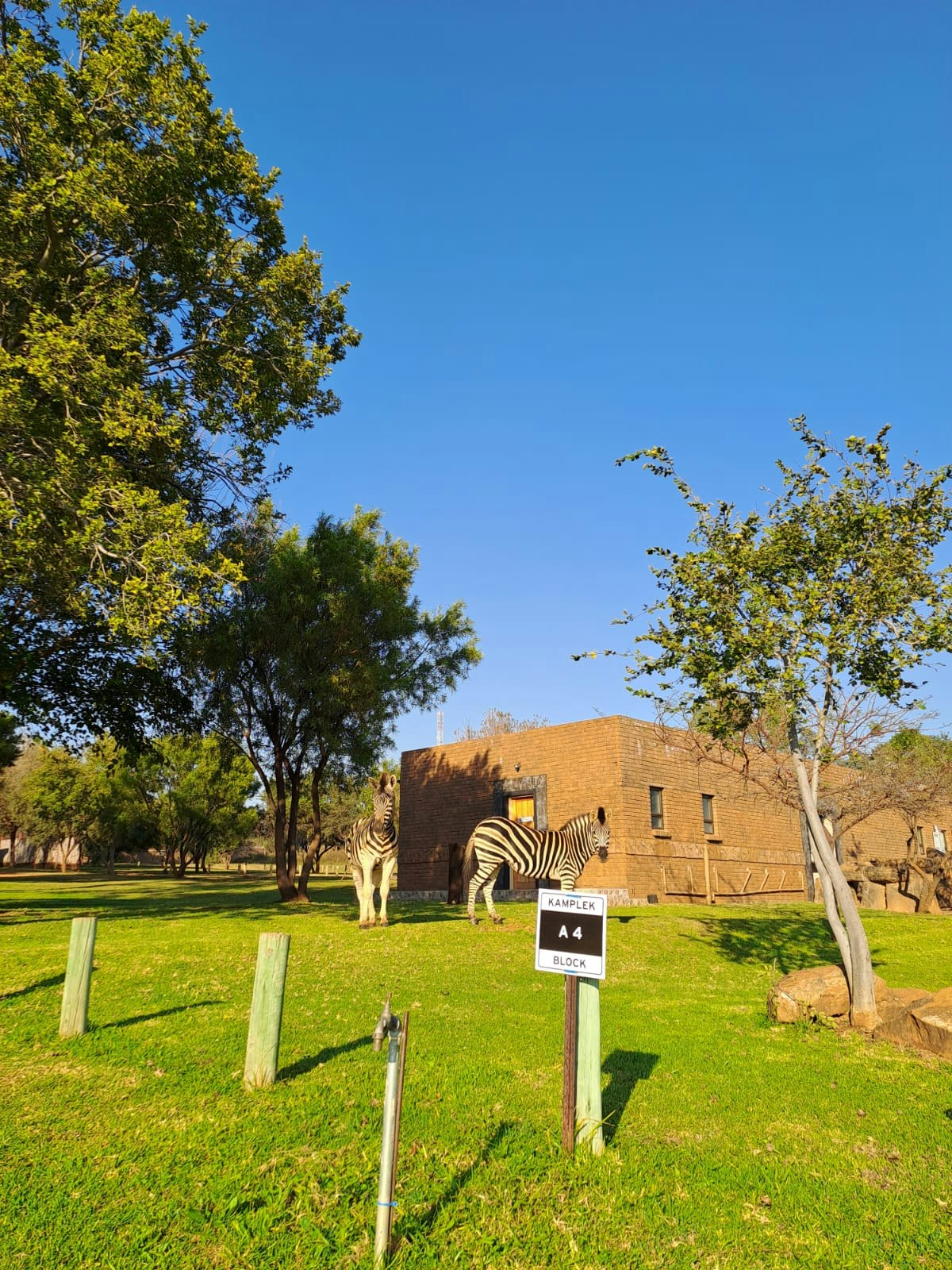 Guests can enjoy free-roaming wildlife, like zebra, that walk around on the property. There is also a big swimming pool, a children's play area, braai facilities, and a bar that the guests have access to.