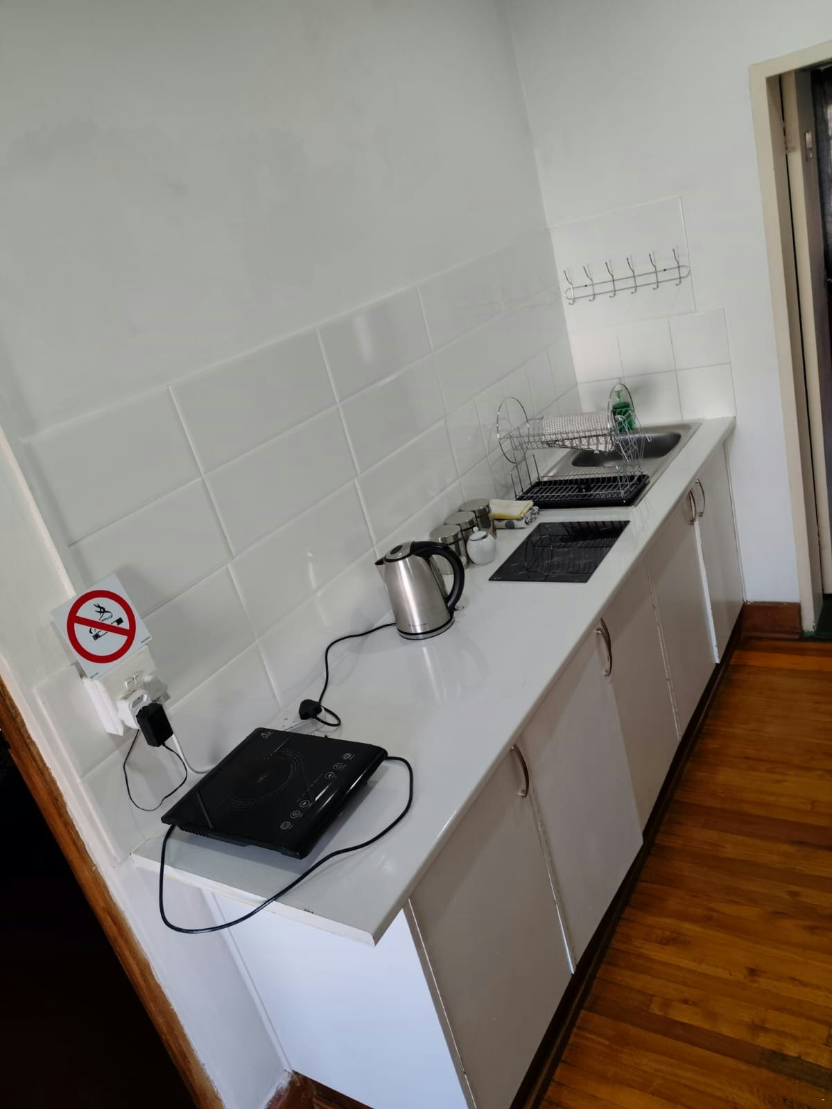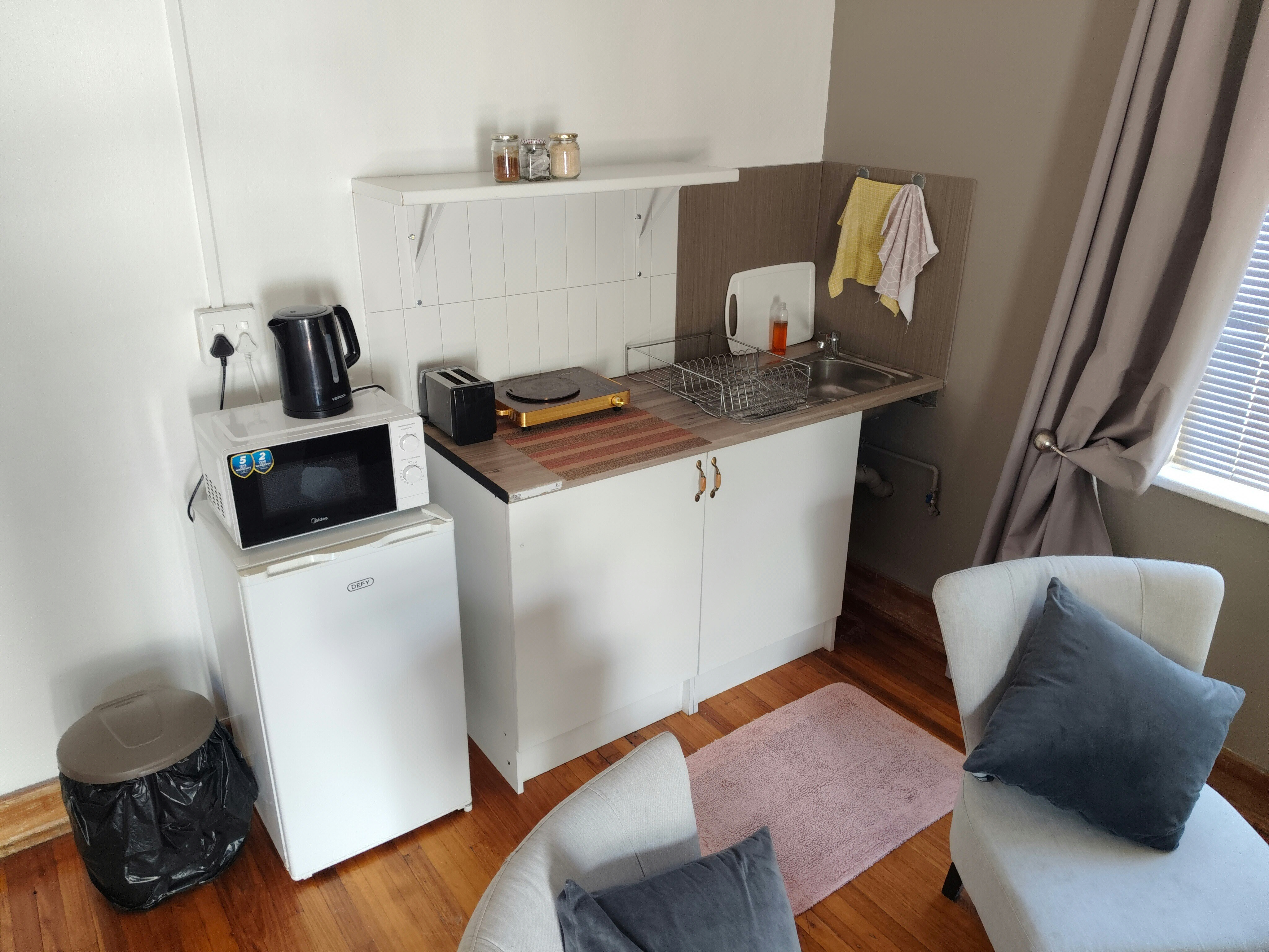 The kitchenette is equipped with a bar fridge, single stove plate, microwave, toaster, and kettle. There is also a communal swimming pool and braai area available outside.