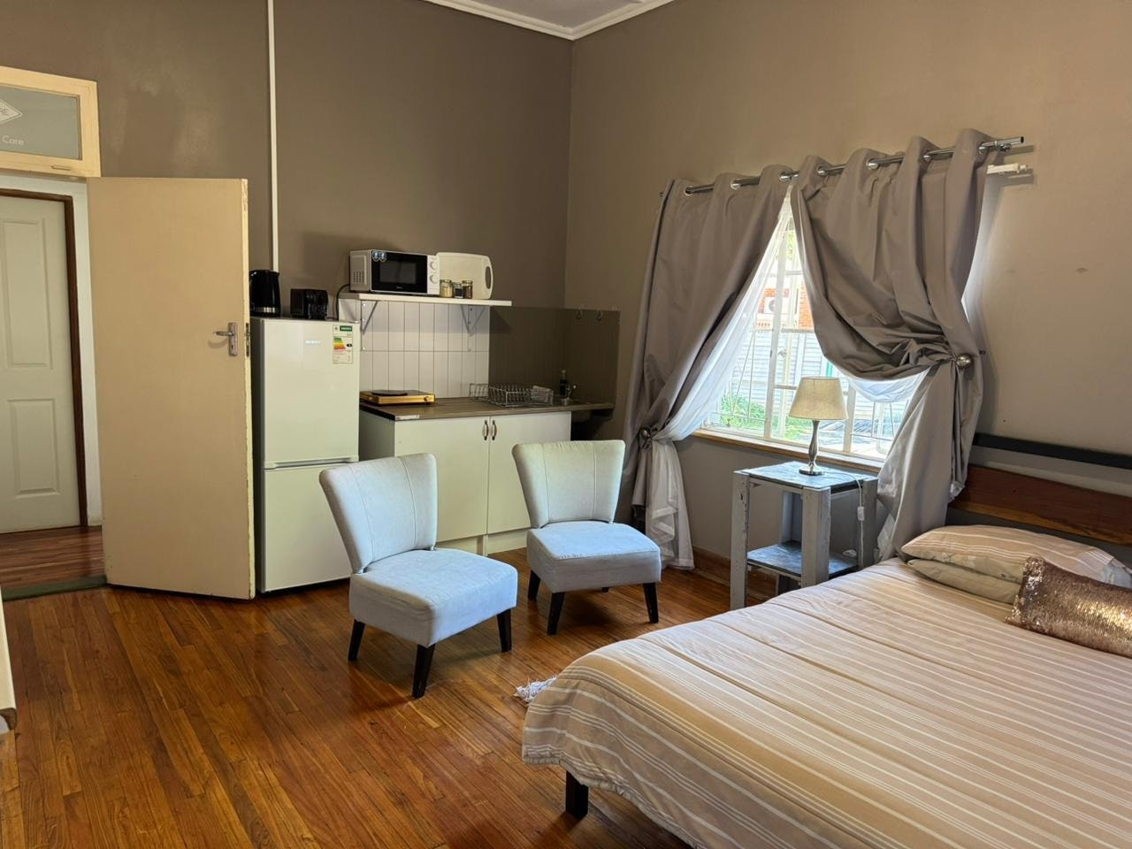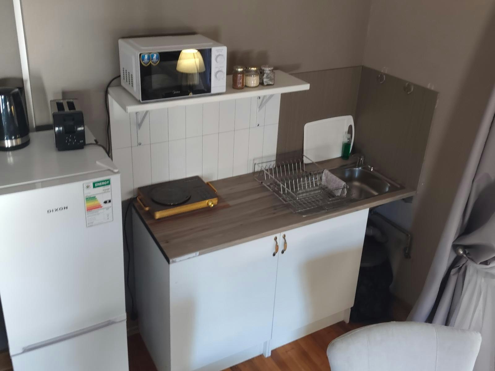 The kitchenette is equipped with a bar fridge, single stove plate, microwave, toaster, and kettle. There is also a communal swimming pool and braai area available outside.