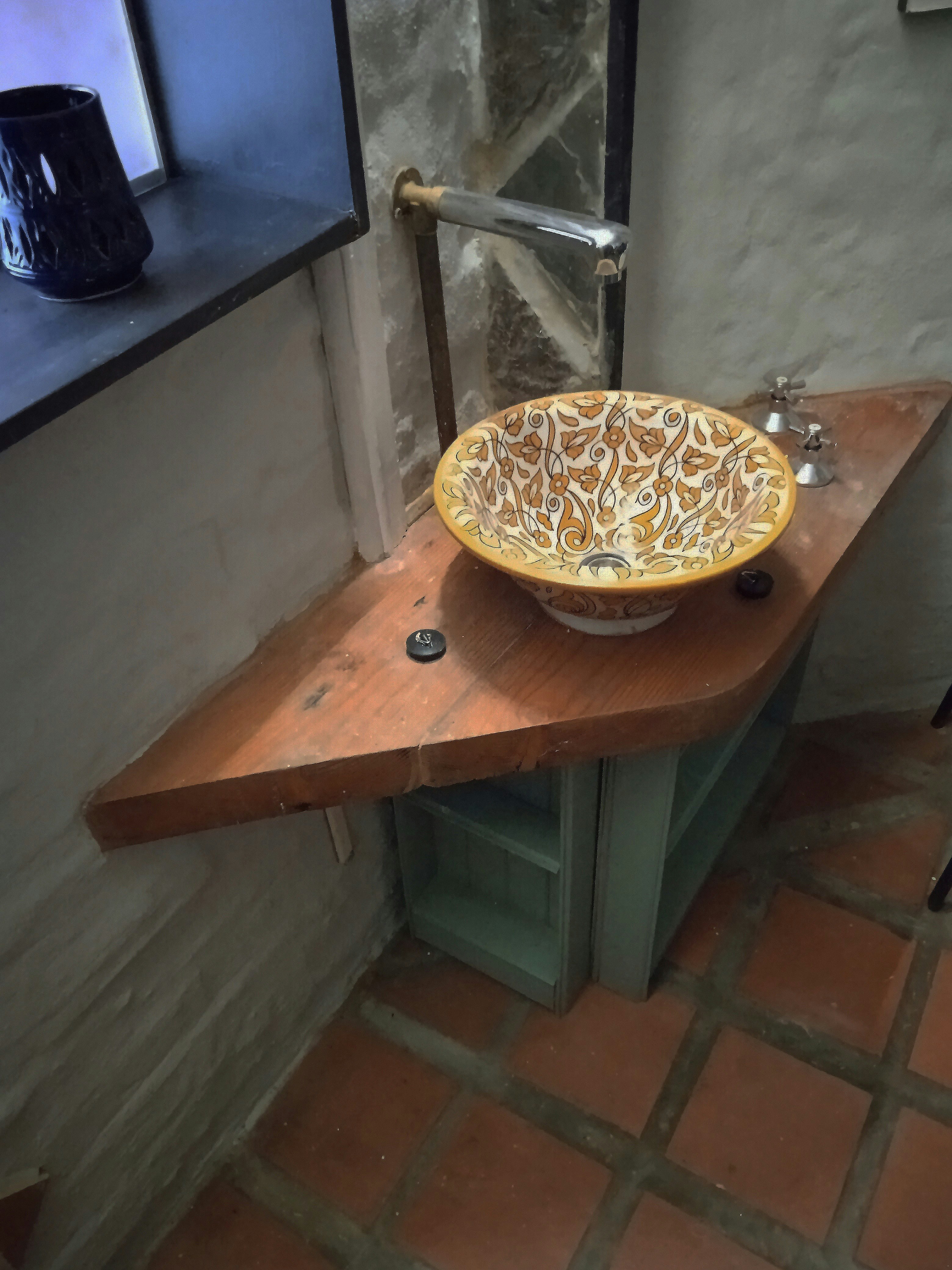 The apartment can accommodate a single person or a couple in a bedroom with a double bed. A separate room is equipped as a study. The shower is a room on its own, with a dressing area. It is equipped with an infrared heater to help with getting out of it in winter. The toilet is entirely separate, with a hand wash basin. The kitchen is equipped for self-catering with a fridge, induction stove, microwave, and sink, and the lounge is furnished with a TV with selected channels.