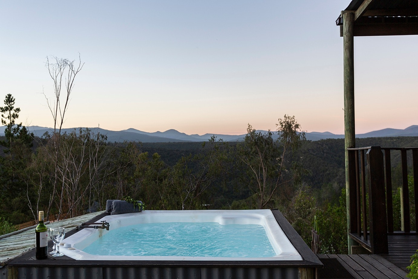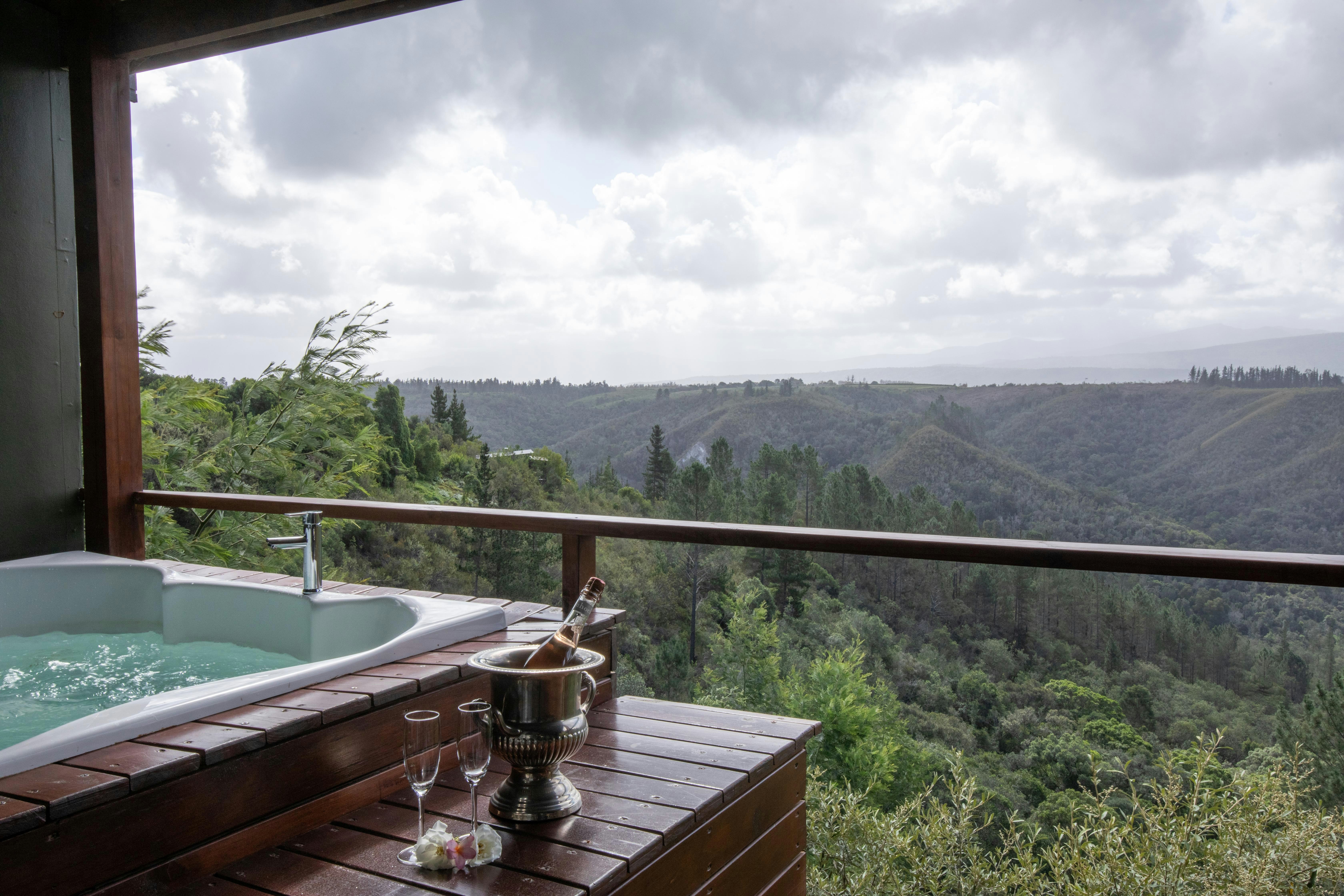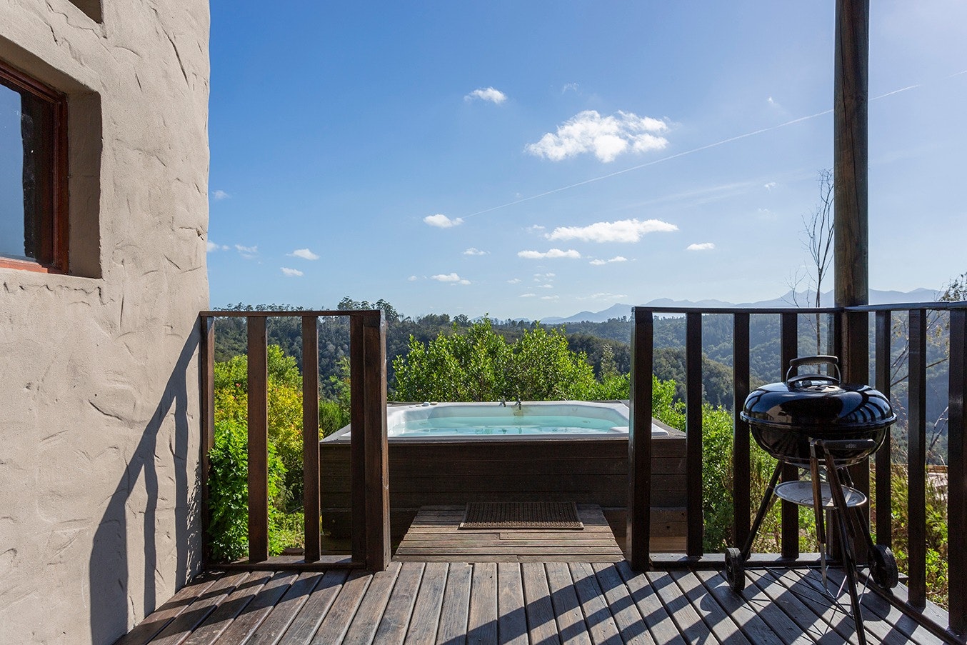 Outside, guests can enjoy the enclosed balcony with additional outdoor seating as well as a wood Braai, a jetted spa bath with breathtaking views of the surrounding mountains.