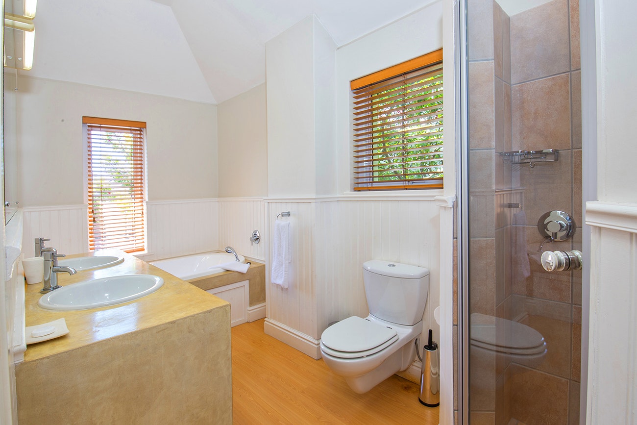 The house can accommodate up to 4 guests and comprises 2 bedrooms, 2 bathrooms, and an open-plan kitchen, dining, and living area. The bedrooms are located upstairs. The first bedroom is furnished with a queen-size bed and features a TV and an en-suite bathroom fitted with a bath, shower, toilet, and washbasin. The second bedroom is furnished with 2 single beds and makes use of the guest bathroom, which is fitted with shower facilities.