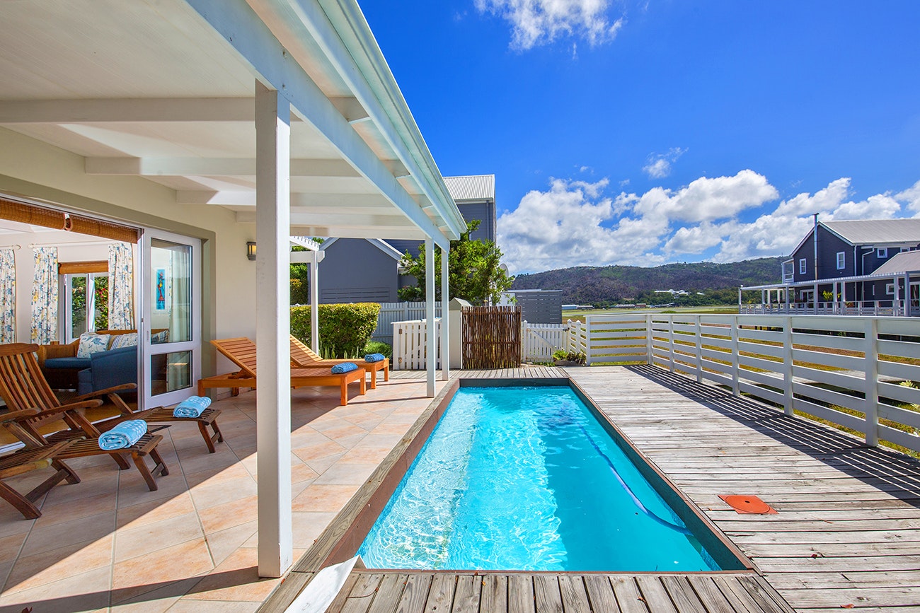 The living area opens to a sheltered patio with sun loungers and Weber braai facilities. The patio leads to a heated swimming pool and a deck with a dining table and chairs for guests to enjoy.