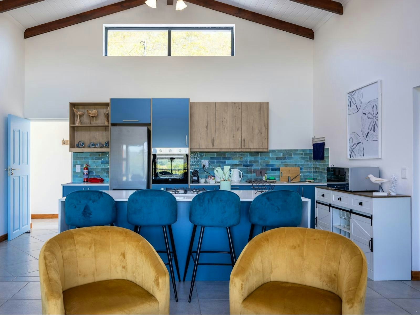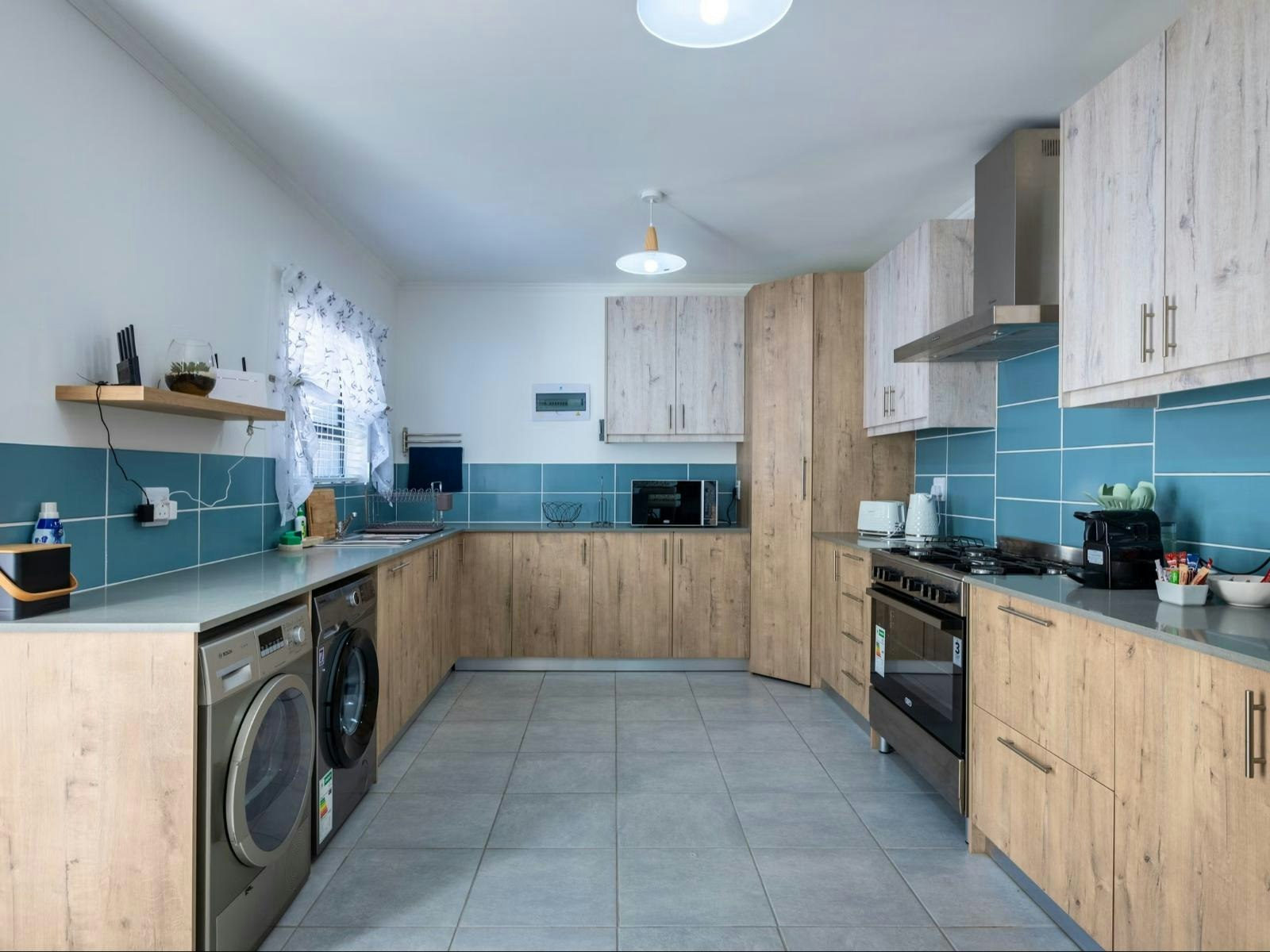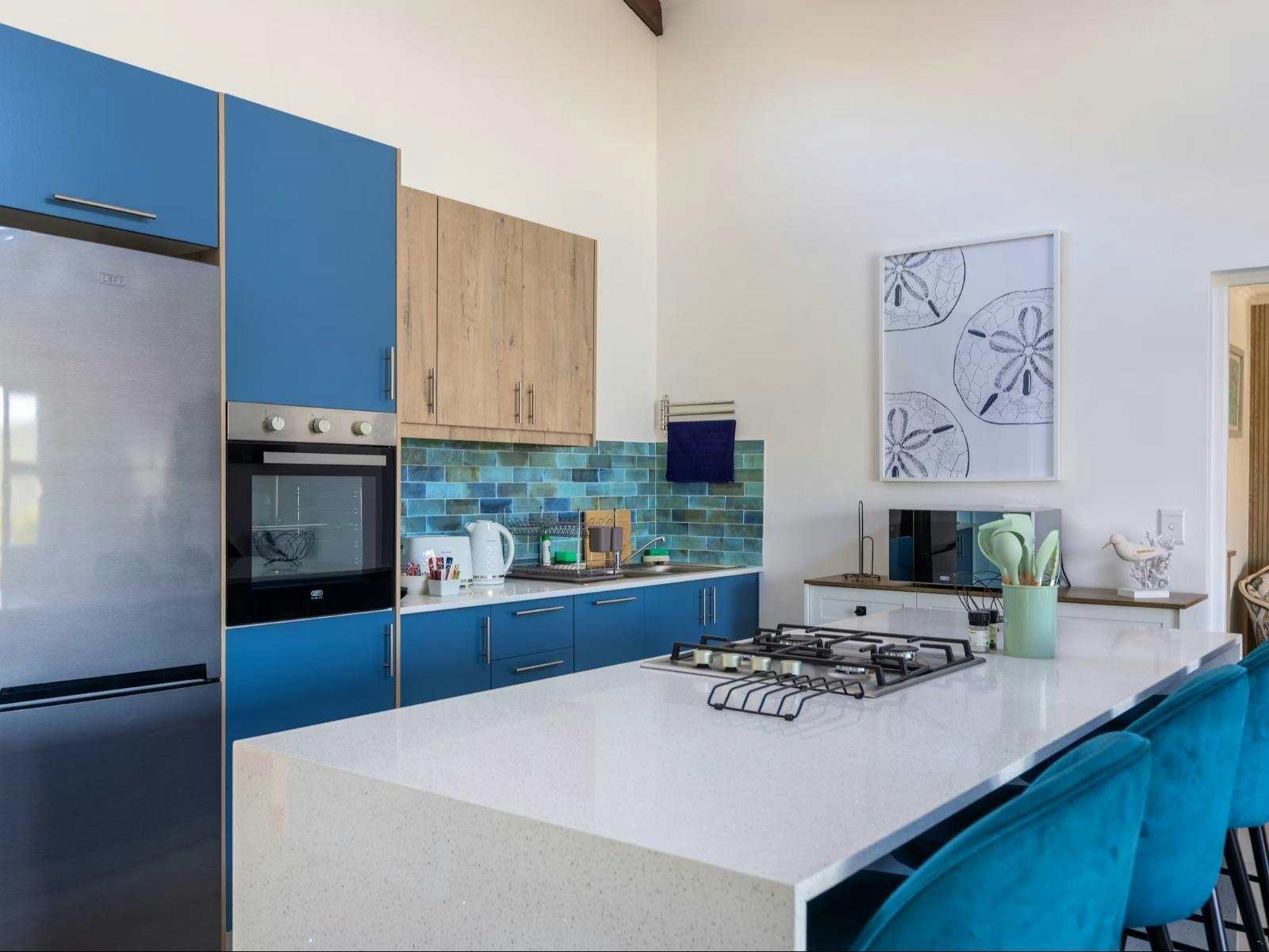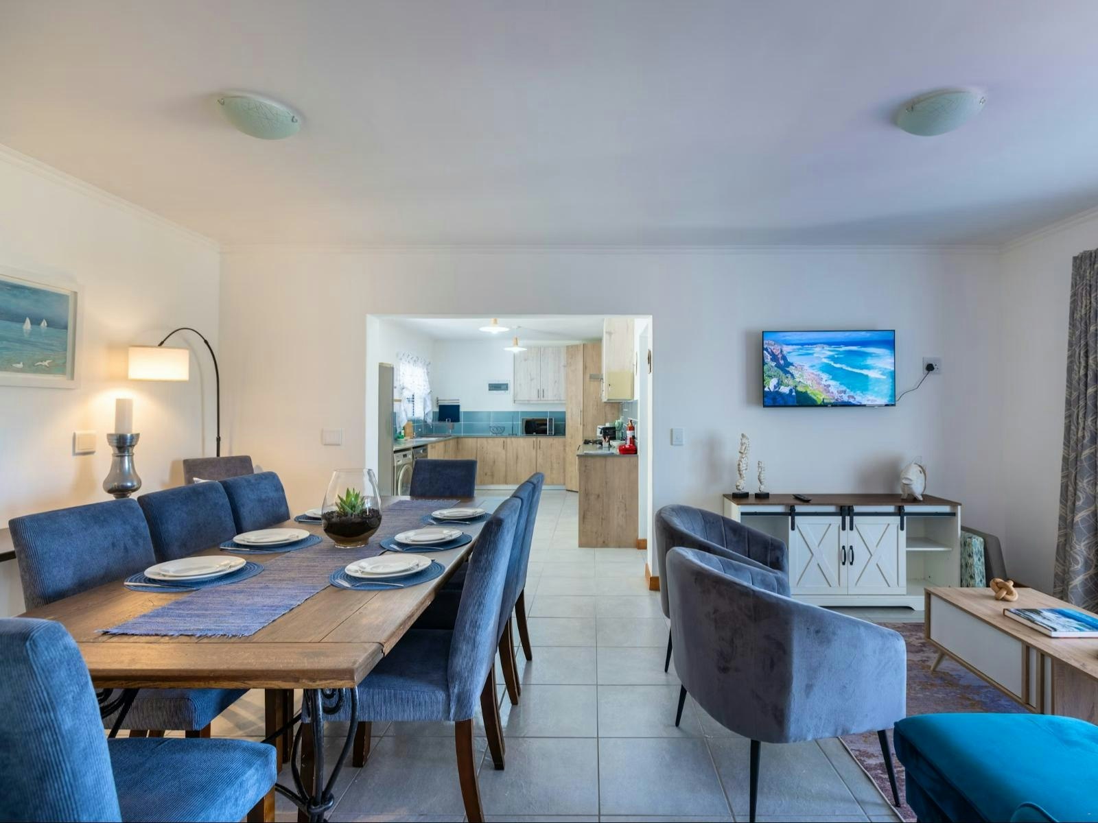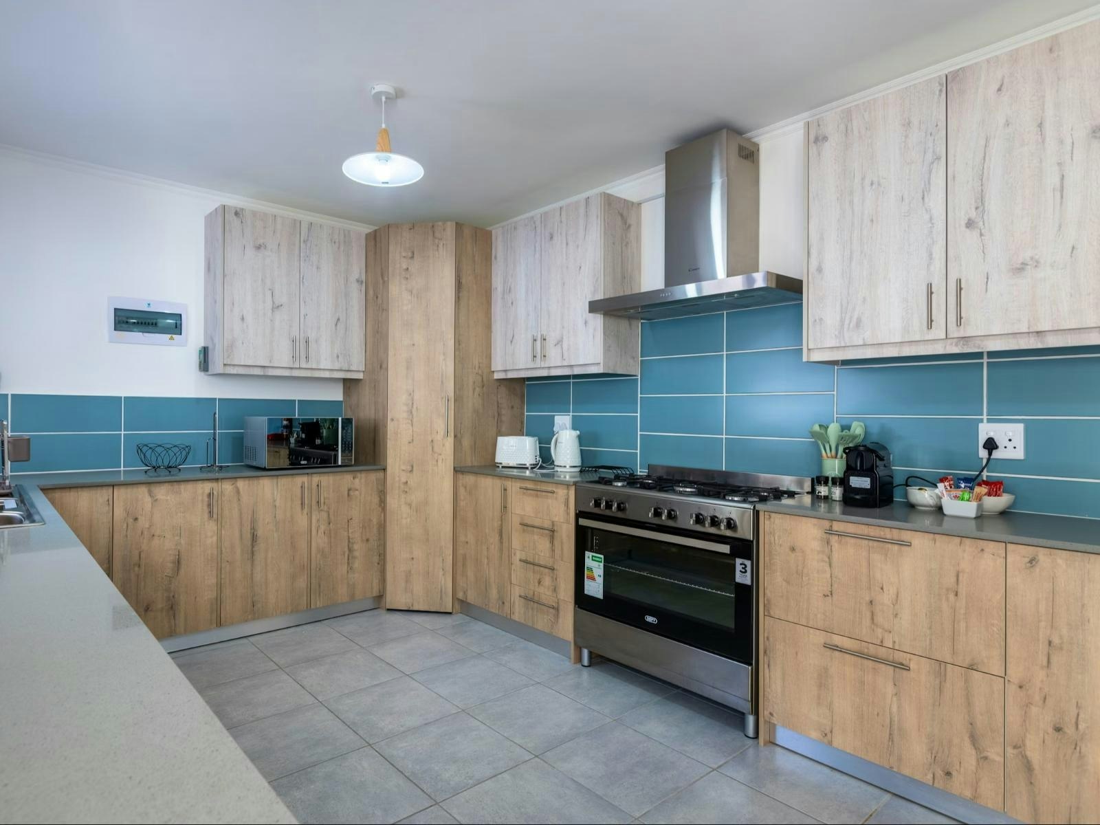 The fully fitted kitchens include a gas stove, electric oven, microwave, fridge-freezer, Nespresso coffee machine, kettle, toaster, cutlery, and crockery, along with either a central breakfast island with four stools or an eight-seater dining area. The lounge offers comfortable seating and a TV. Guests also have access to a swimming pool, braai facilities, and a Lapa bar.
