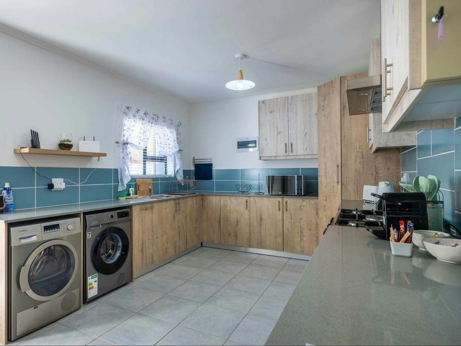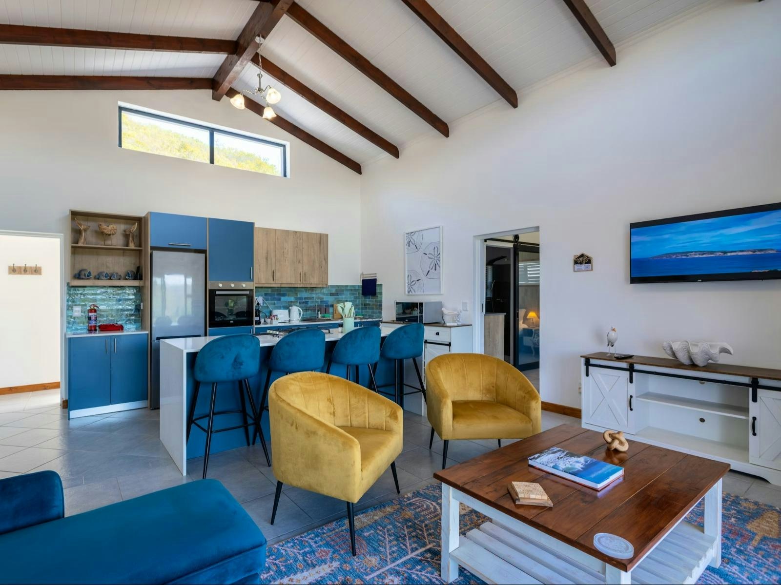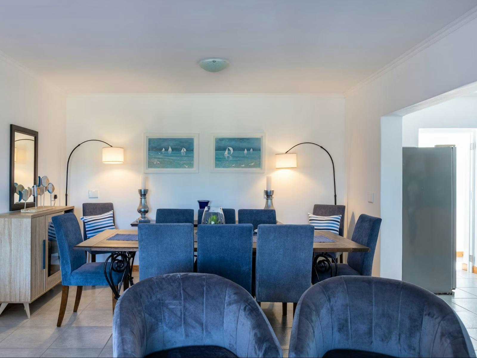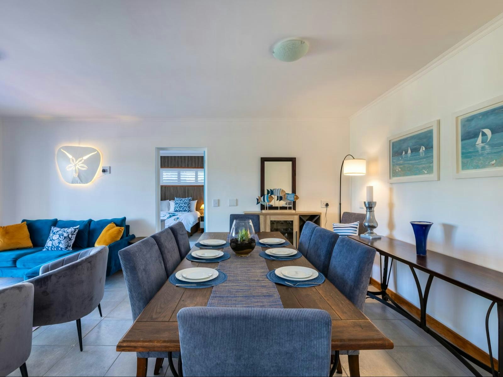 The fully fitted kitchens include a gas stove, electric oven, microwave, fridge-freezer, Nespresso coffee machine, kettle, toaster, cutlery, and crockery, along with either a central breakfast island with four stools or an eight-seater dining area. The lounge offers comfortable seating and a TV. Guests also have access to a swimming pool, braai facilities, and a Lapa bar.