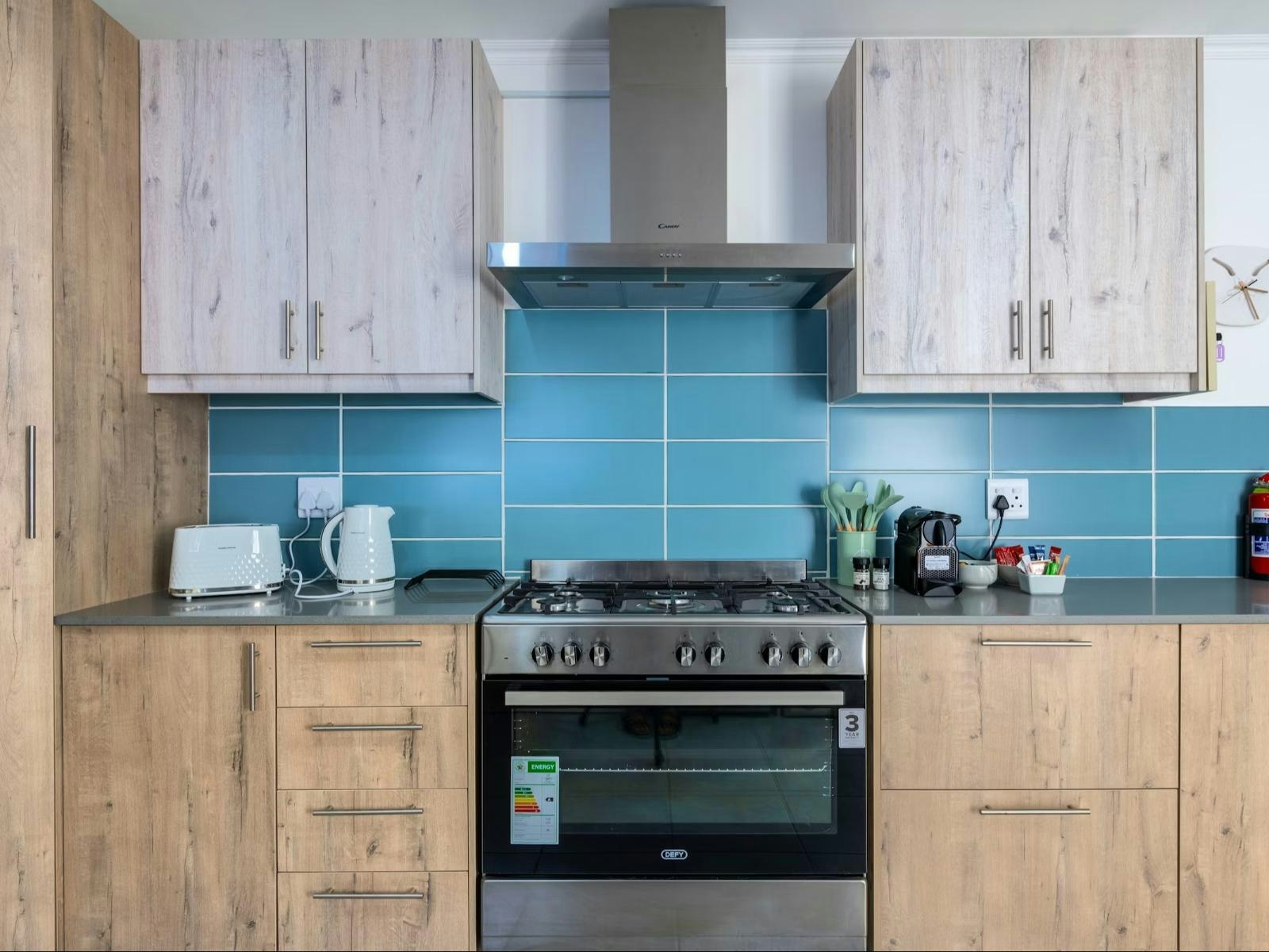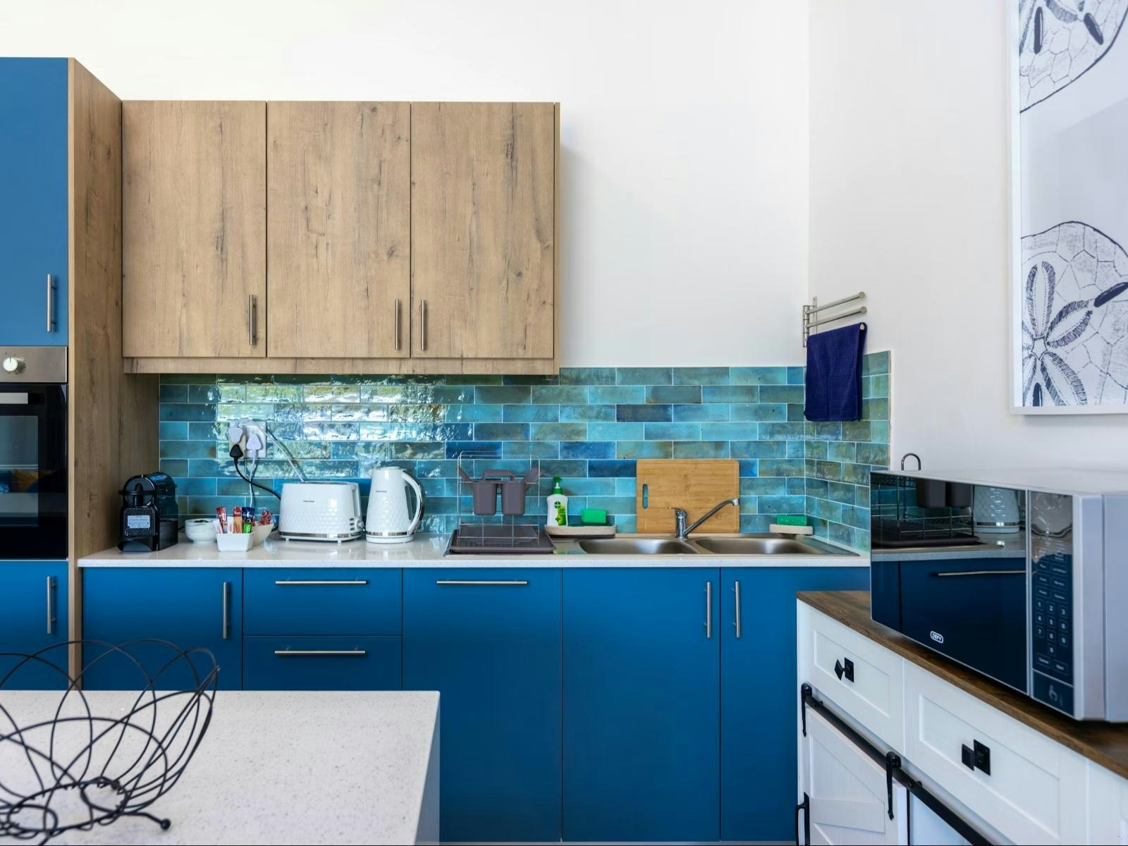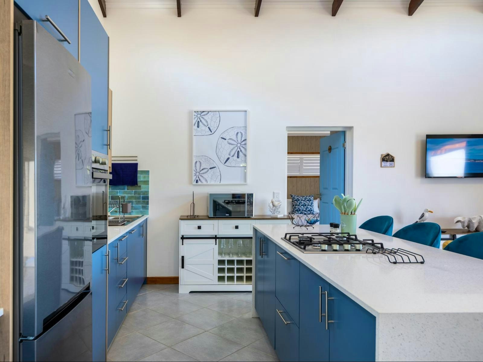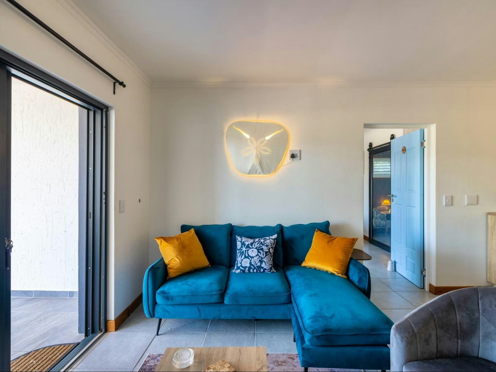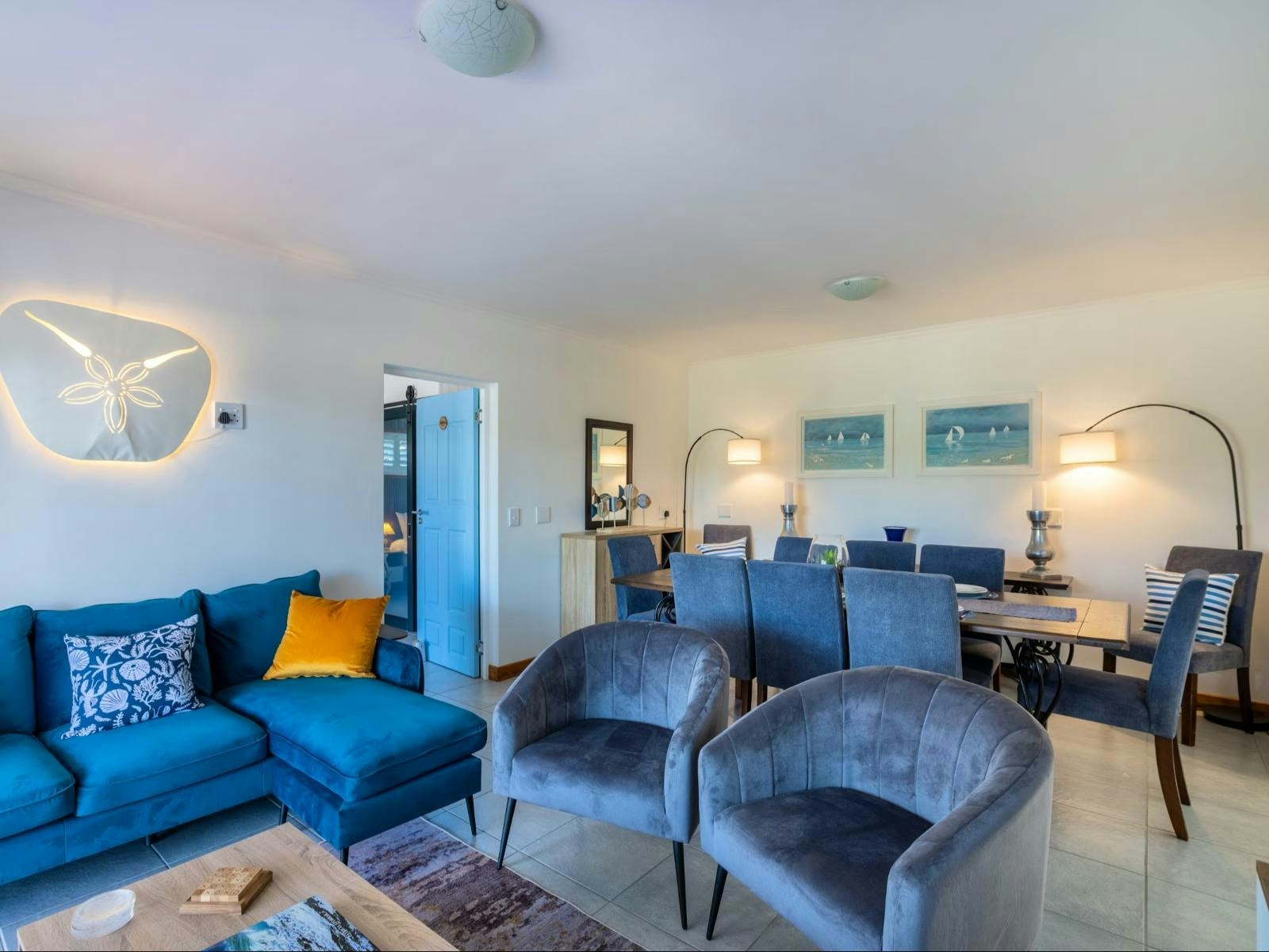 The fully fitted kitchens include a gas stove, electric oven, microwave, fridge-freezer, Nespresso coffee machine, kettle, toaster, cutlery, and crockery, along with either a central breakfast island with four stools or an eight-seater dining area. The lounge offers comfortable seating and a TV. Guests also have access to a swimming pool, braai facilities, and a Lapa bar.