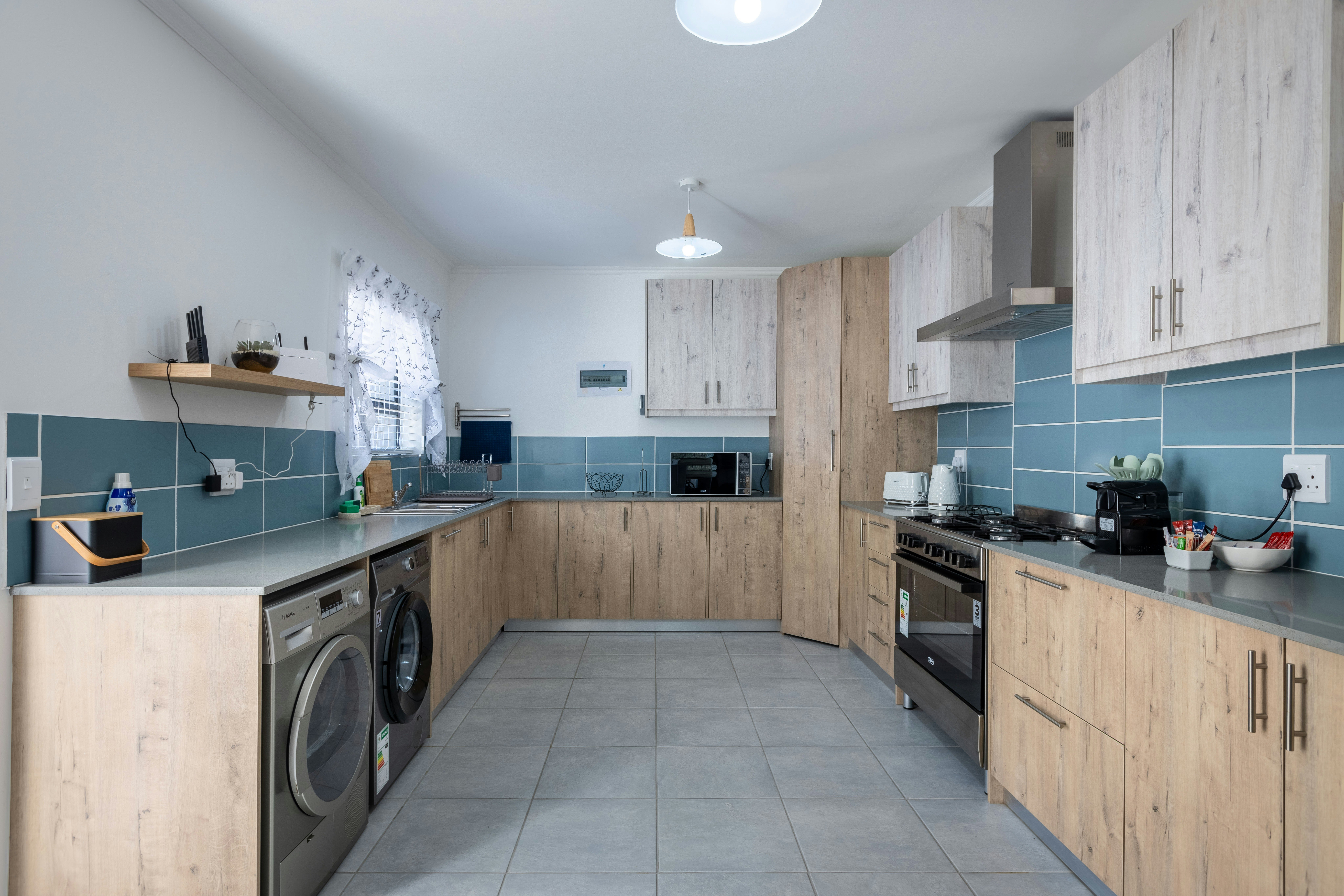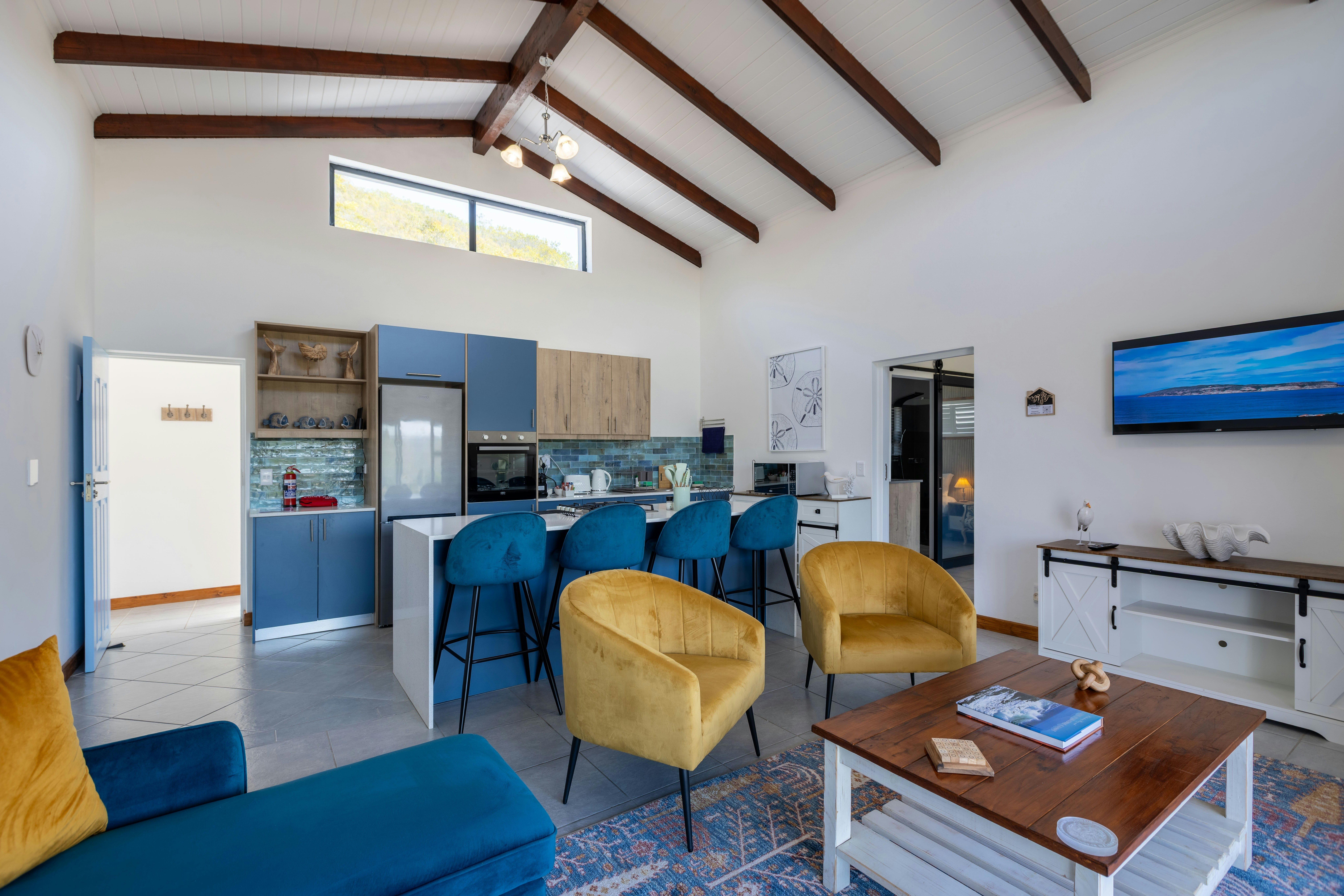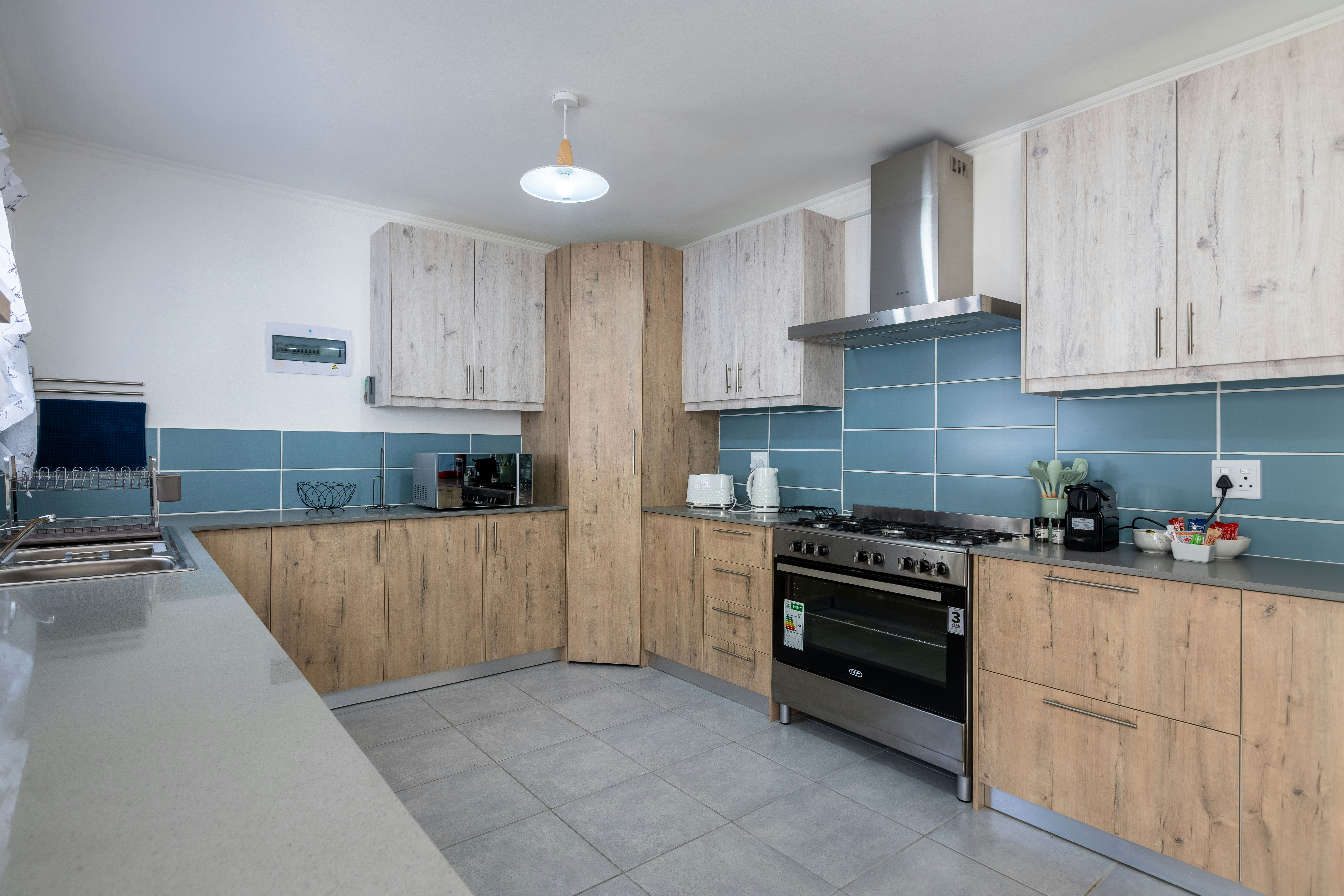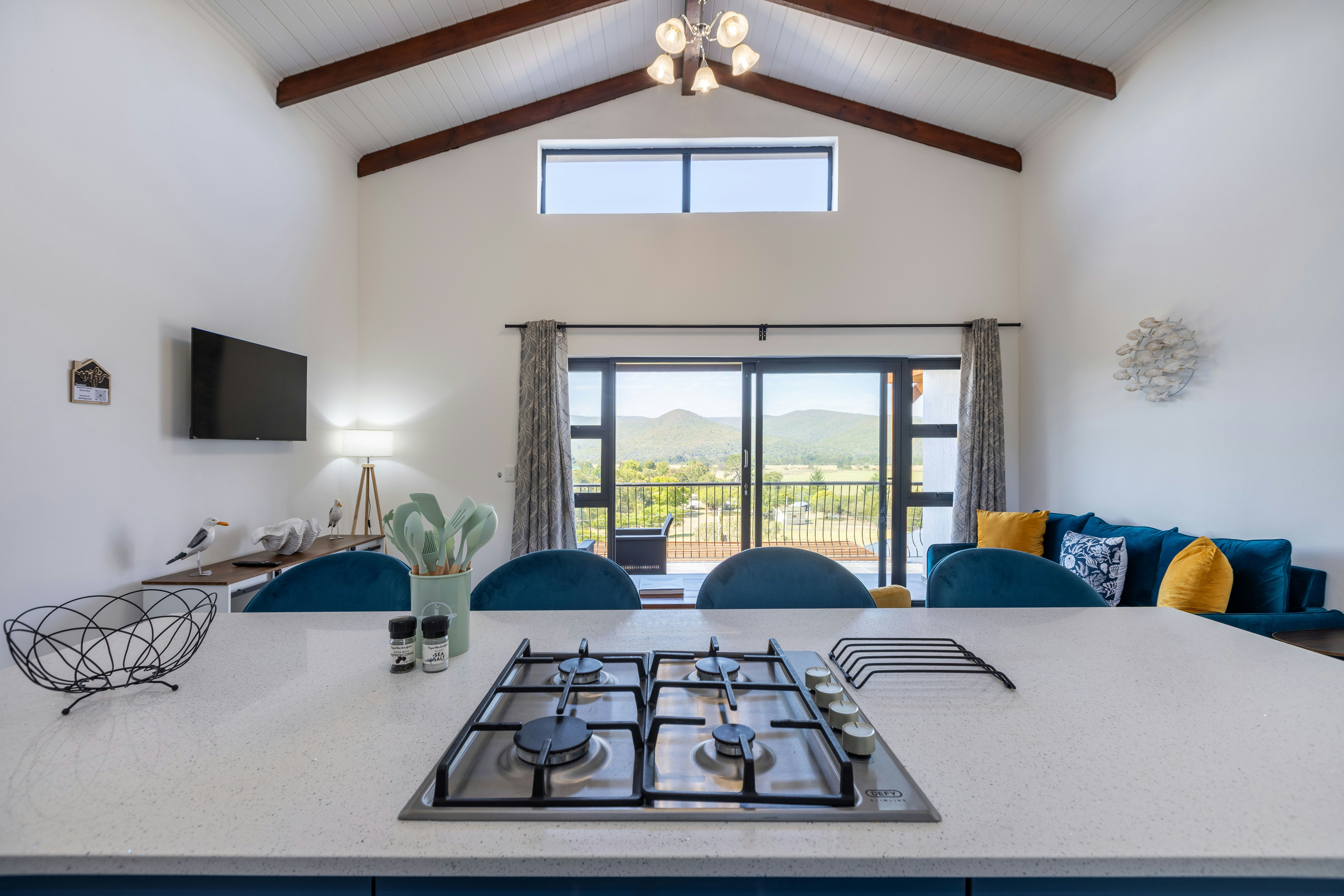 The fully fitted kitchens include a gas stove, electric oven, microwave, fridge-freezer, Nespresso coffee machine, kettle, toaster, cutlery, and crockery, along with either a central breakfast island with four stools or an eight-seater dining area. The lounge offers comfortable seating and a TV. Guests also have access to a swimming pool, braai facilities, and a Lapa bar.