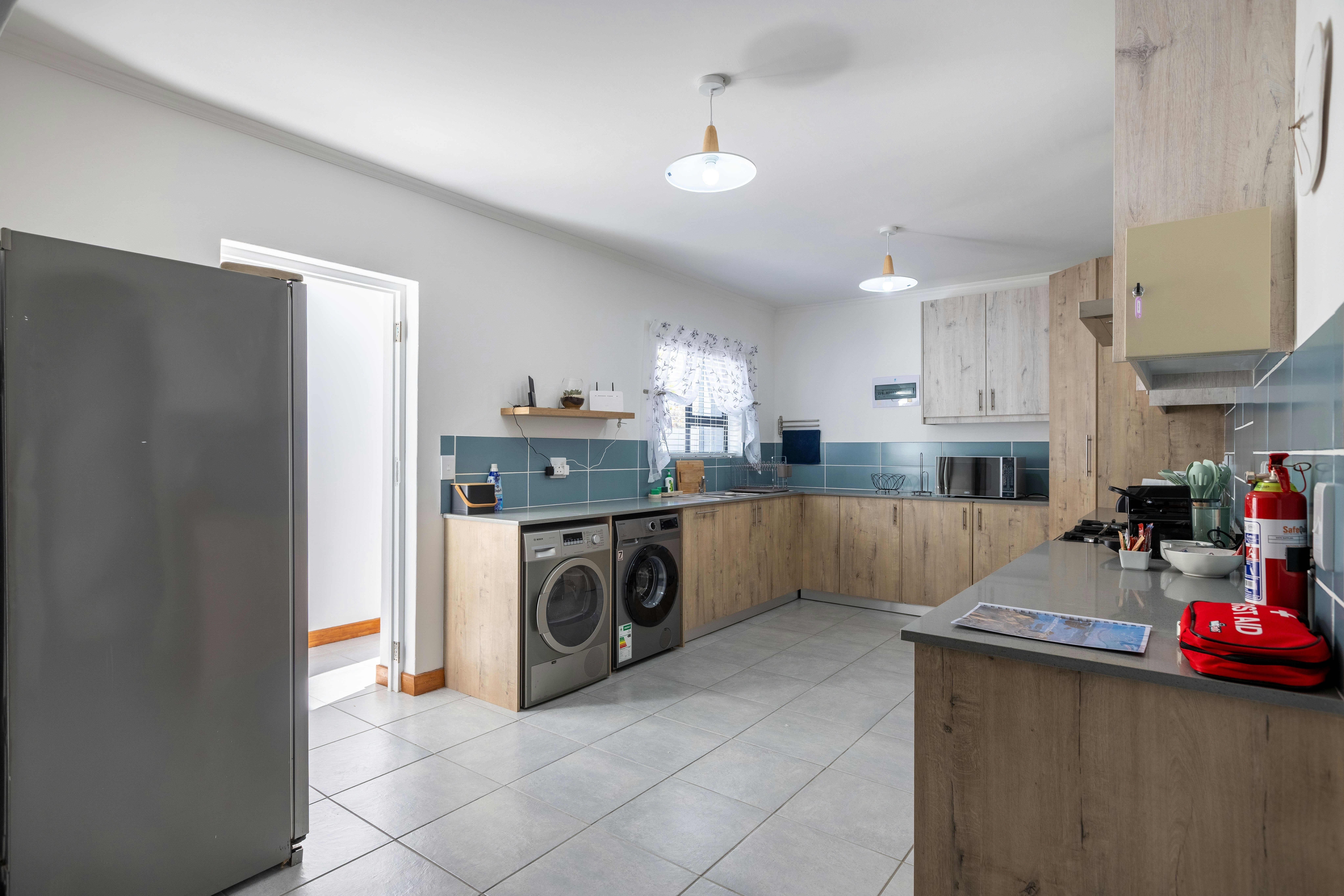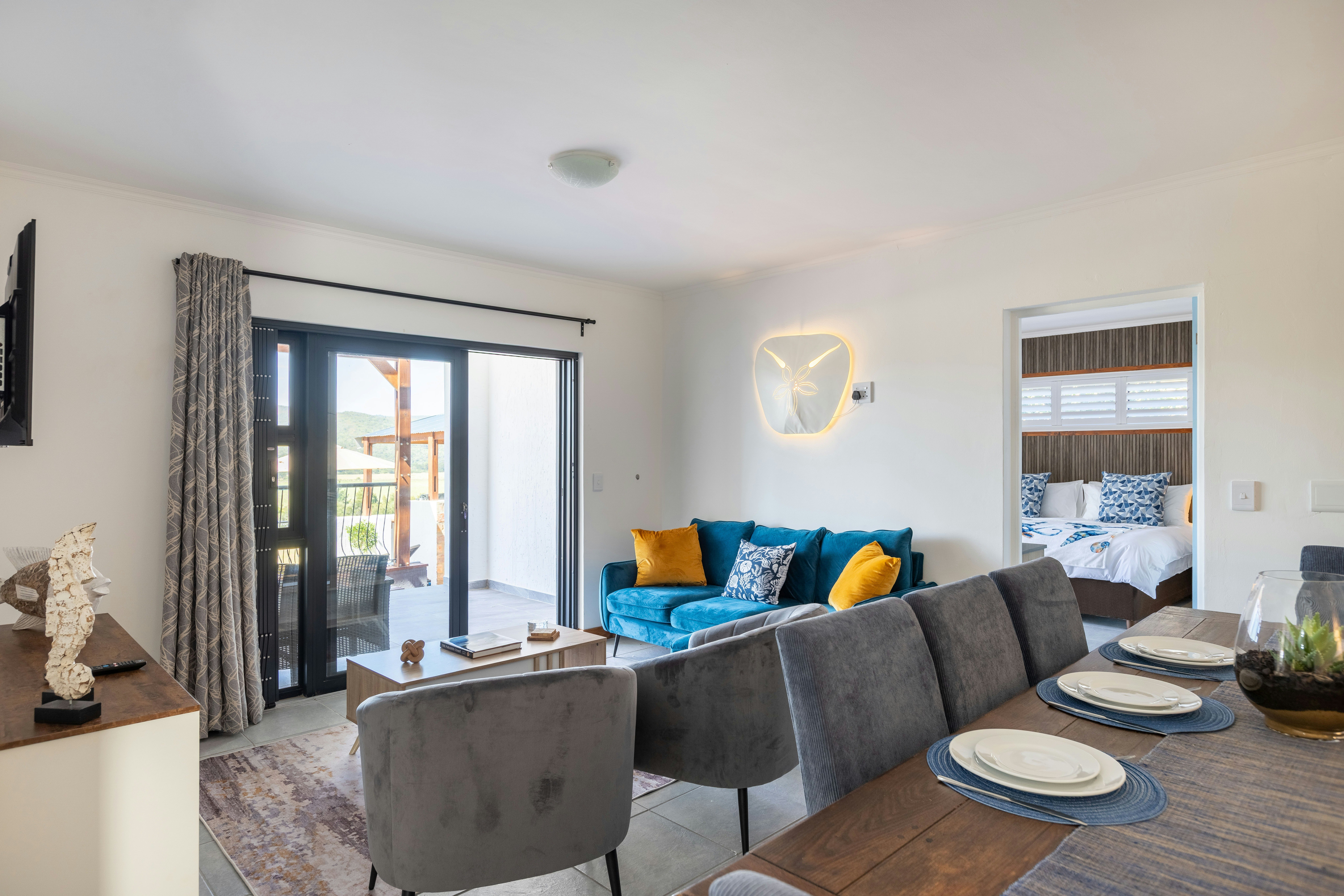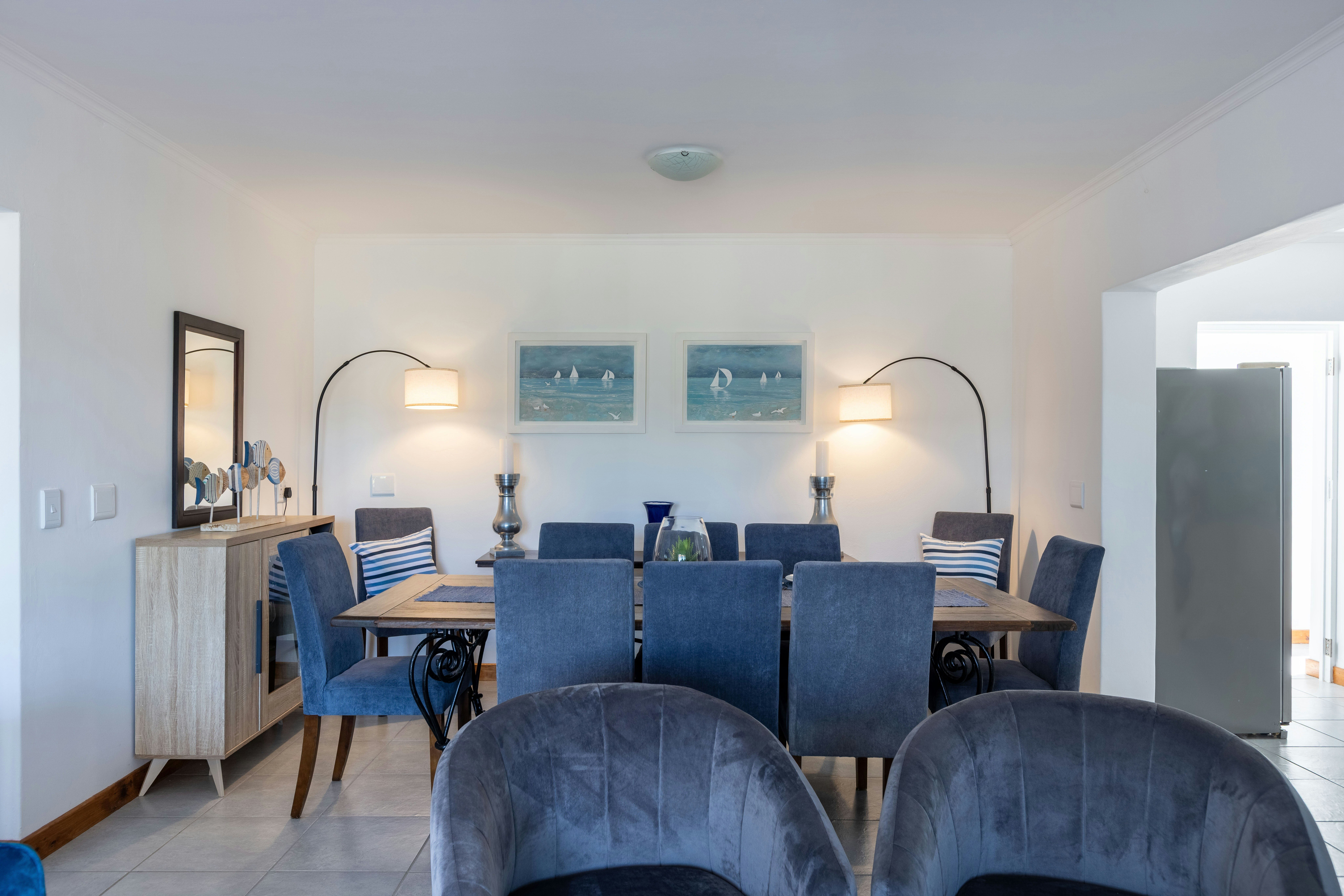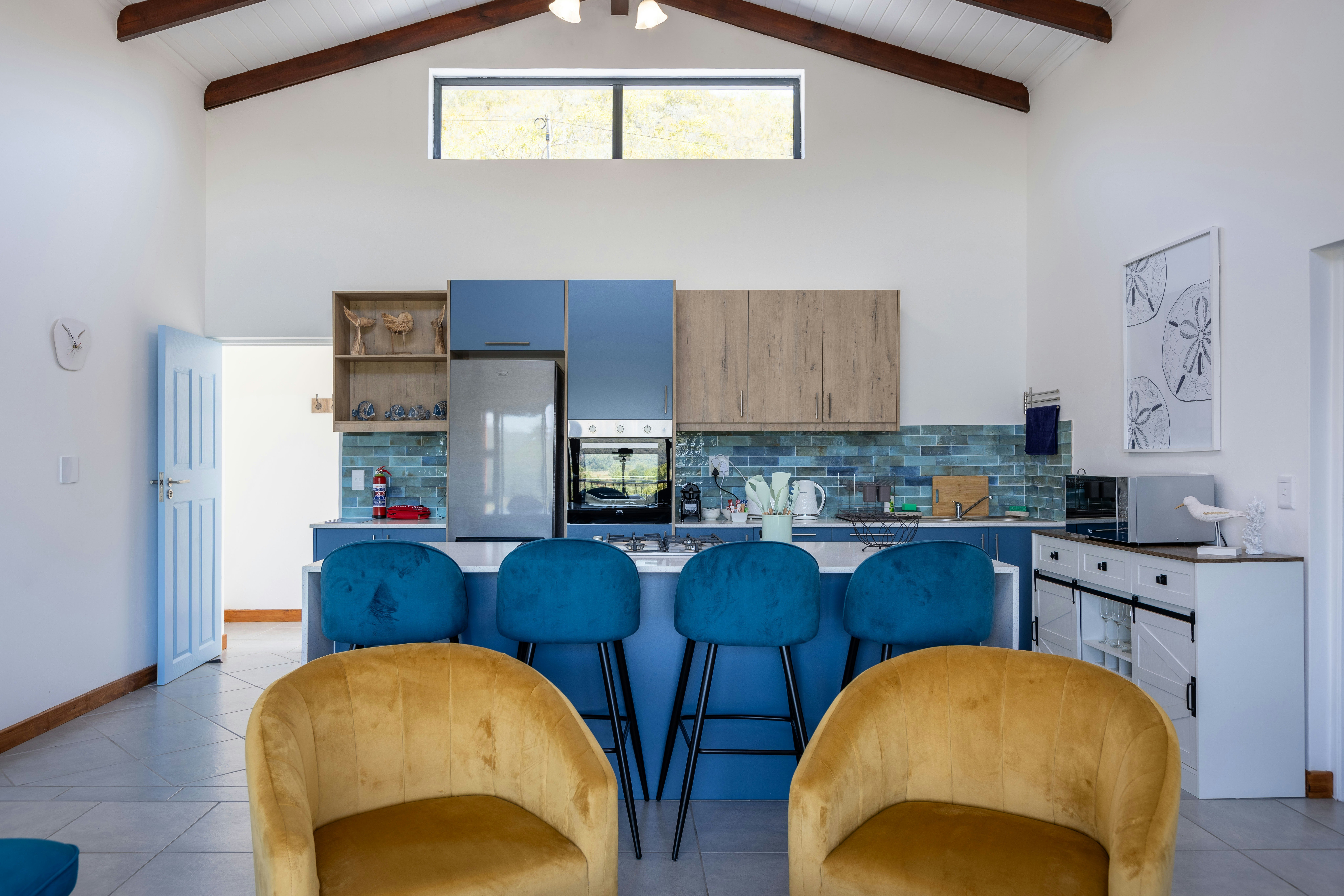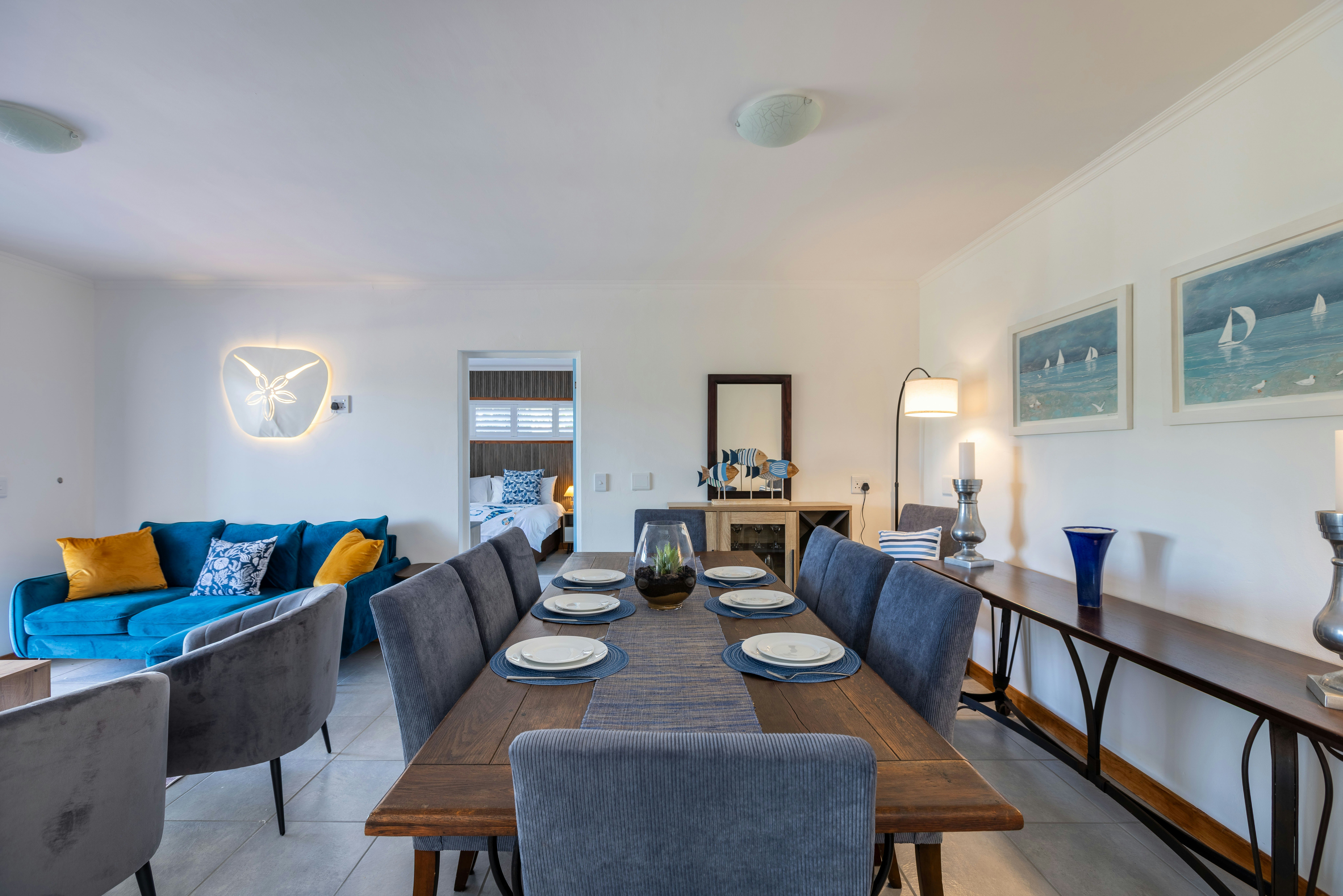 The fully fitted kitchens include a gas stove, electric oven, microwave, fridge-freezer, Nespresso coffee machine, kettle, toaster, cutlery, and crockery, along with either a central breakfast island with four stools or an eight-seater dining area. The lounge offers comfortable seating and a TV. Guests also have access to a swimming pool, braai facilities, and a Lapa bar.