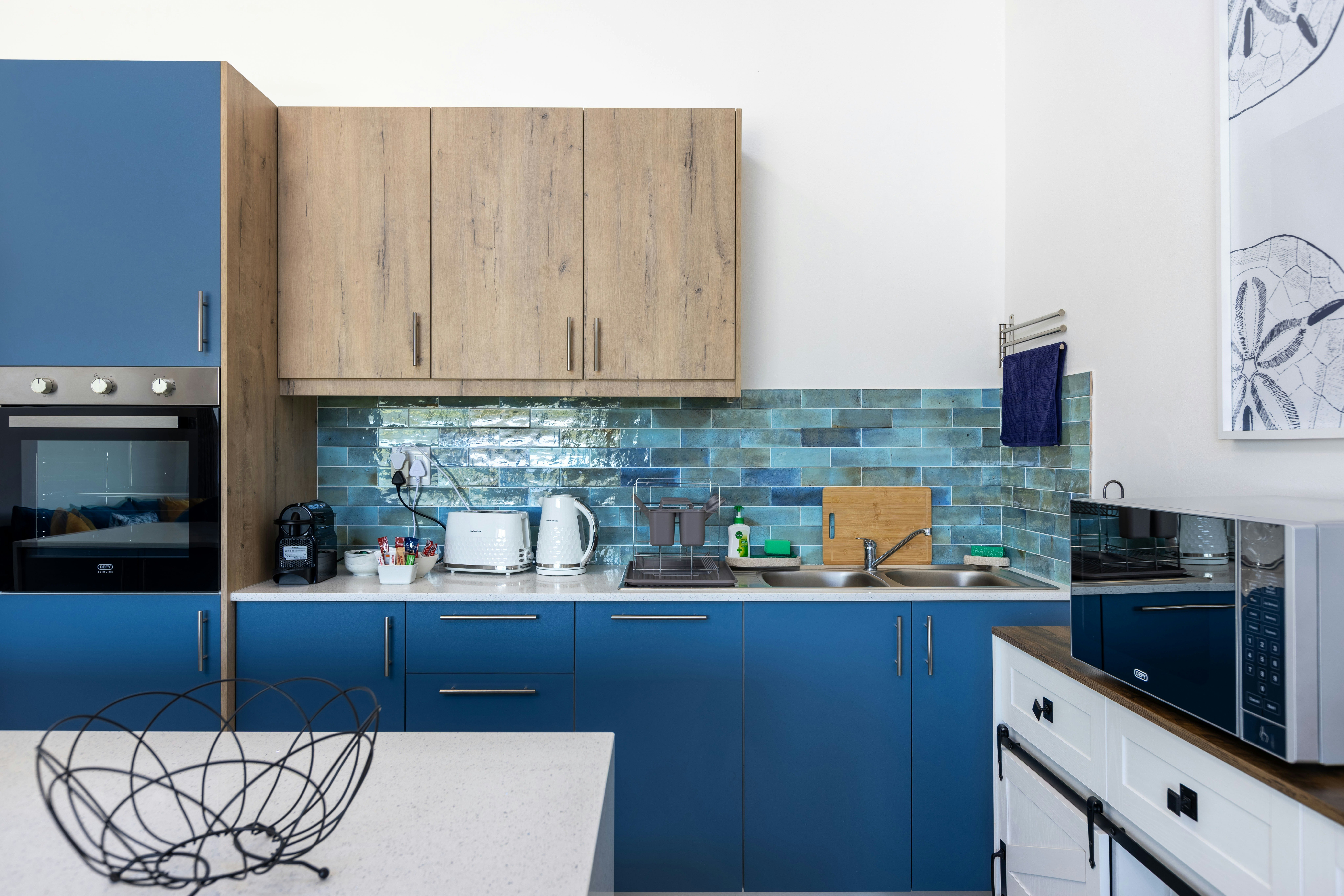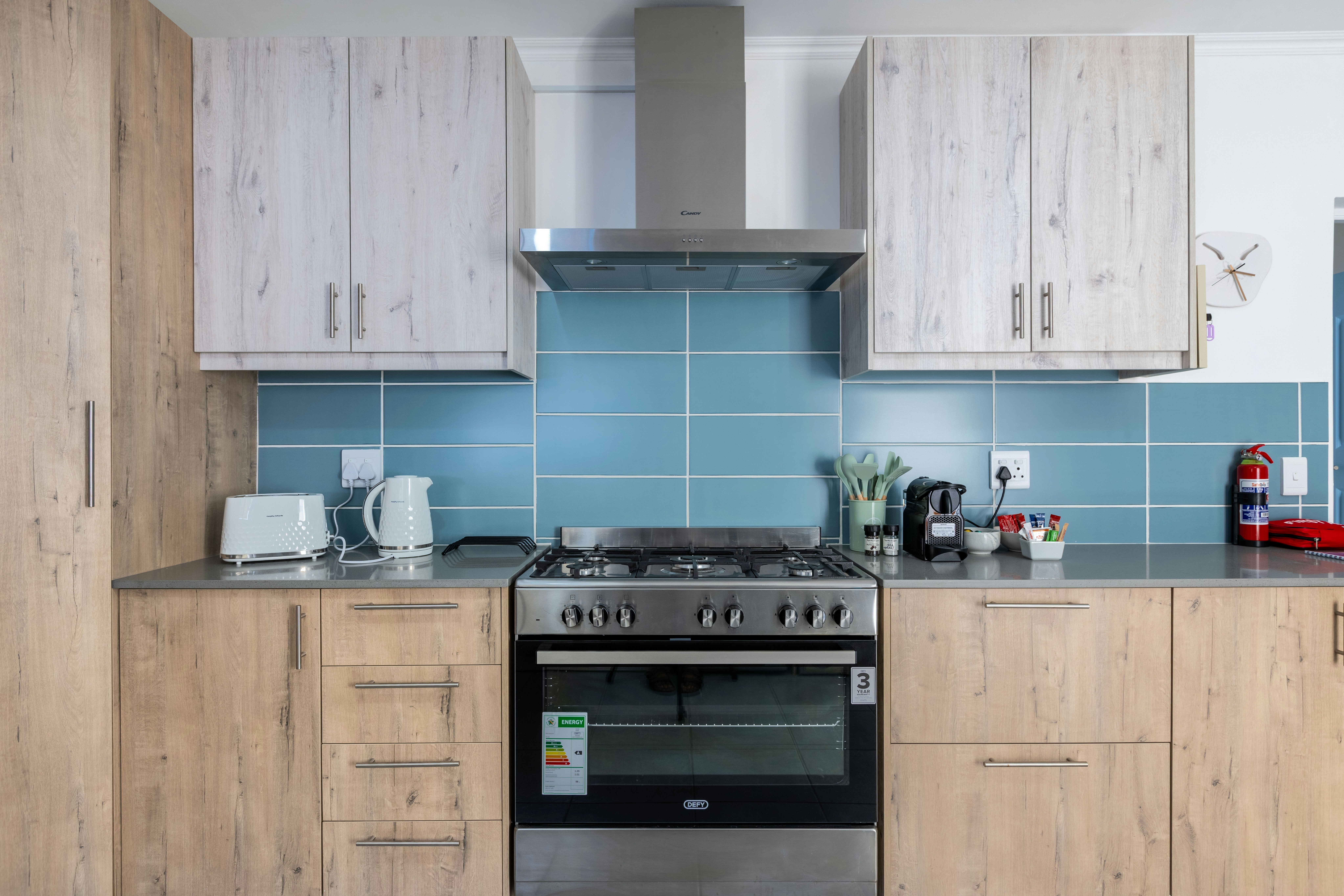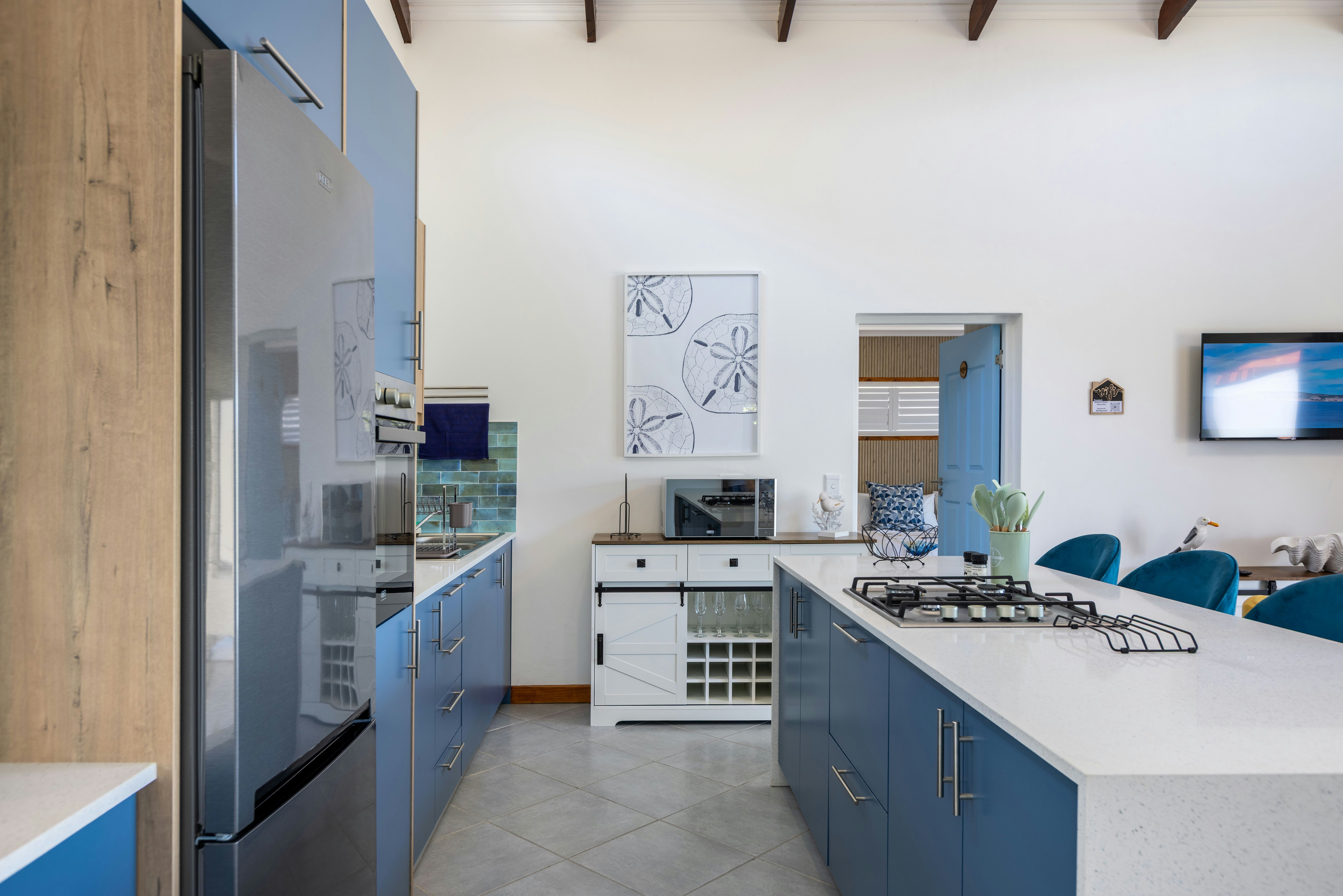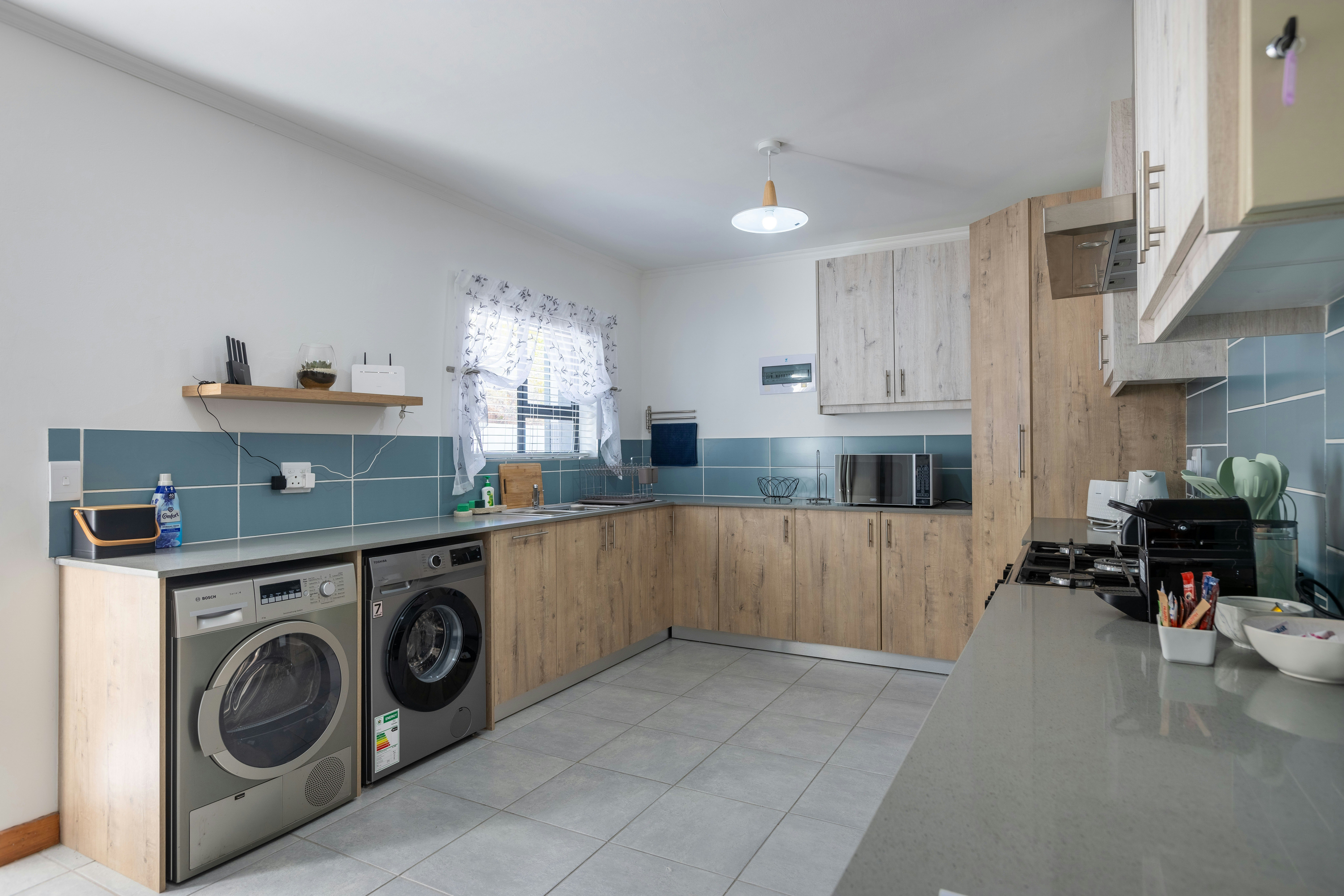 The fully fitted kitchens include a gas stove, electric oven, microwave, fridge-freezer, Nespresso coffee machine, kettle, toaster, cutlery, and crockery, along with either a central breakfast island with four stools or an eight-seater dining area. The lounge offers comfortable seating and a TV. Guests also have access to a swimming pool, braai facilities, and a Lapa bar.