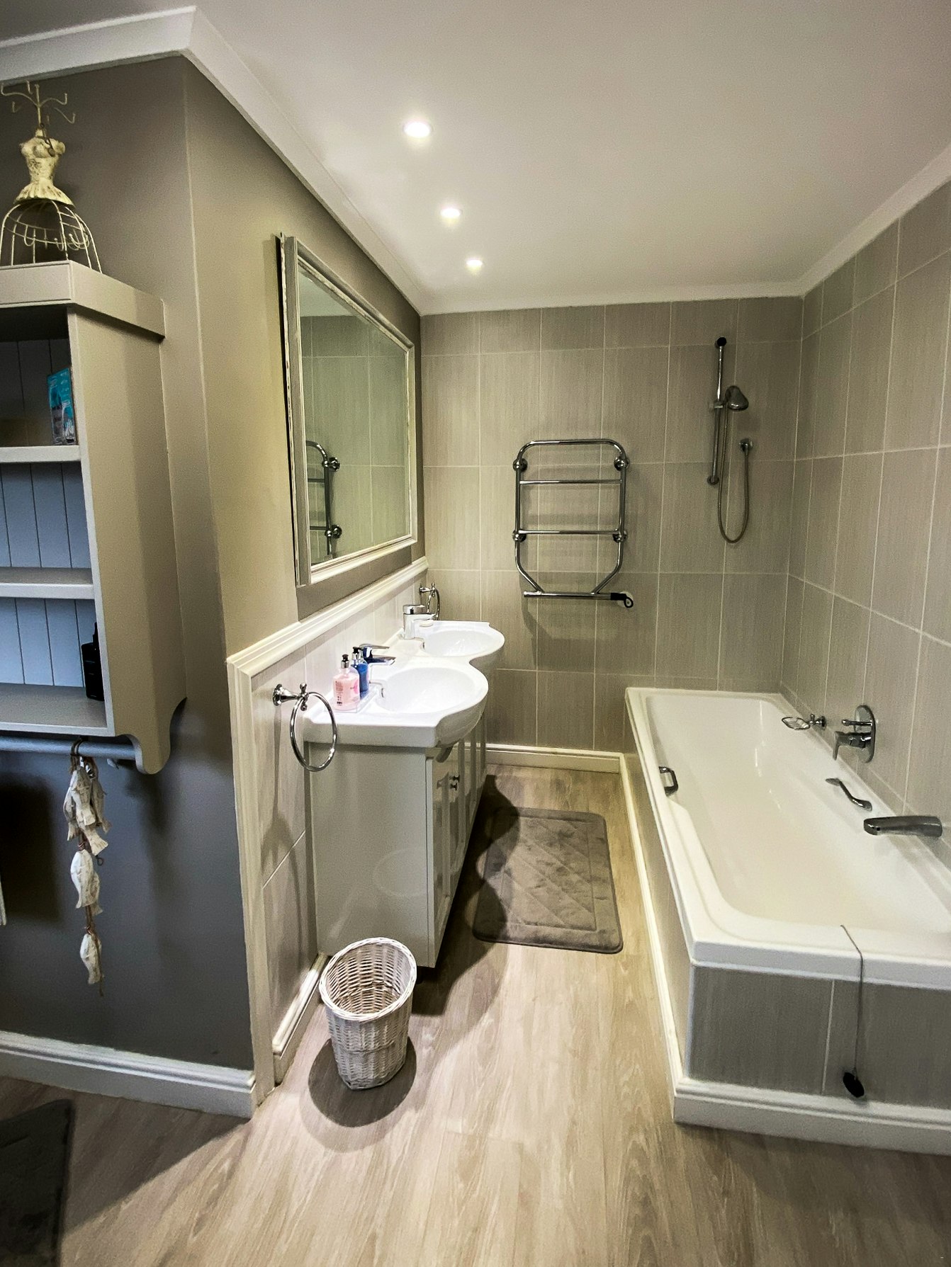 Opening onto the balcony, the main bedroom is furnished with a king-size bed, and has an en-suite bathroom fitted with a bath, and a shower. The other 2 bedrooms each contain a double bed, and overlook the Helderberg. The 2 bedrooms share the use of a bathroom fitted with a bath, and a shower. For convenience, linen and bath towels are provided.
