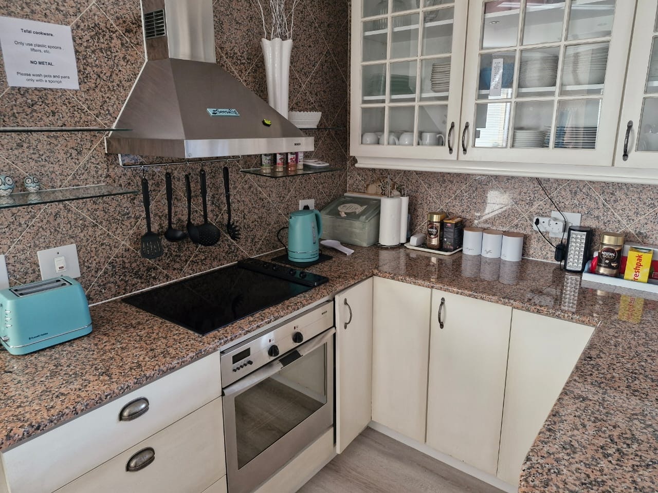 The modern kitchen is equipped with a microwave, a stove and oven, a fridge, as well as tea- and coffee-making facilities. The dining area is furnished with a 6-seater dining table. Guests can relax in the lounge, which is equipped with a smart TV, and Wi-Fi access is available. The living area opens onto the balcony, which is furnished with a dining table, overlooking the ocean.