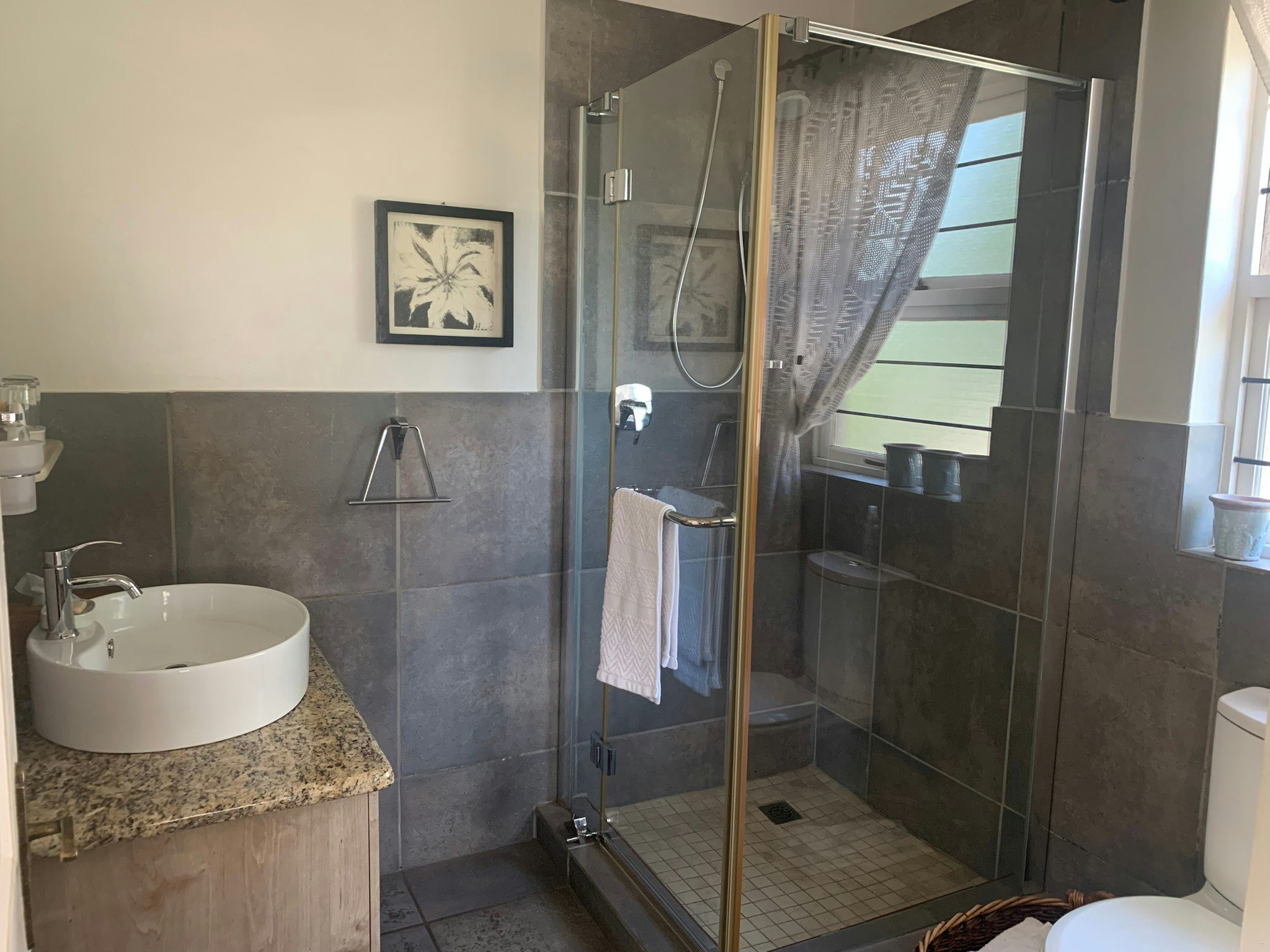 Blessing Gastekamer can accommodate 2 guests and comprises 1 bedroom and 1 bathroom. The main bedroom features a queen-size bed and an en-suite bathroom with a washbasin, toilet, shower, and bath.