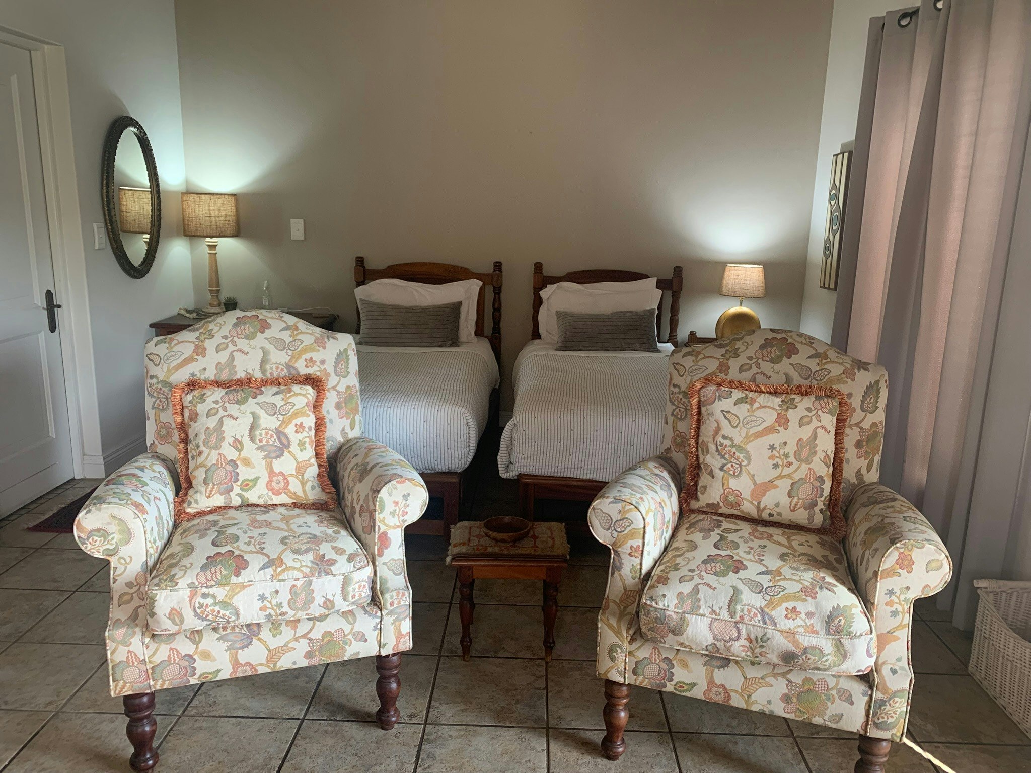 Superior luxury features 2 single beds and an en-suite bathroom with a shower, toilet and washbasin. In addition to the sleeping area, it offers a spacious living area with comfortable armchairs in front of a TV, as well as a self-catering area equipped with a fridge, microwave oven, and tea- and coffee-making facilities.