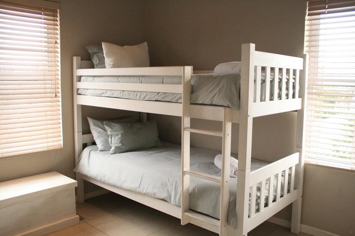 This unit comprises 3 bedrooms, the main bedroom is furnished with a queen-size bed and a dressing table, and an en-suite bathroom fitted with a shower, bath, toilet, and basin. The second bedroom features 2 single beds, and the third room features a bunk bed. The shared bathroom is fitted with a shower, toilet, and basin.