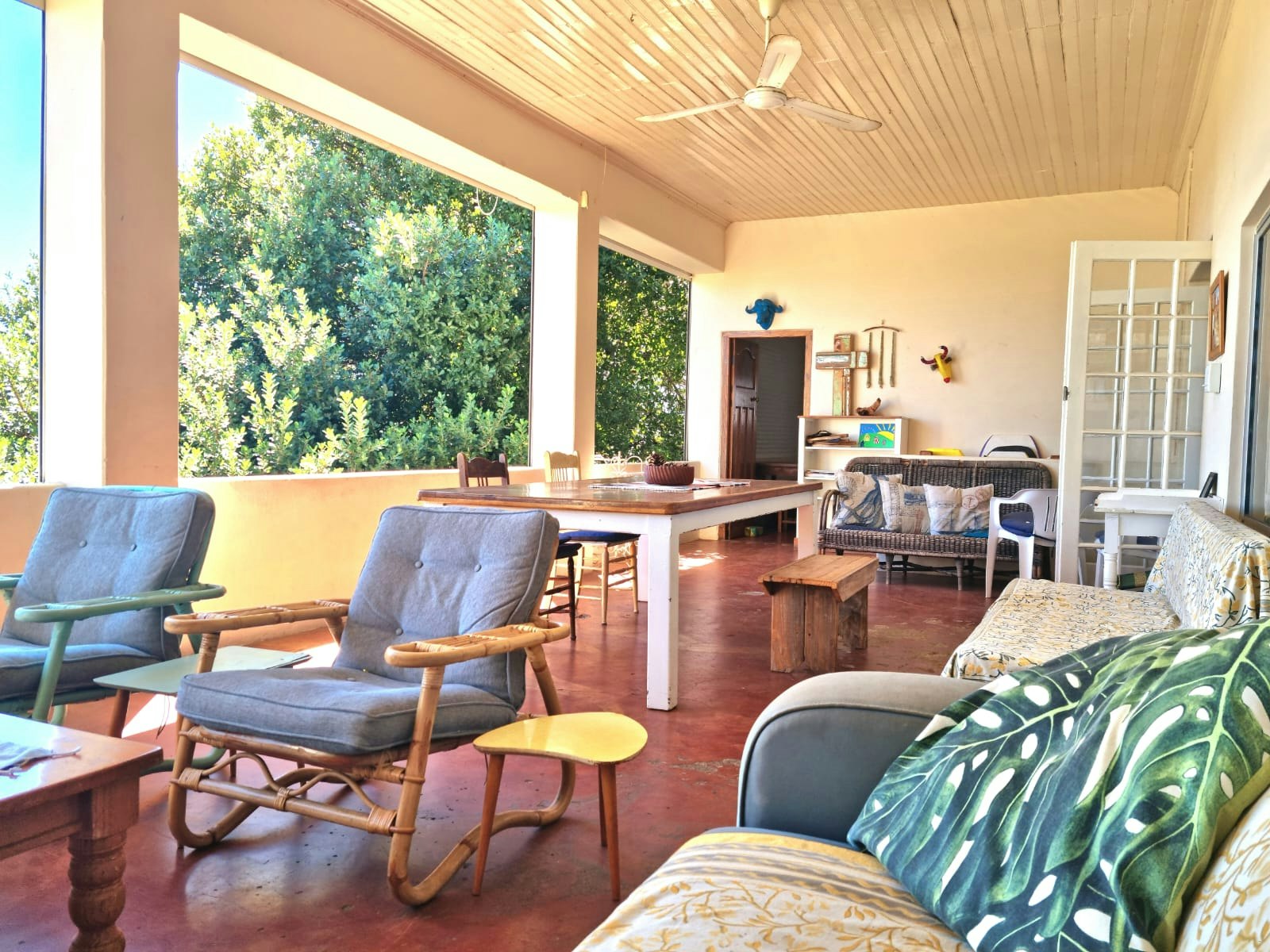 The living area opens onto a large covered patio with a sea view, outdoor seating, a dining table, and chairs. Ample secure off-street parking is available. There is an alarm and armed response. Capped WiFi is provided.