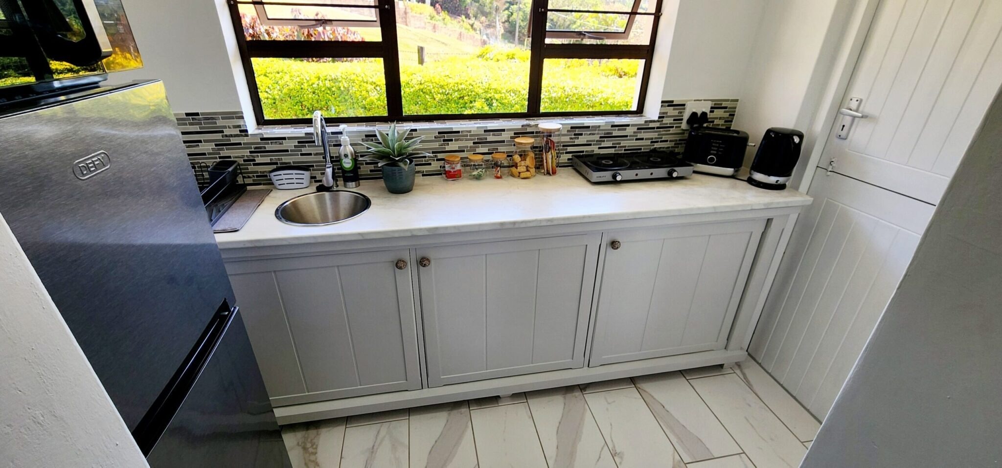 The kitchenette is equipped with a fridge-freezer, 2-plate induction stove, microwave, cutlery and crockery, and tea- and coffee-making facilities. The living area is furnished with a comfortable couch, a TV with DSTV and a dining table. Access to Wi-Fi is available.