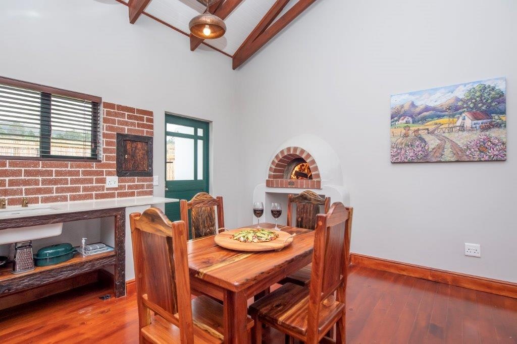 Die oopplan-kombuis is met 'n yskas-vrieskas, gasstoof, oond, mikrogolf, eetgerei, breekware en tee- en koffiemaakgeriewe toegerus. Die eetarea het sitplek vir 4 en die sitarea het 'n sitkamerstel, binnebraai en pizza-oond. Vars brood en plaasmelk word soggens bedien. Daar word tee, koffie, botter, beskuit en 6 eiers met aankoms voorsien.