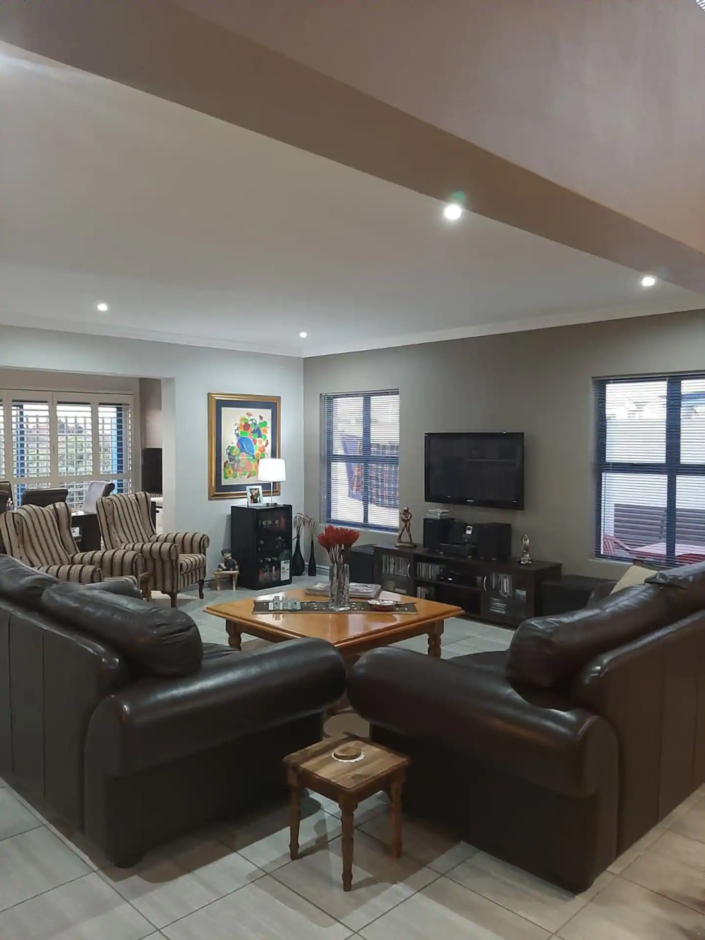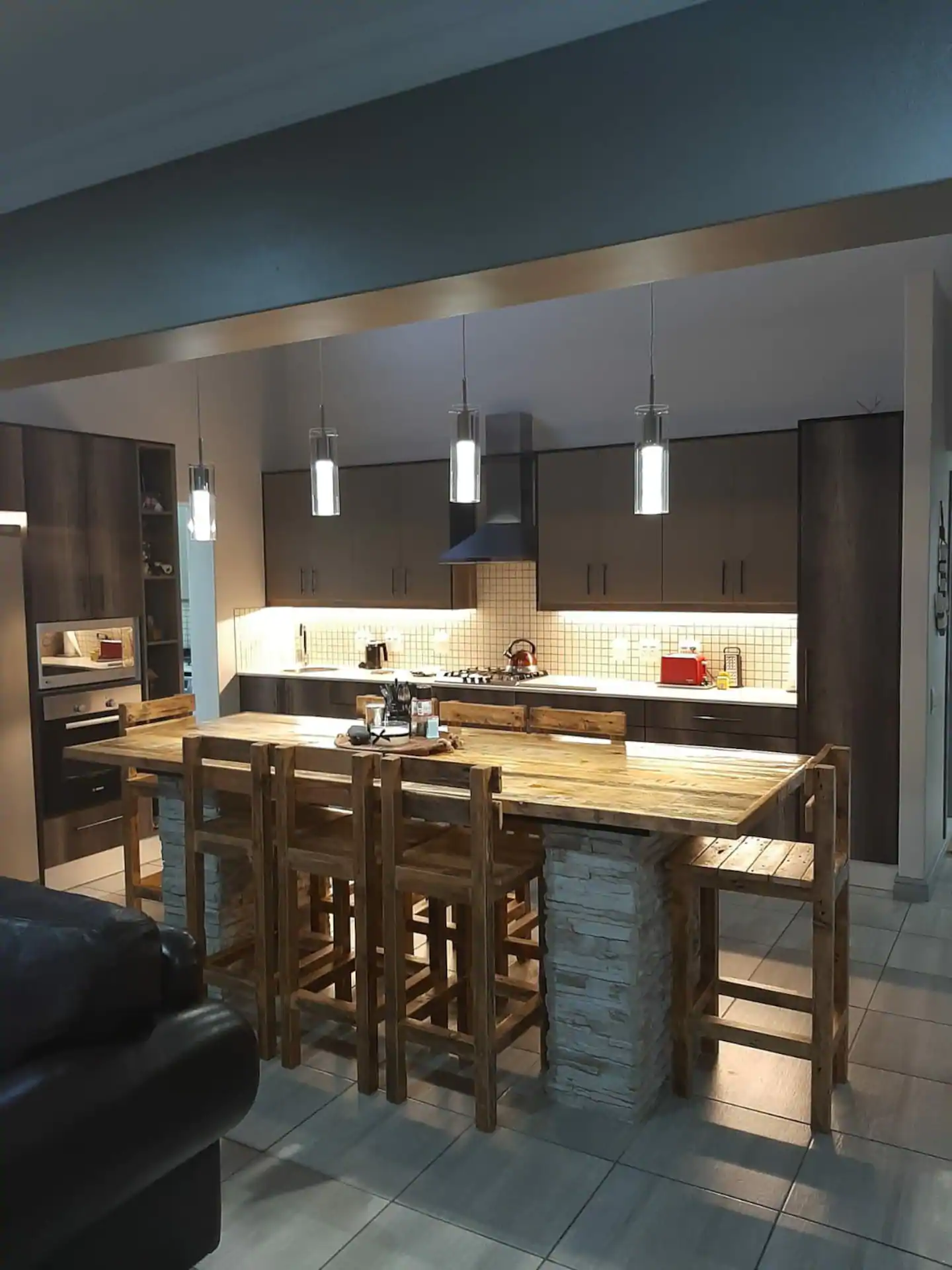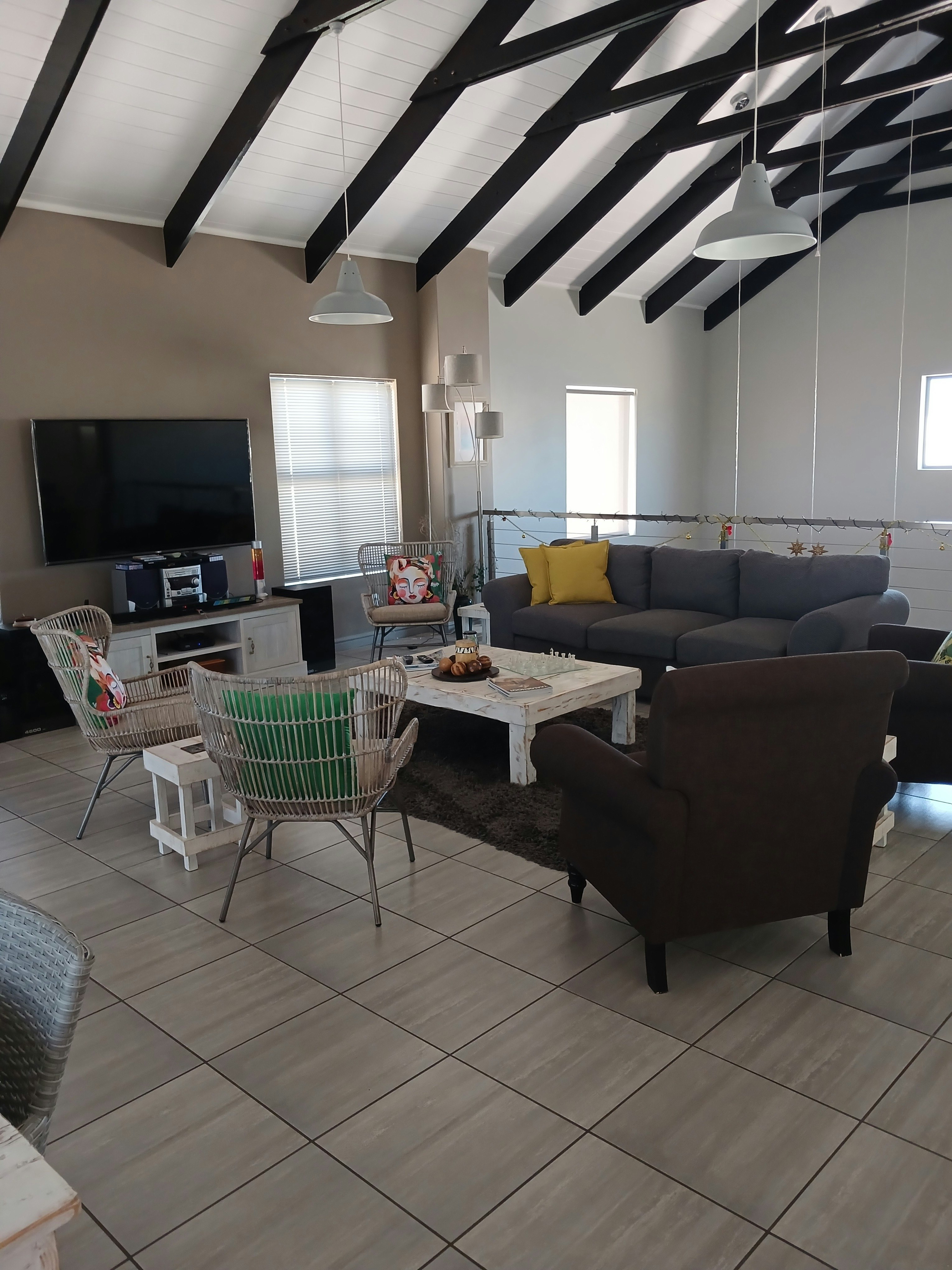 Downstairs, there is an open-plan kitchen, dining and living area. The kitchen is well-equipped for self-catering with a fridge, stove and oven, kettle, toaster, and a breakfast bar with stools. There is also a separate scullery. The dining area contains an 8-seater dining table and chairs and a built-in indoor braai. The lounge offers comfortable seating and a flat-screen TV.