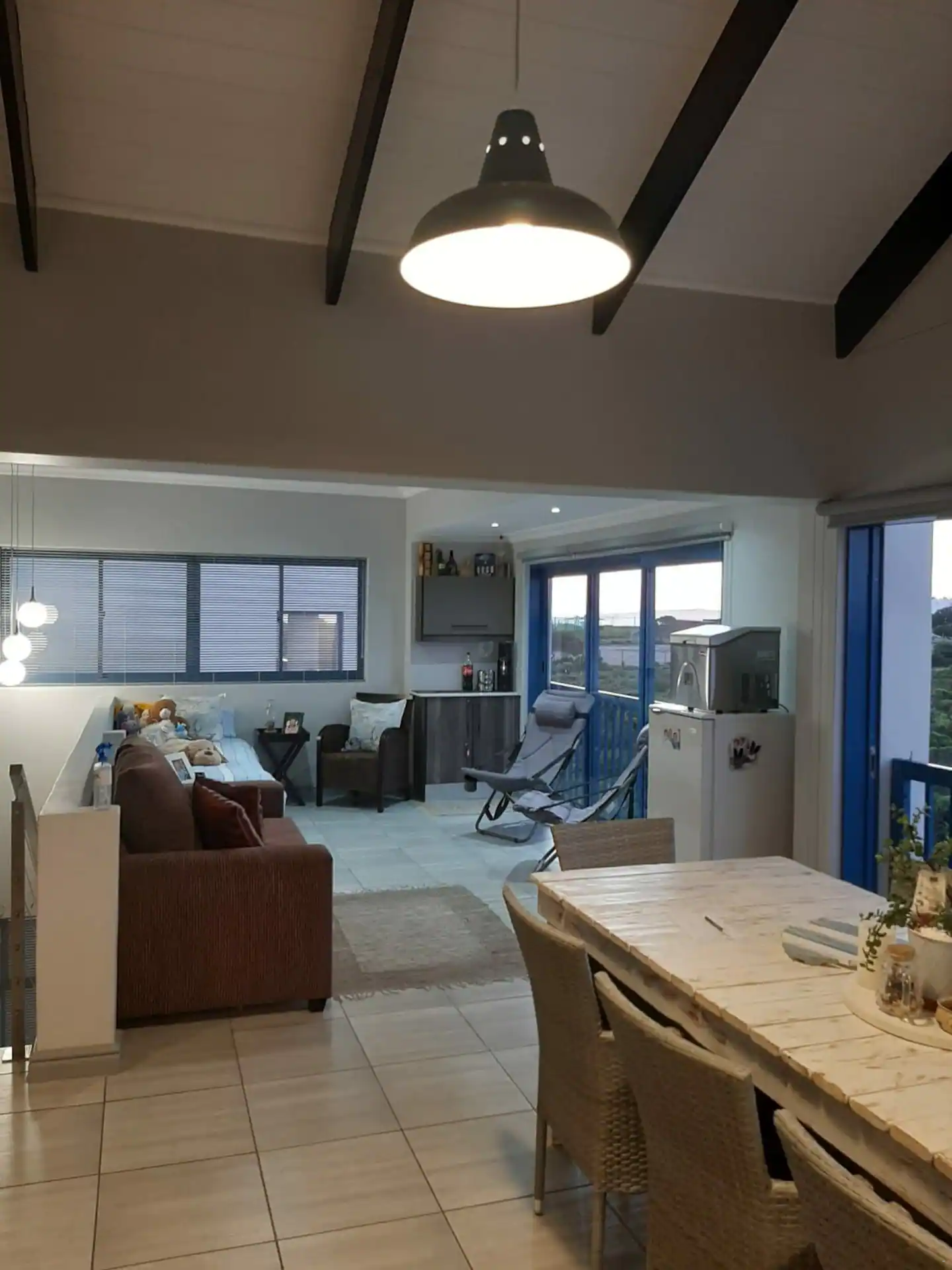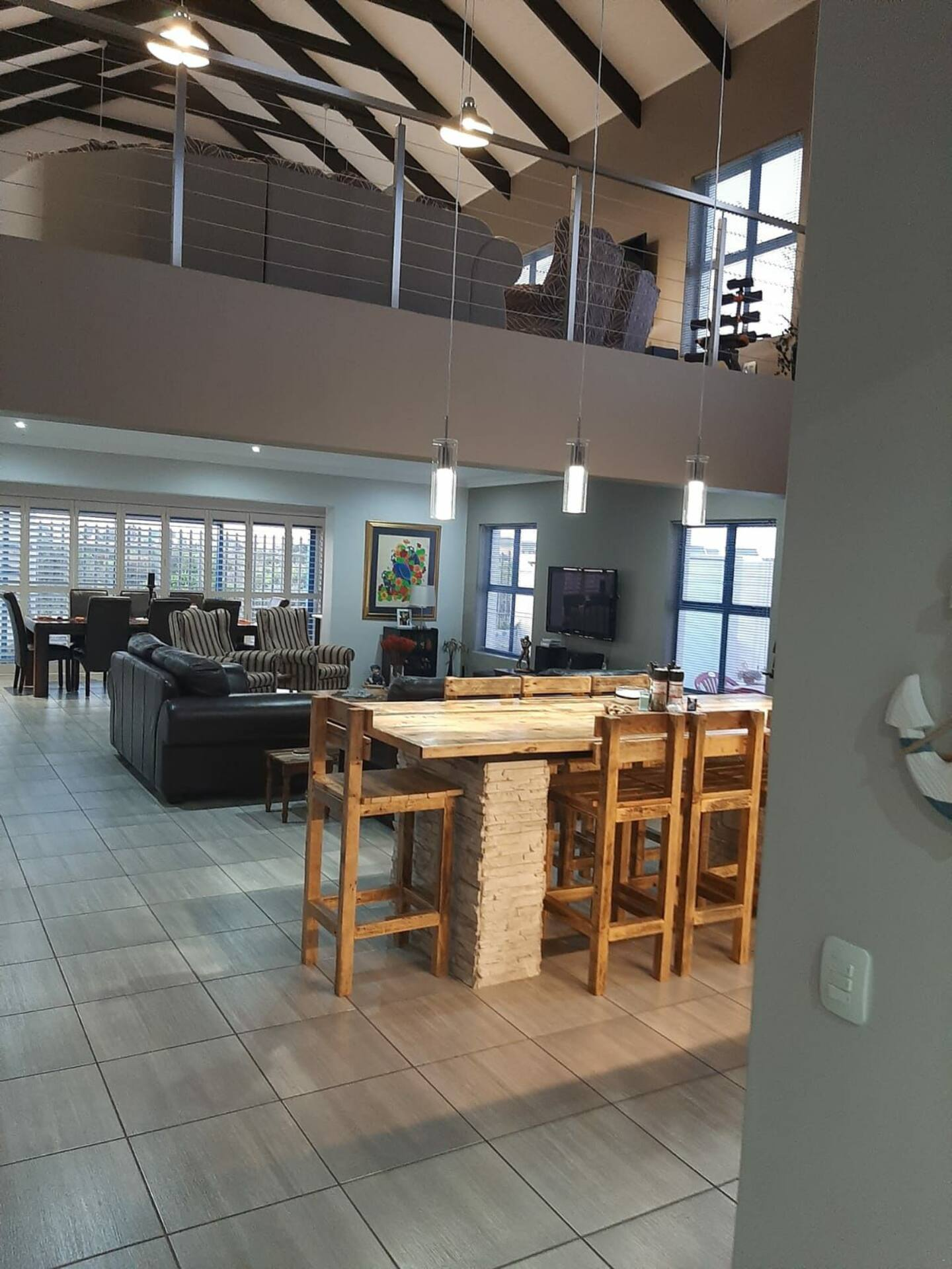 Upstairs, there is a second open-plan kitchenette, lounge and dining area. The kitchenette features a microwave, a fridge, and a breakfast bar with stools. The dining area contains an 8-seater dining table and chairs and a built-in indoor braai. The lounge area offers plenty of seating and a flat-screen TV. This level has sliding doors that open to enjoy the fresh air, and opens to a balcony.