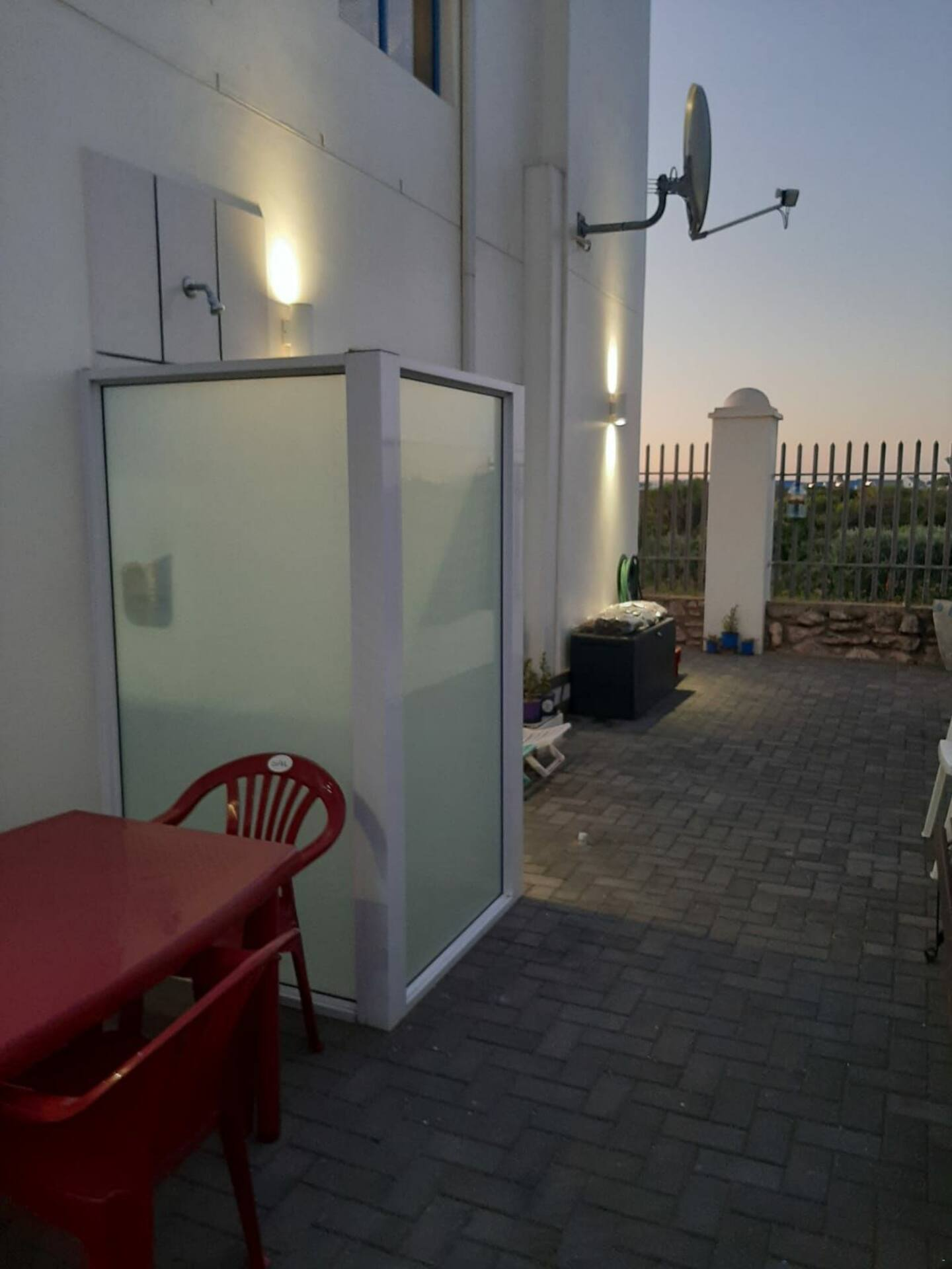 The house has an outdoor shower with hot and cold water to rinse off after a day at the beach.
