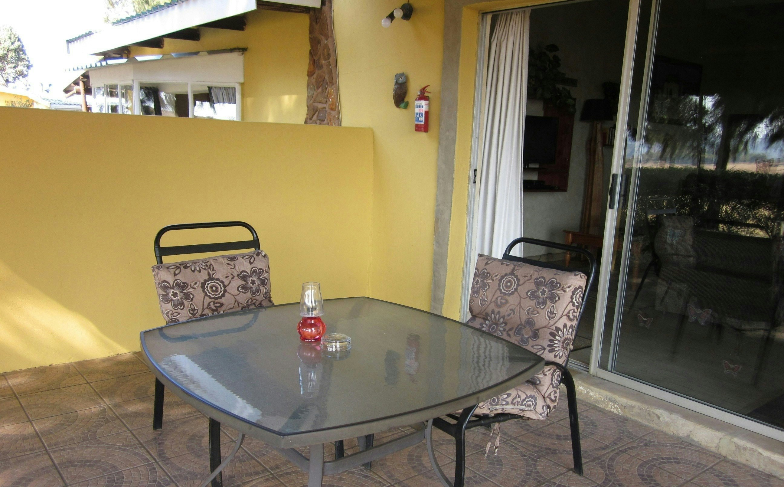 The unit opens onto a spacious patio with outdoor seating and a built-in braai, offering mountain views. The garden is fully fenced and secure parking is available. Guests have access to a communal swimming pool, thatched lapa, games room for those who enjoy darts or playing pool.