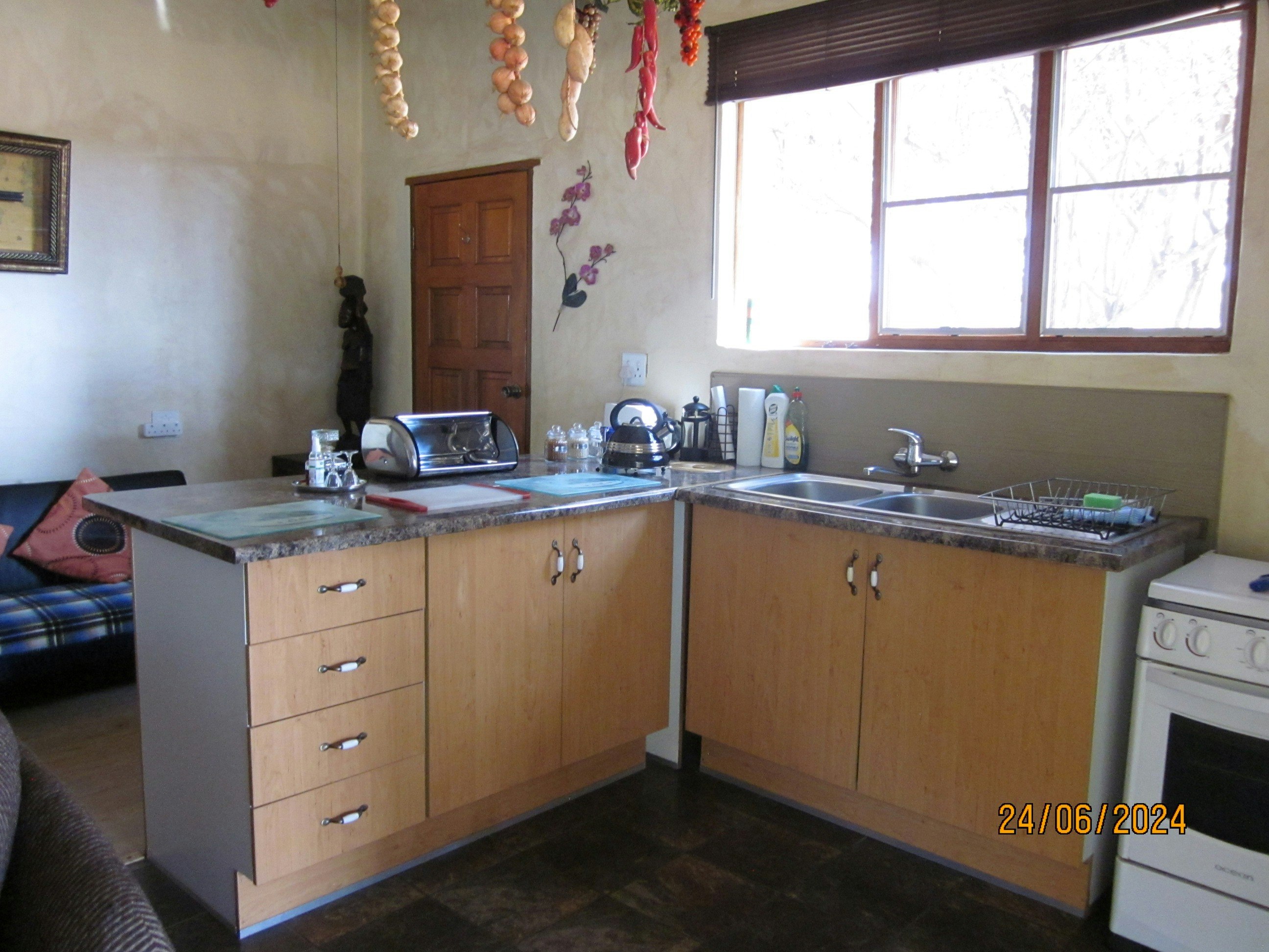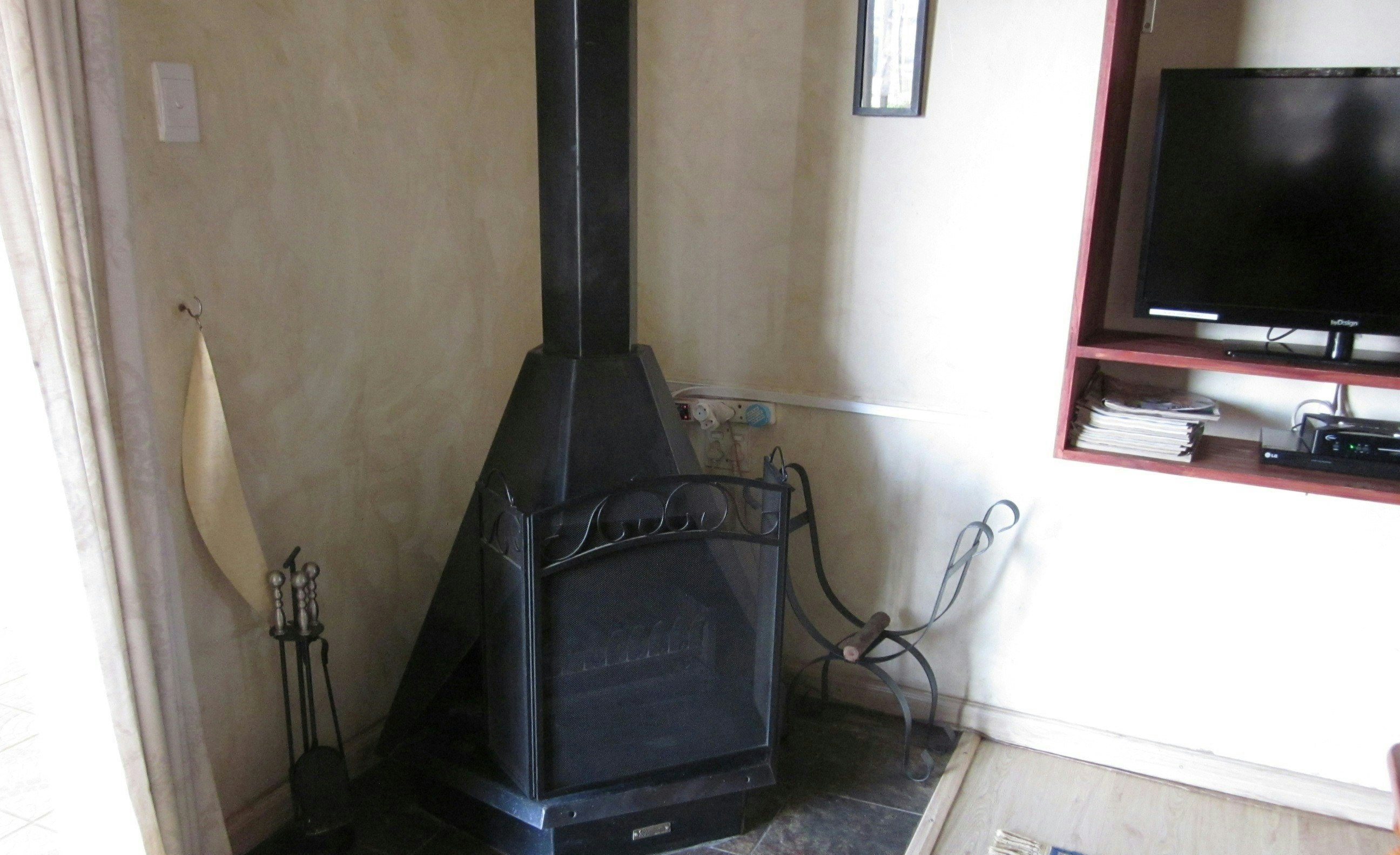 The unit features a well-equipped kitchen that includes a 4-plate gas stove, oven, microwave, kettle, toaster, cutlery, crockery, and fridge-freezer. The lounge and dining area has comfortable seating for guests to dine and relax and also boasts a fireplace. For guests' entertainment, a TV with selected DStv channels as well as a DVD player is available.