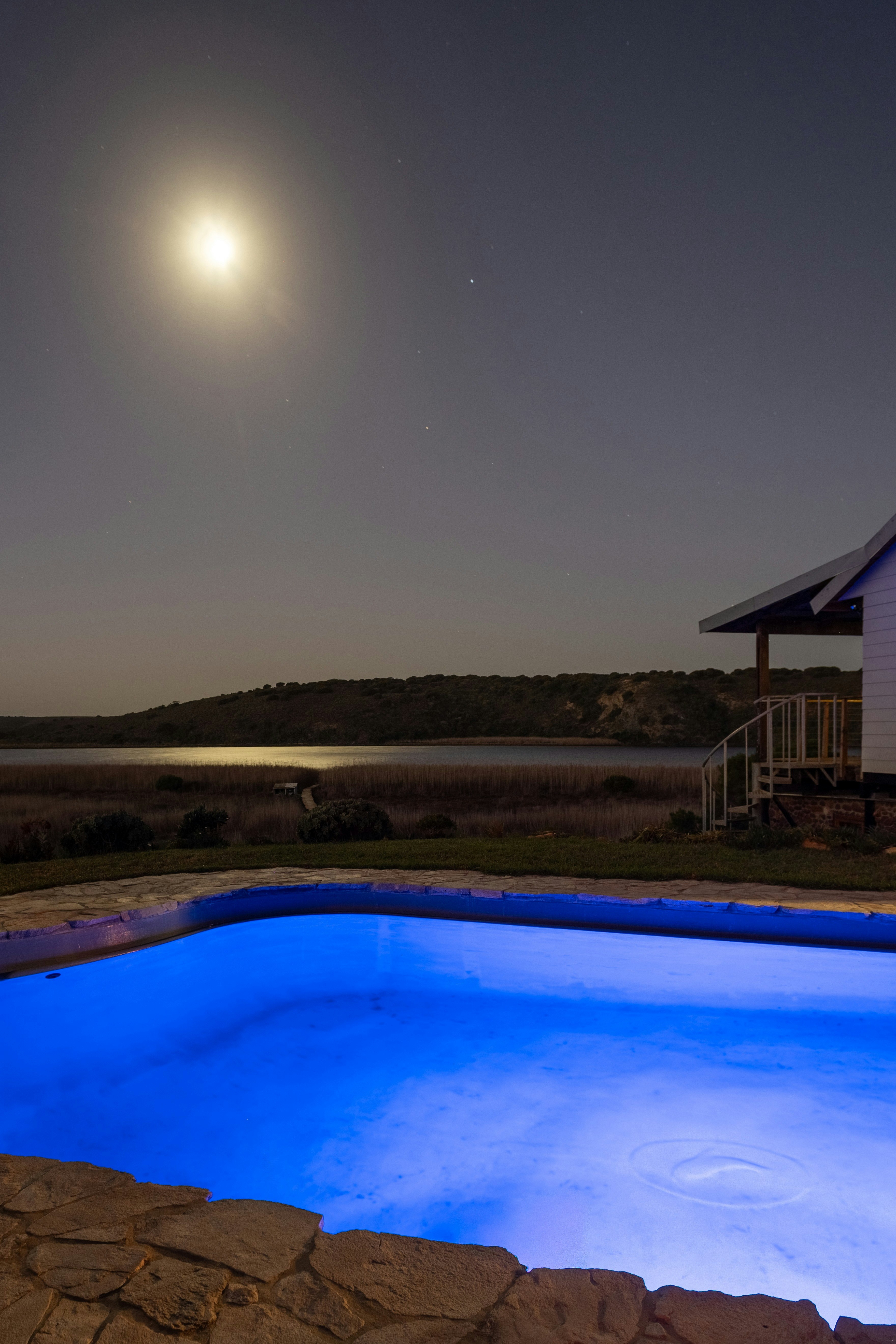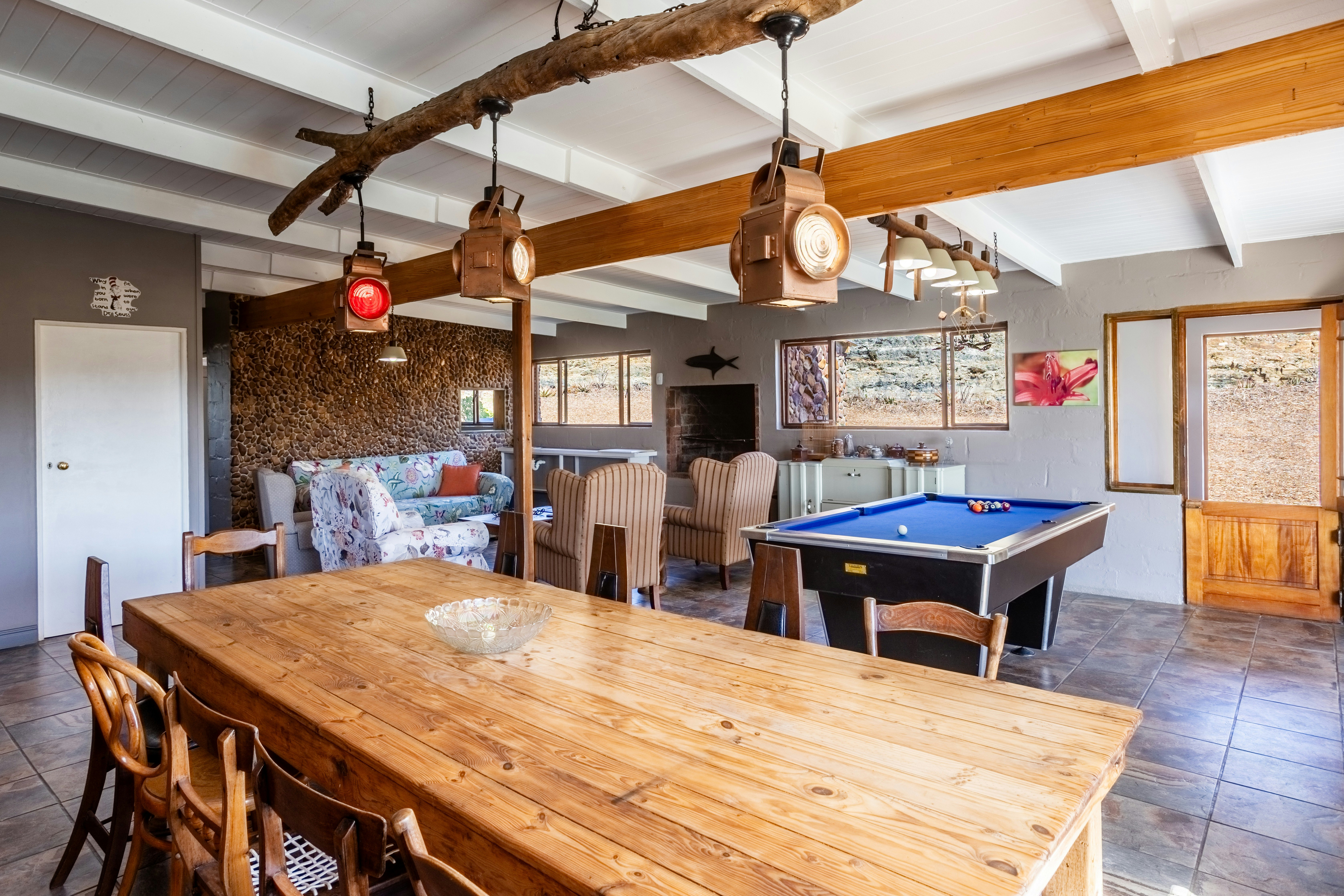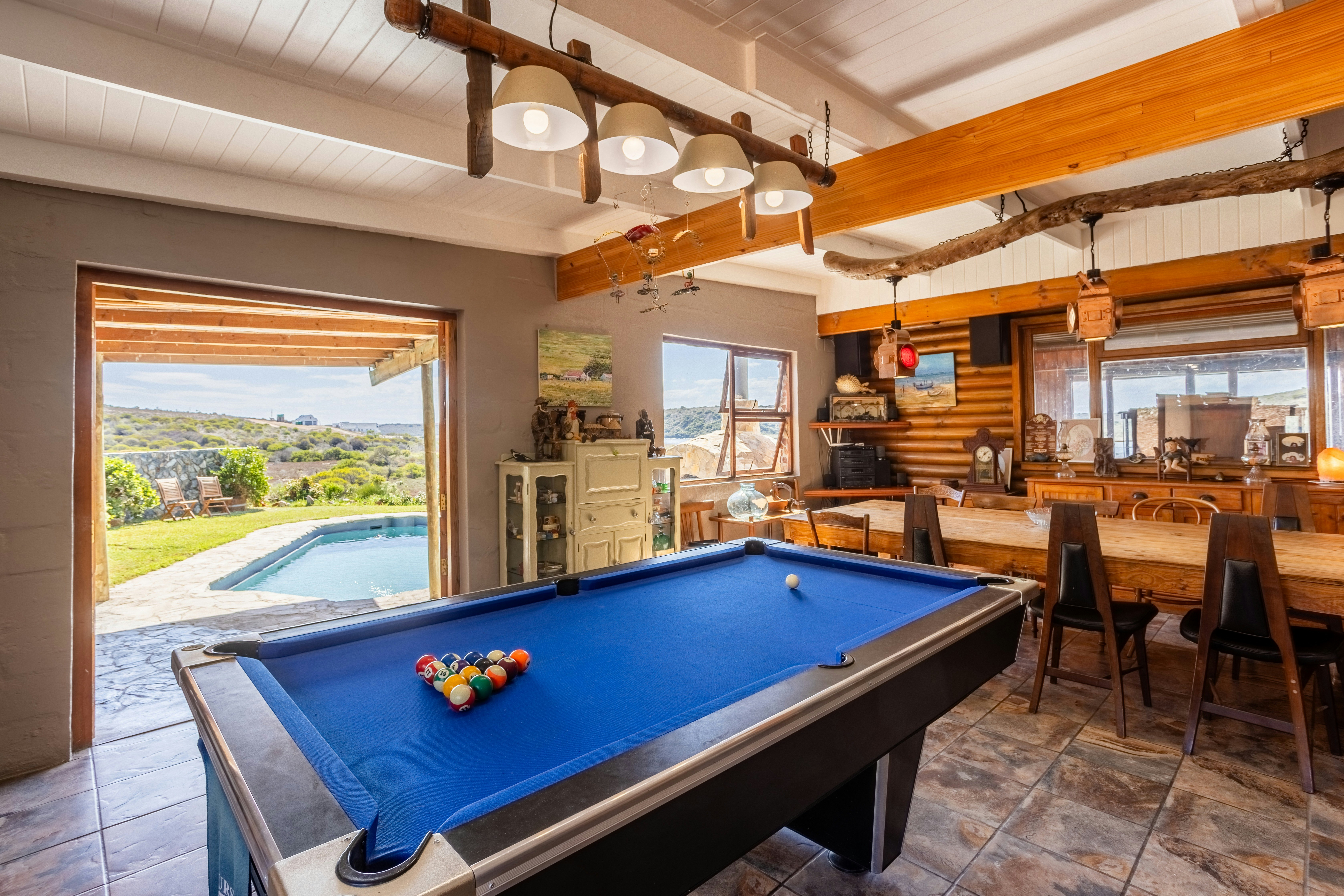 The kitchen is fully equipped for self-catering and includes a stove, oven, fridge-freezer, cutlery, and crockery. Set on 22 hectares, the property features a swimming pool, pizza oven, pool table, and both indoor and outdoor braai facilities. A shared jetty is available with the other house on the property.
