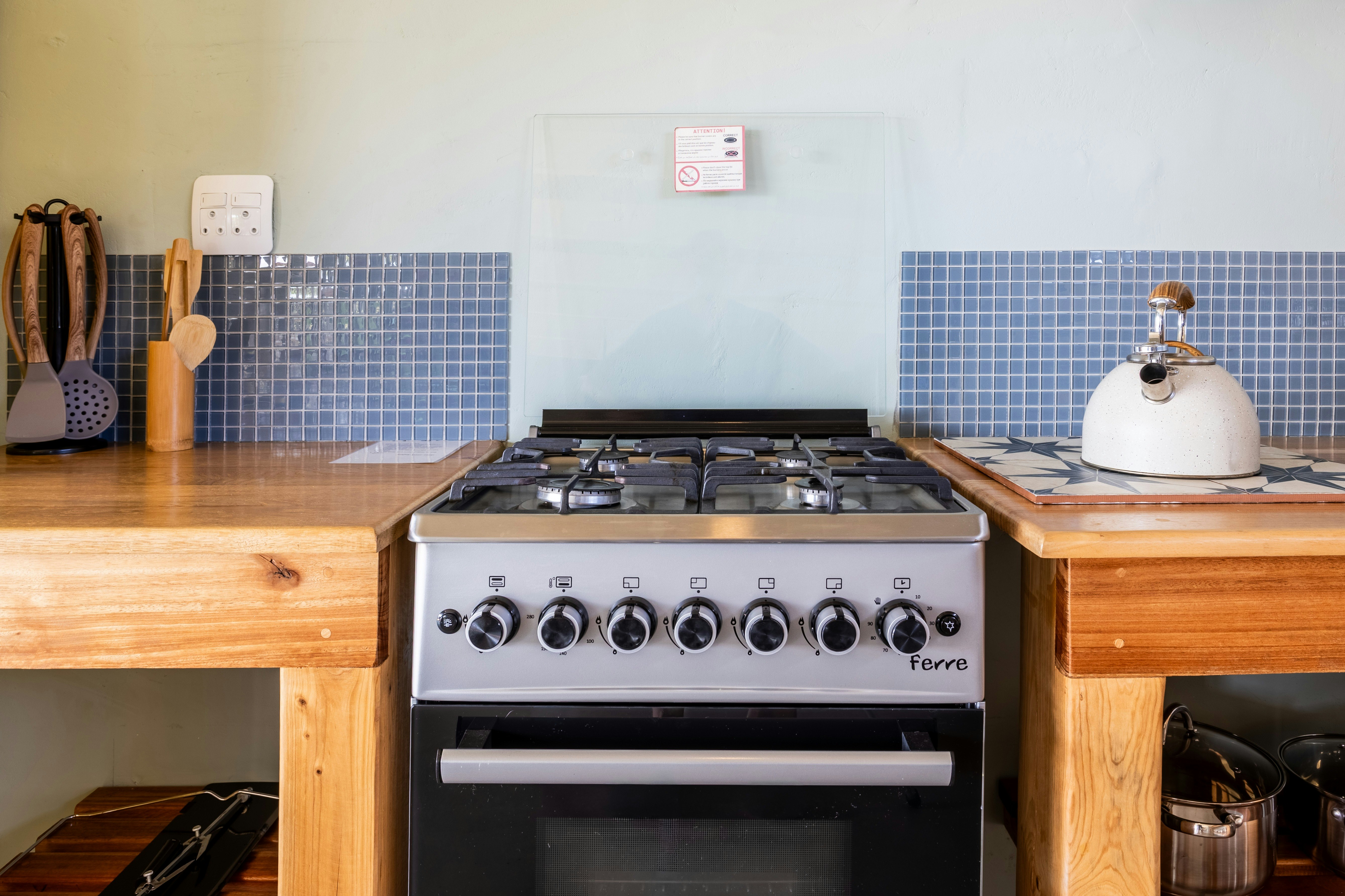 The kitchen is fully equipped for self-catering and includes a stove, oven, fridge-freezer, cutlery, and crockery. The living area features a dining table and comfortable seating.