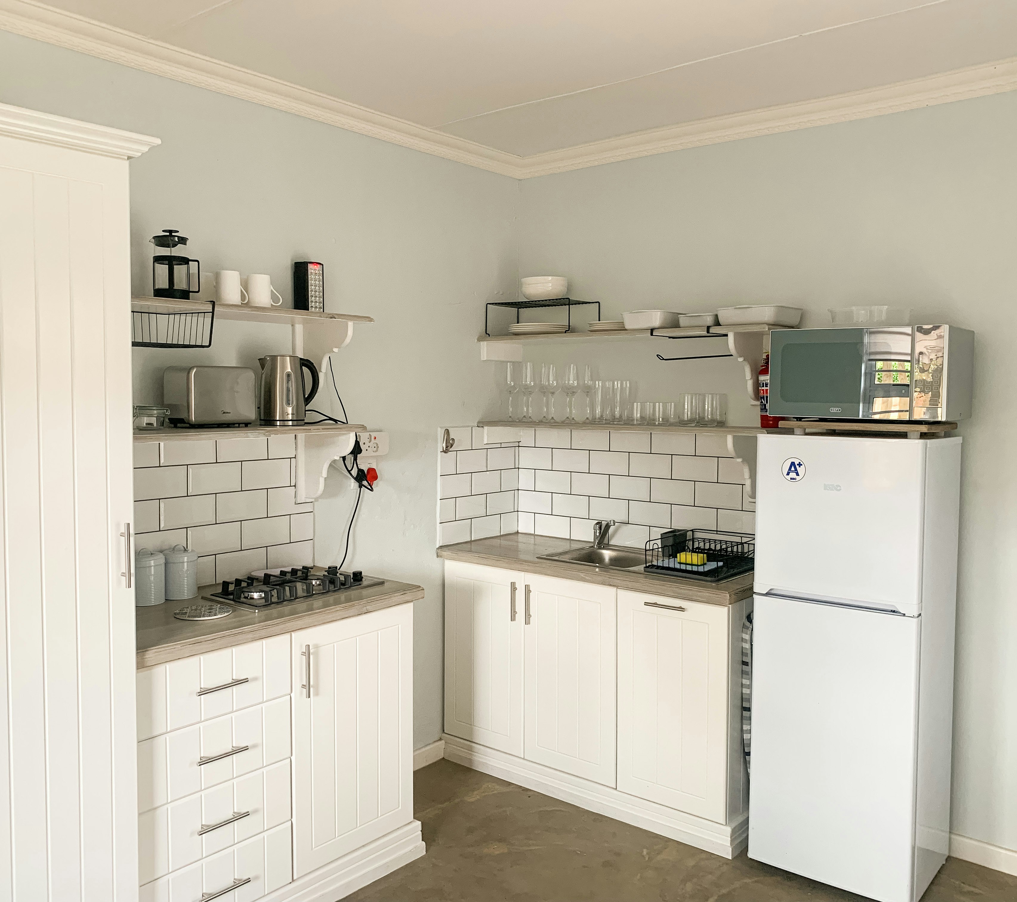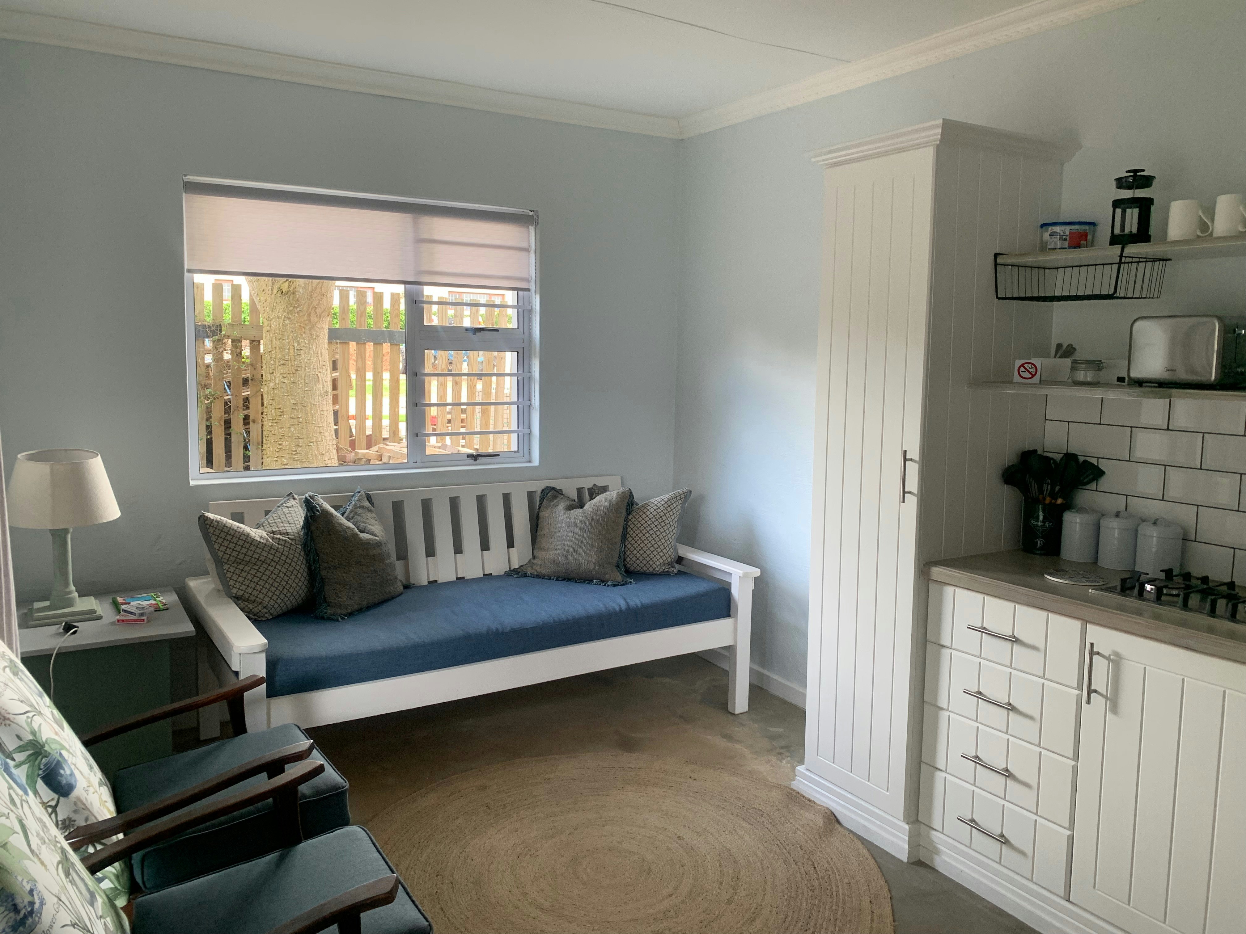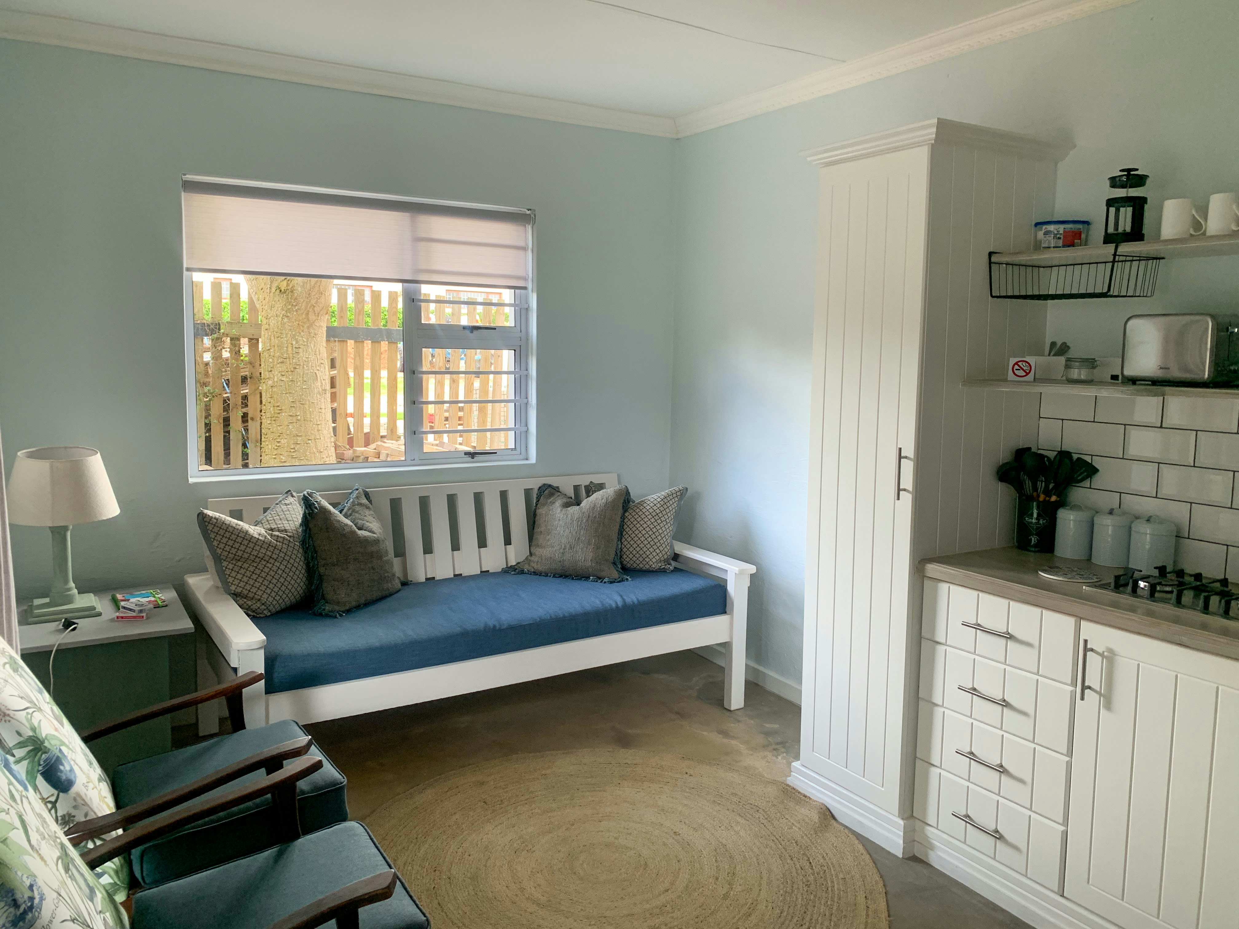 The open-plan kitchenette is equipped with a fridge-freezer, gas stove, oven, microwave, basic cutlery, crockery, and tea- and coffee-making facilities. It leads into the lounge area furnished with comfy couches and features a single sleeper couch for an extra person.